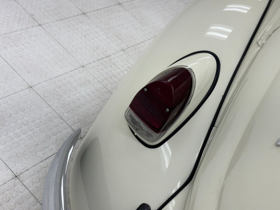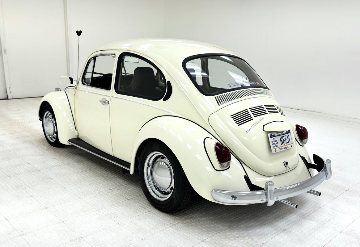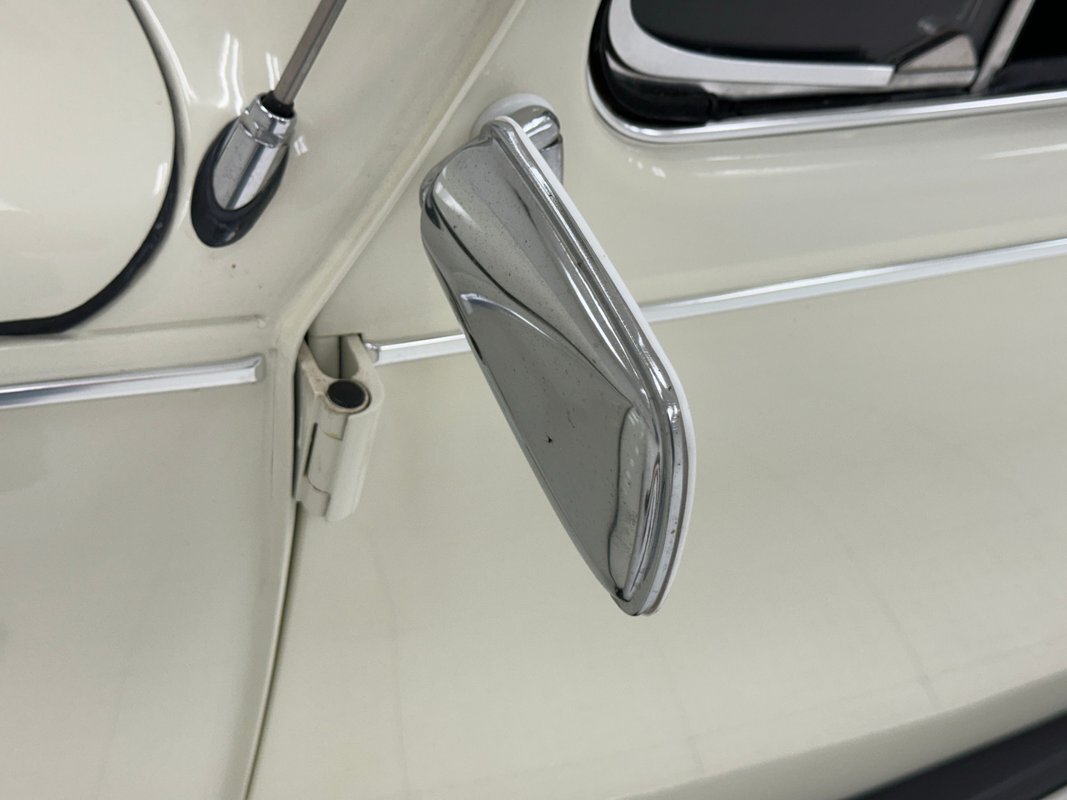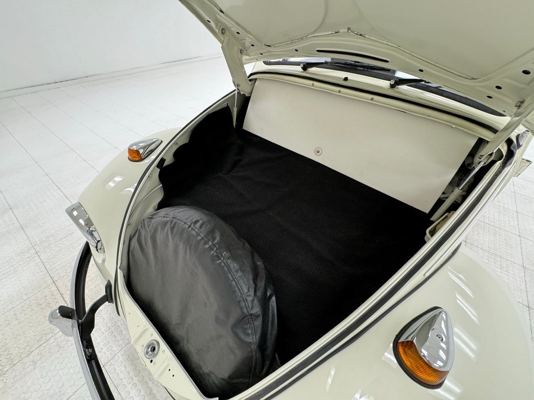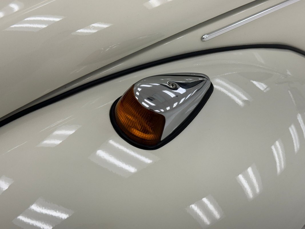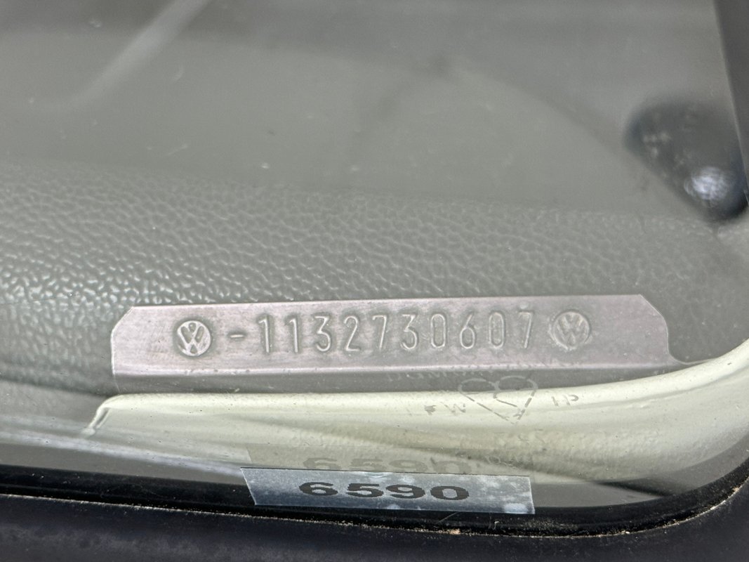 The front fenders are mated with earlier vintage rear fenders which instantly gives the car a unique shape and the bumpers, turn signals, and taillights are from an earlier model too. Once these parts were melded, the car received a paint job with Pastel White. The metal work including light rings, light housing, hubcaps, side mirror, side molding, and handles are all in wonderful shape and the paint coverage is fantastic. 15-inch staggered width steel wheels carry slightly staggered size tires with a late 2019 date code, and along with the black window frames, wipers, vents, and running board provide a nice contrast to the white. We could not find any glaring imperfection on the exterior of this fine bug.
