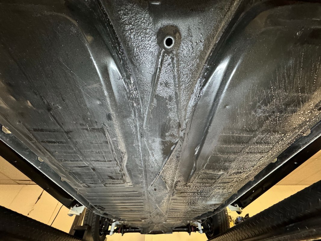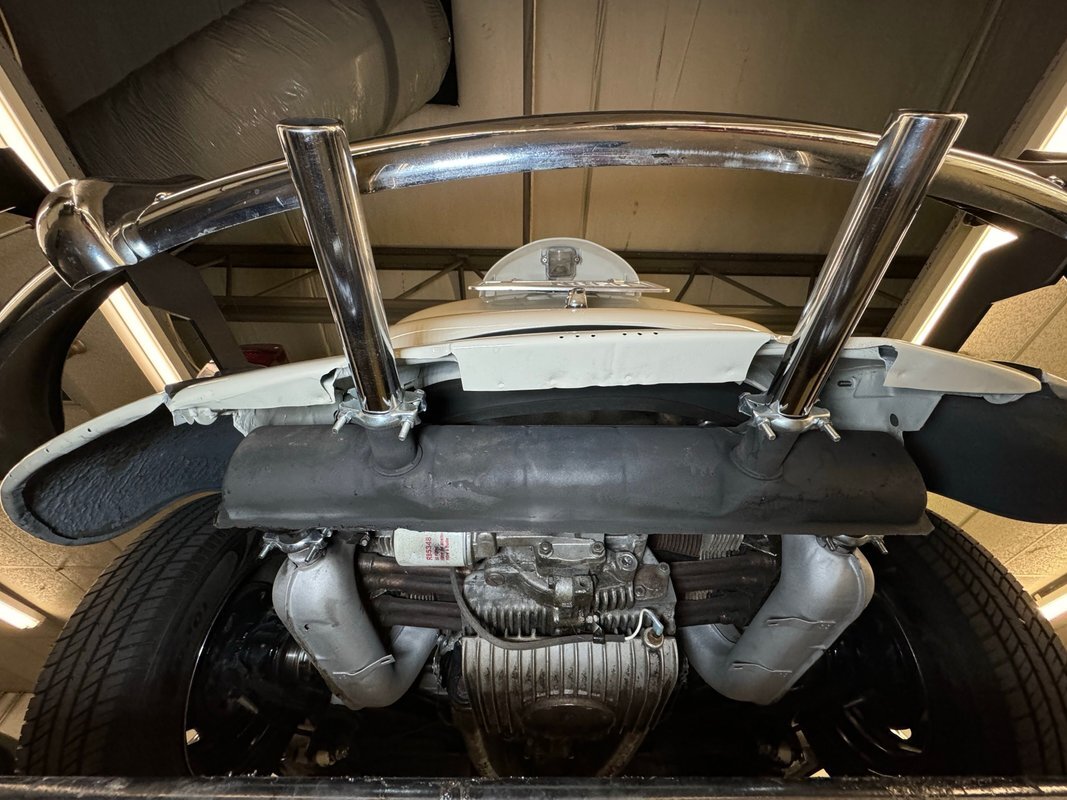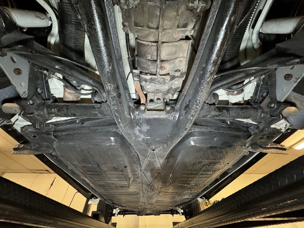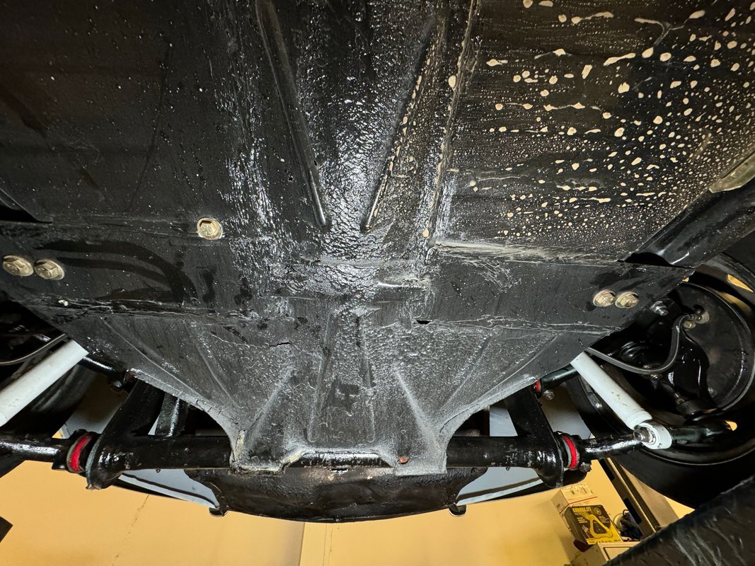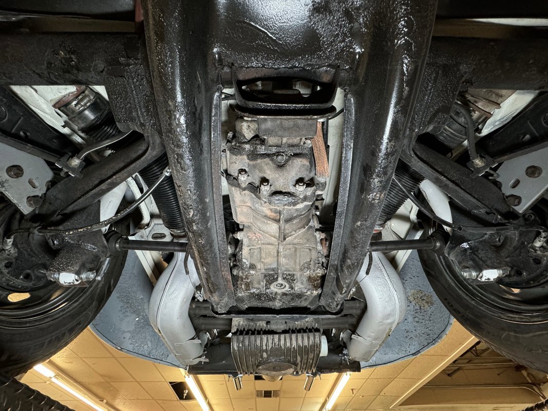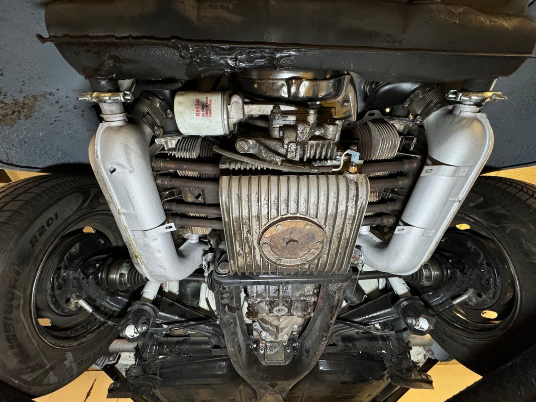 Lots of road spray on the belly pans but overall, the underside is relatively clean and free of rust or grease build up. We note some residual oil on the transmission pan and some curling and chipping paint on the inside of the fenders. The dual exhaust travels a short distance to a stock style muffler then exits almost immediately through chrome tailpipes. The lowered car operates on a suspension configuration of a transverse torsion bar in front, and a semi-trailing arm and torsion bar in the rear. Ball joints, tie rods, shocks, pan seals, Napoleon's hat, (front frame chassis support), lower spindles, rear axles, gas tank, fuel lines, oil sump, and both front pans are all on the list of newer items.