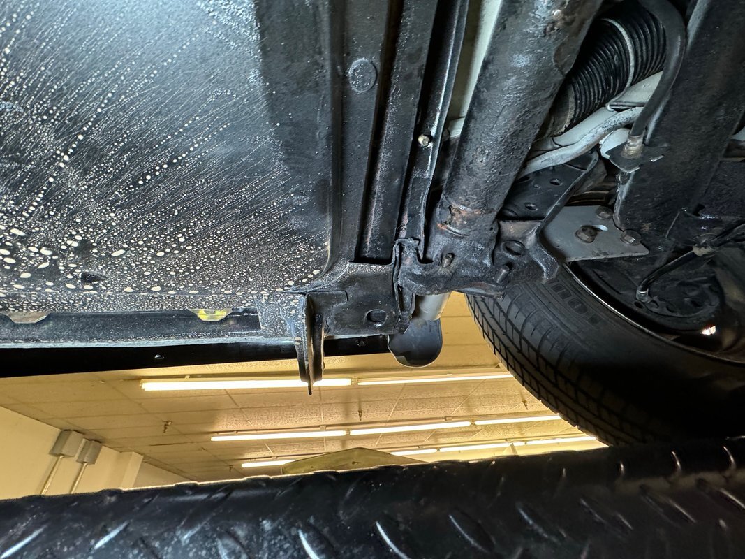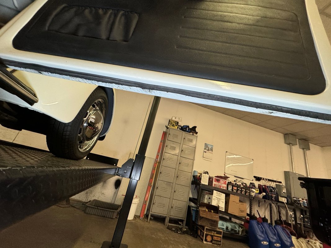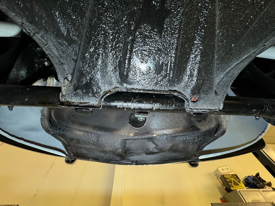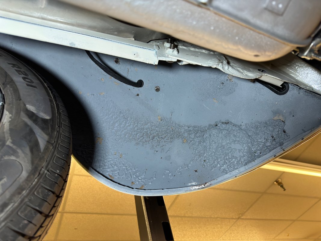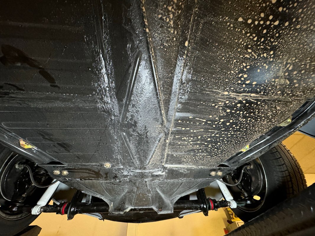 Lots of road spray on the belly pans but overall, the underside is relatively clean and free of rust or grease build up. We note some residual oil on the transmission pan and some curling and chipping paint on the inside of the fenders. The dual exhaust travels a short distance to a stock style muffler then exits almost immediately through chrome tailpipes. The lowered car operates on a suspension configuration of a transverse torsion bar in front, and a semi-trailing arm and torsion bar in the rear. Ball joints, tie rods, shocks, pan seals, Napoleon's hat, (front frame chassis support), lower spindles, rear axles, gas tank, fuel lines, oil sump, and both front pans are all on the list of newer items.