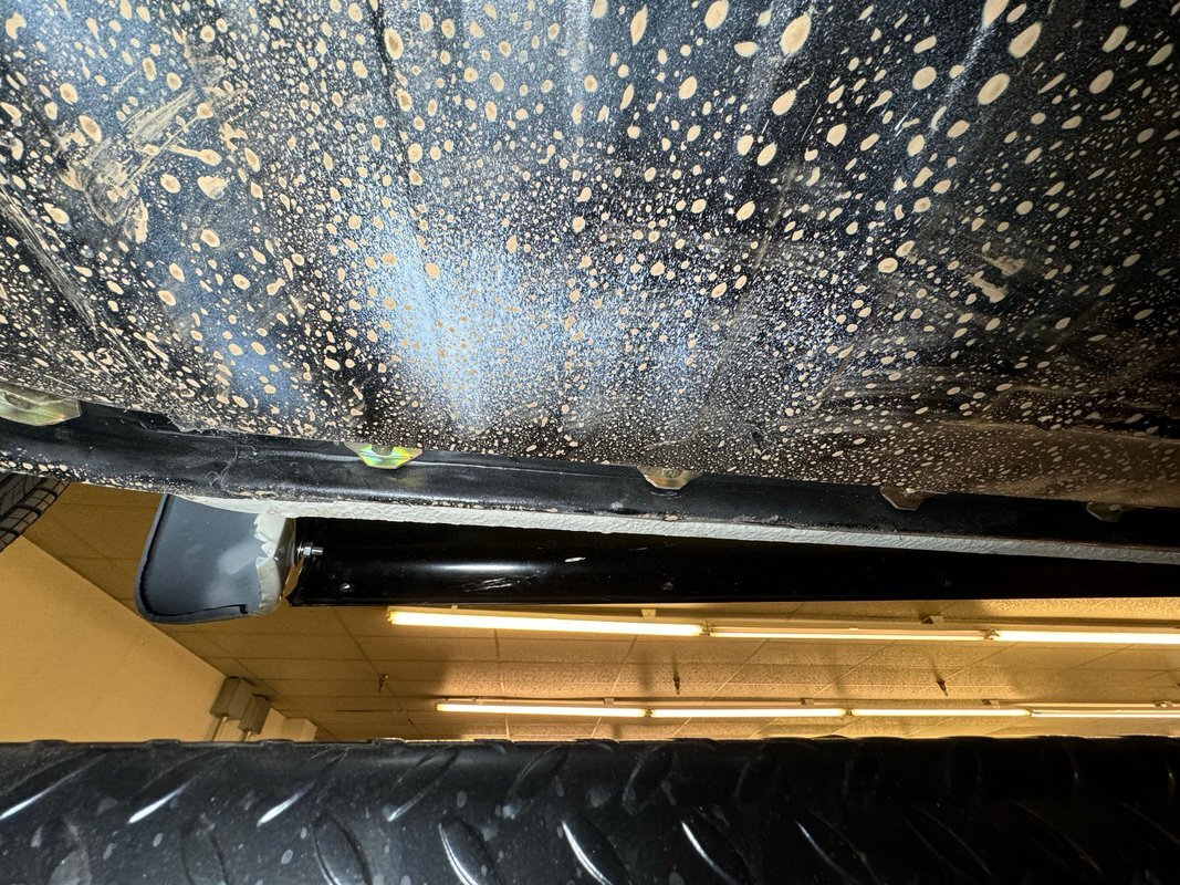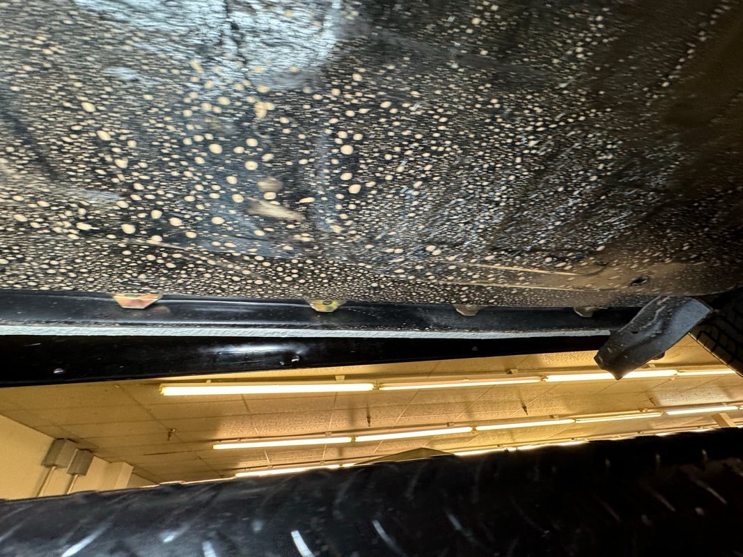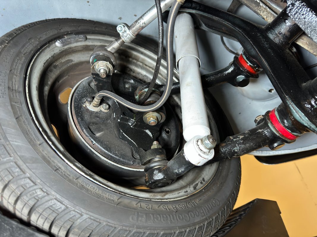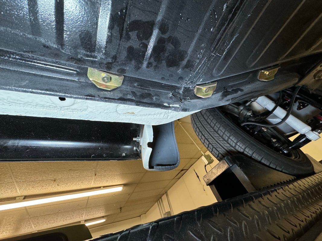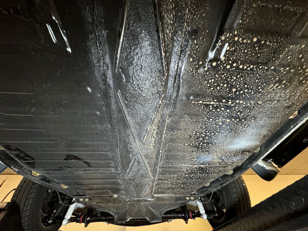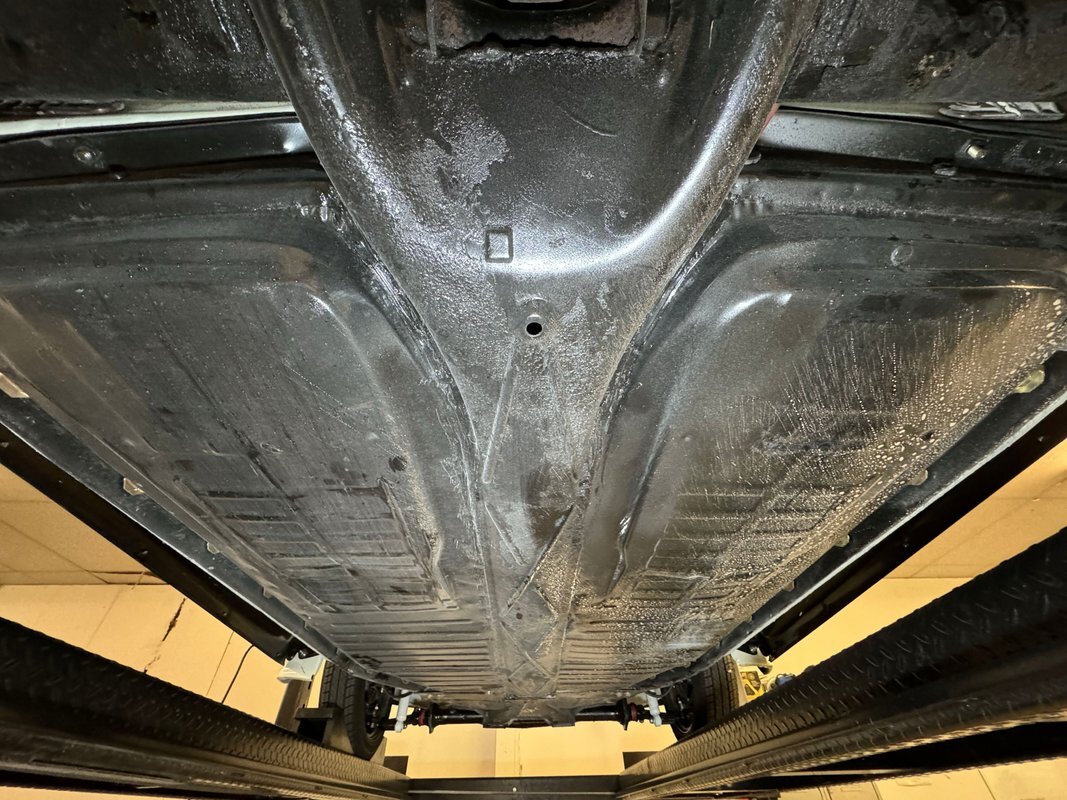 Lots of road spray on the belly pans but overall, the underside is relatively clean and free of rust or grease build up. We note some residual oil on the transmission pan and some curling and chipping paint on the inside of the fenders. The dual exhaust travels a short distance to a stock style muffler then exits almost immediately through chrome tailpipes. The lowered car operates on a suspension configuration of a transverse torsion bar in front, and a semi-trailing arm and torsion bar in the rear. Ball joints, tie rods, shocks, pan seals, Napoleon's hat, (front frame chassis support), lower spindles, rear axles, gas tank, fuel lines, oil sump, and both front pans are all on the list of newer items.
