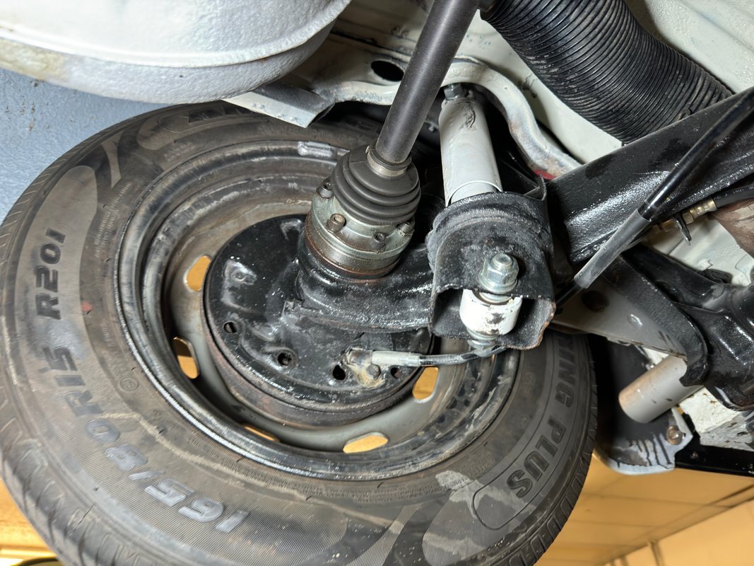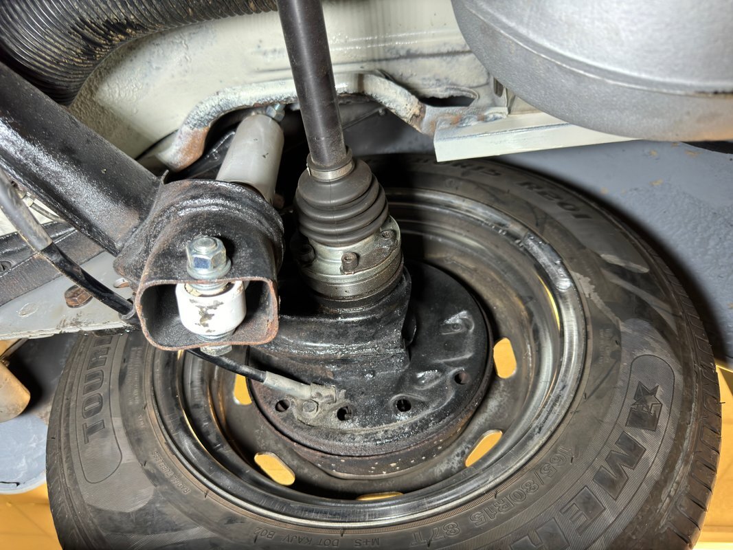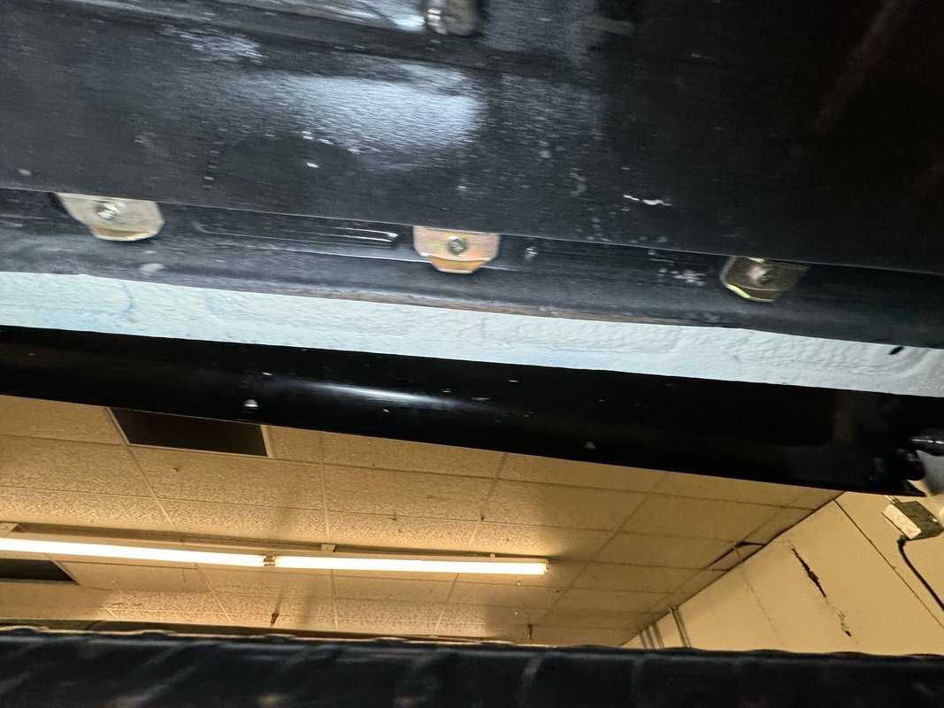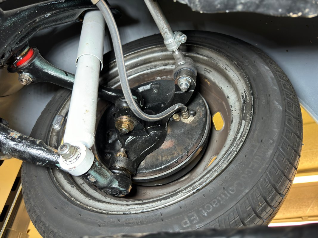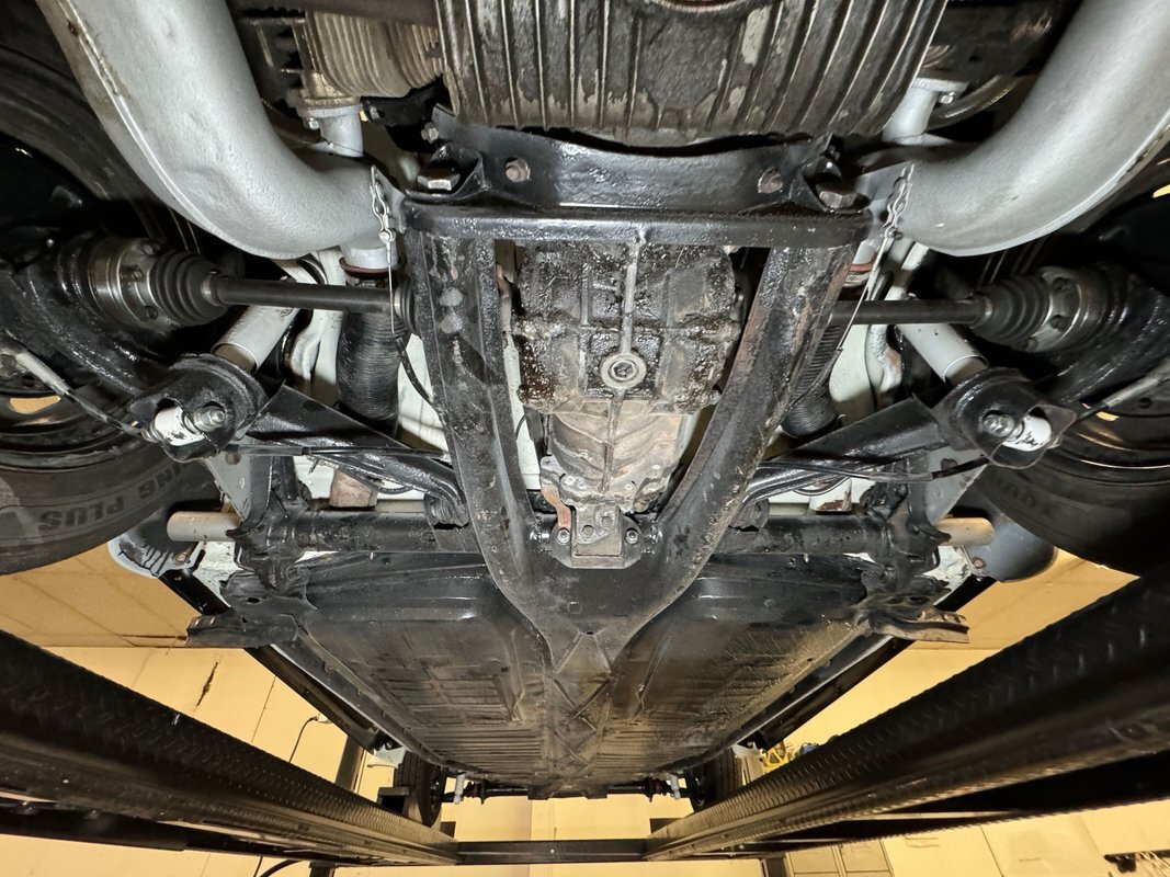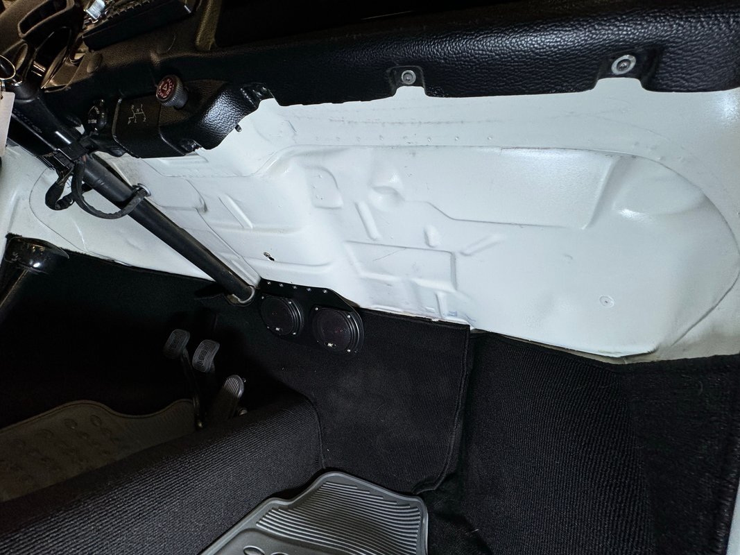 Lots of road spray on the belly pans but overall, the underside is relatively clean and free of rust or grease build up. We note some residual oil on the transmission pan and some curling and chipping paint on the inside of the fenders. The dual exhaust travels a short distance to a stock style muffler then exits almost immediately through chrome tailpipes. The lowered car operates on a suspension configuration of a transverse torsion bar in front, and a semi-trailing arm and torsion bar in the rear. Ball joints, tie rods, shocks, pan seals, Napoleon's hat, (front frame chassis support), lower spindles, rear axles, gas tank, fuel lines, oil sump, and both front pans are all on the list of newer items.