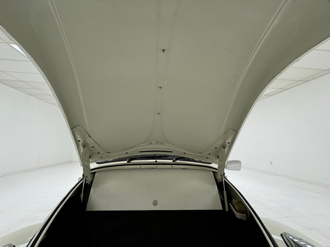 Door cards are on the list of items replaced and as such, these black vinyl examples are in unmarred condition and that carries over to the front bucket seats which are the tall back variety with weave pattern in black vinyl and the rear bench is virtually pristine. A glossy black steering wheel leads to a dashboard with a newer pad, and a gauge cluster that now includes gauges for oil pressure, water temp, volts, and a tachometer for RPMs. The modern radio provides AM/FM/CD and the glove box door veers from the plastic dash with glossy black paint. A shifter is floor mounted and surrounded by newer square weave carpet in great condition and the cabin is topped with a perforated vinyl headliner that is also newer and excellent. The front trunk is lined in black carpet and is clean.