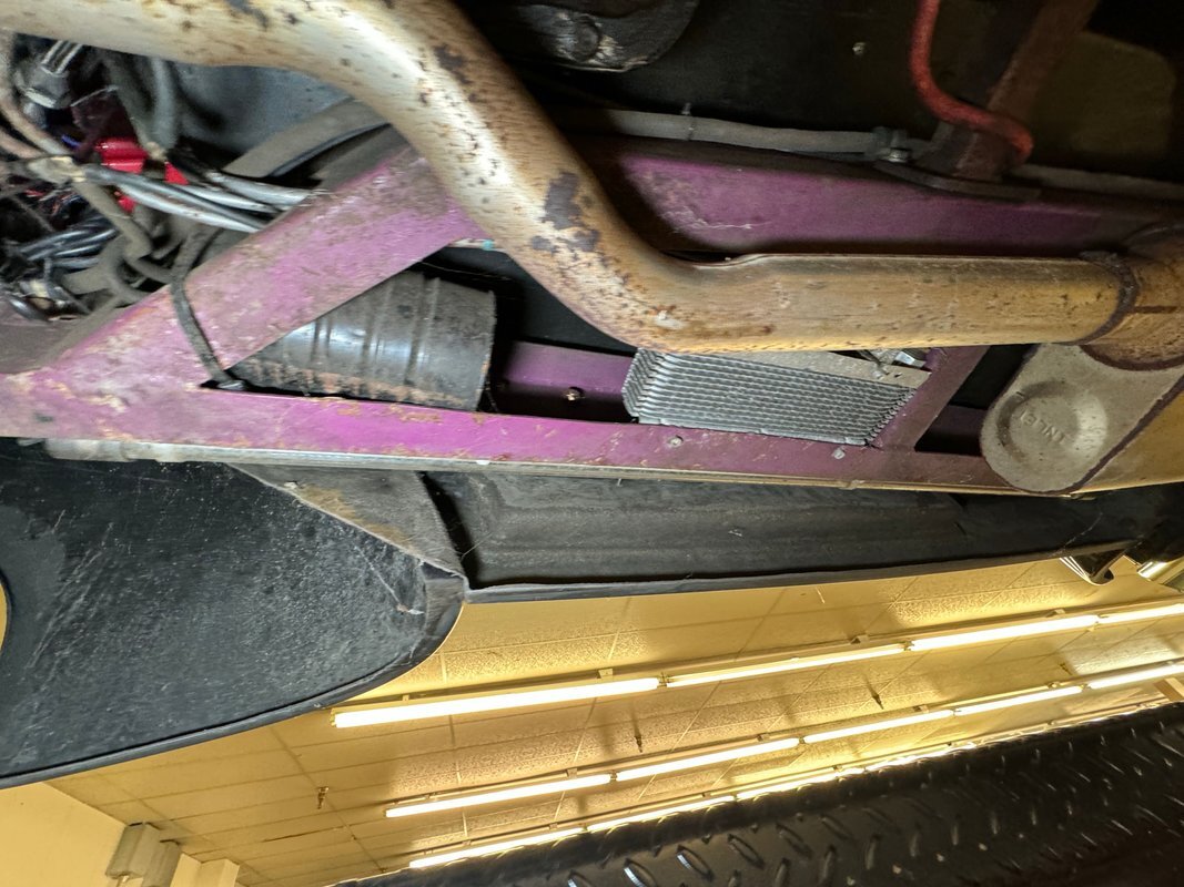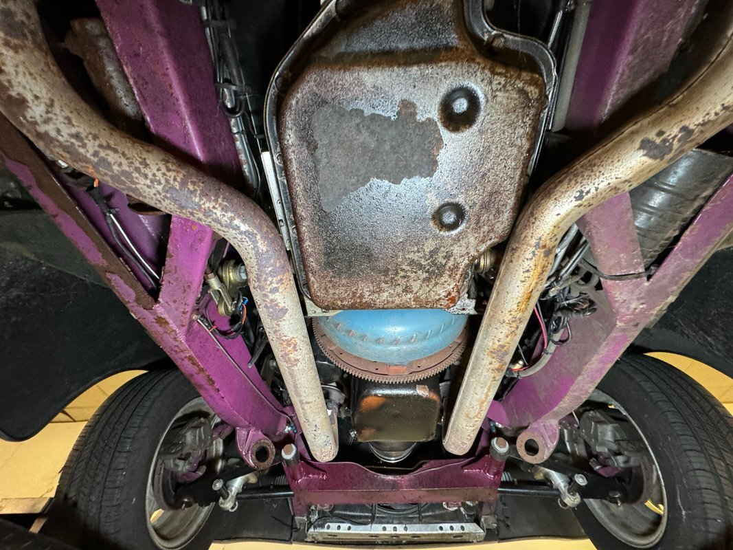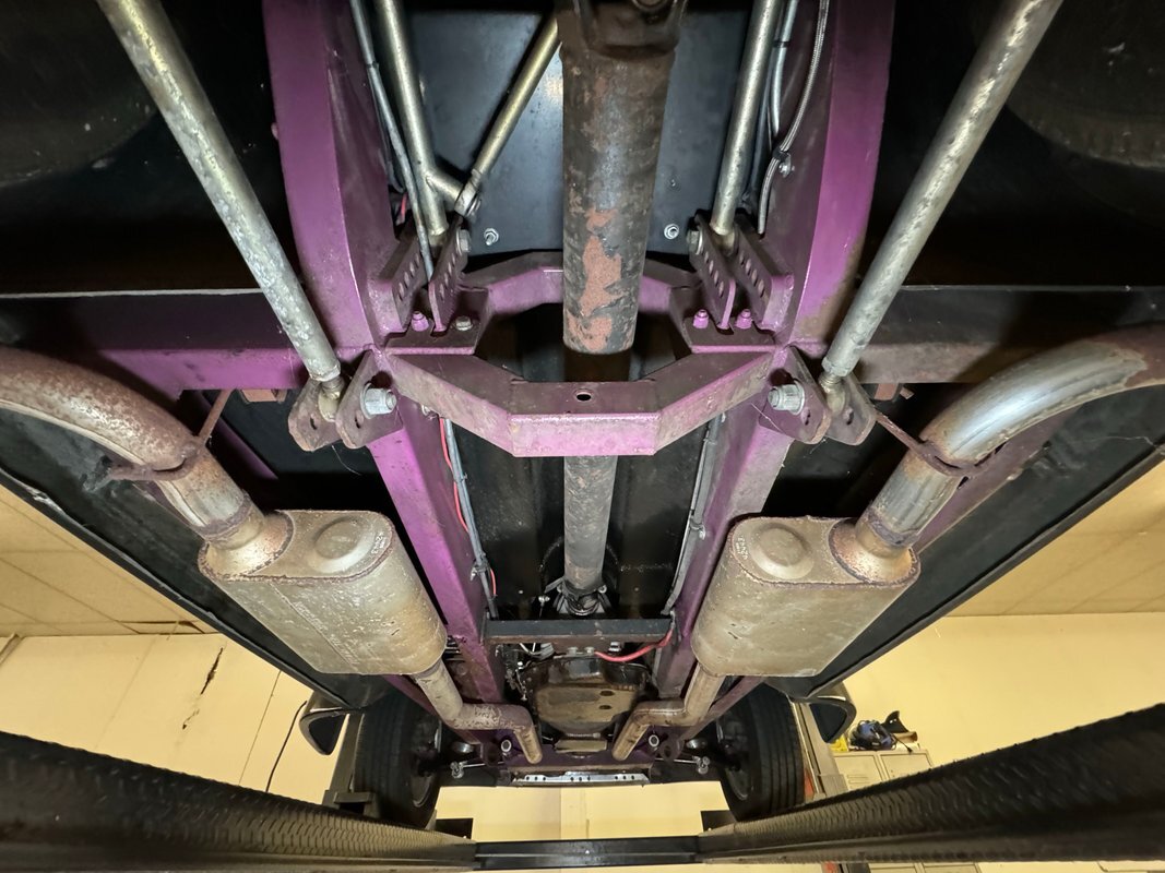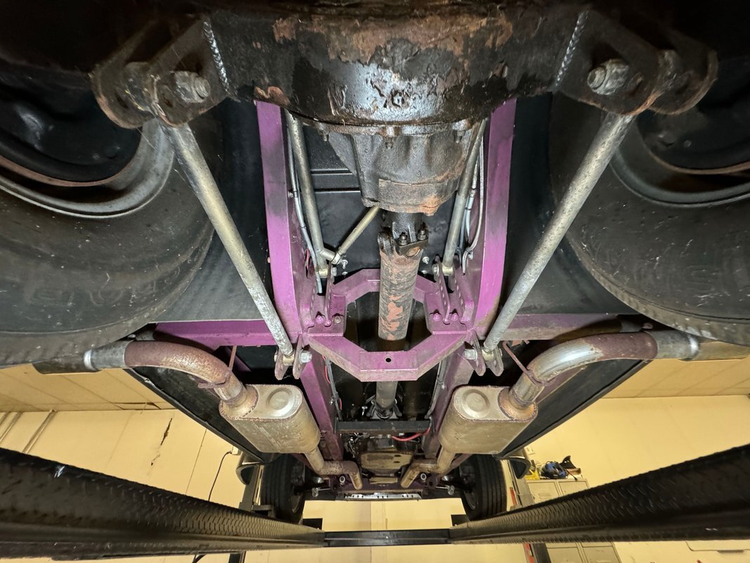 The boxed tube frame is painted purple on the underside that can best be described as driver quality. There's some surface rust around and some chipping purple paint, but not a build up of grease and grime or leaks are to be found. The dual exhaust flows into a pair of mufflers and then heads out the sides via chrome tips. Suspension consists of airbags at both ends with ladder bars augmenting the rear. The rear axle has been narrowed and the fat tires take up serious real estate in the back of the car.