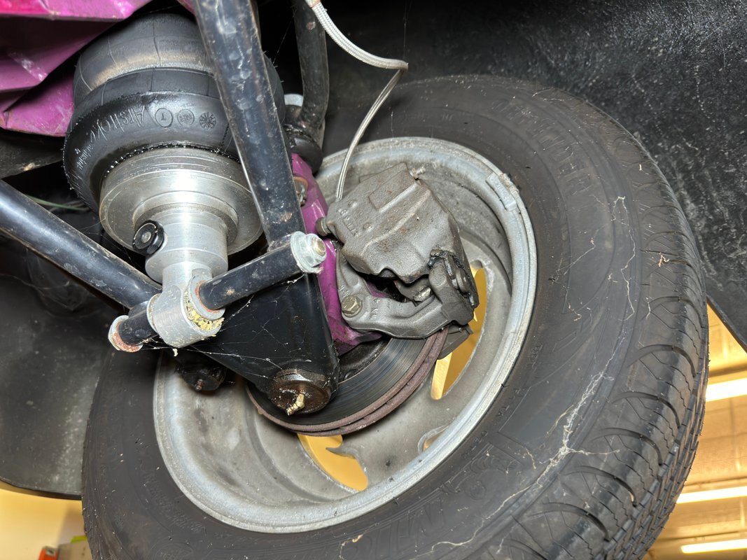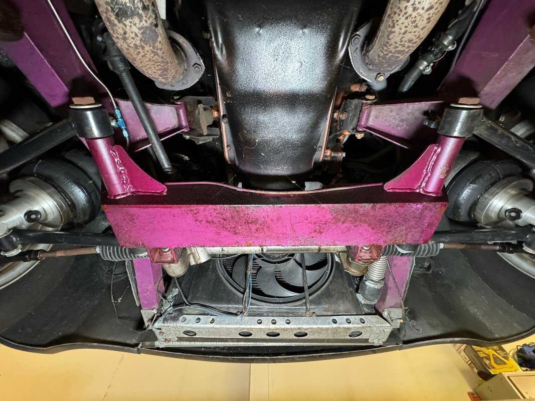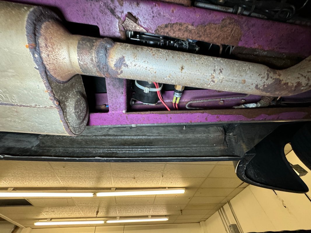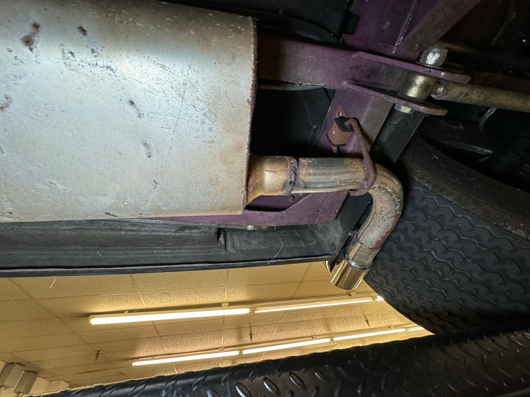 The boxed tube frame is painted purple on the underside that can best be described as driver quality. There's some surface rust around and some chipping purple paint, but not a build up of grease and grime or leaks are to be found. The dual exhaust flows into a pair of mufflers and then heads out the sides via chrome tips. Suspension consists of airbags at both ends with ladder bars augmenting the rear. The rear axle has been narrowed and the fat tires take up serious real estate in the back of the car.