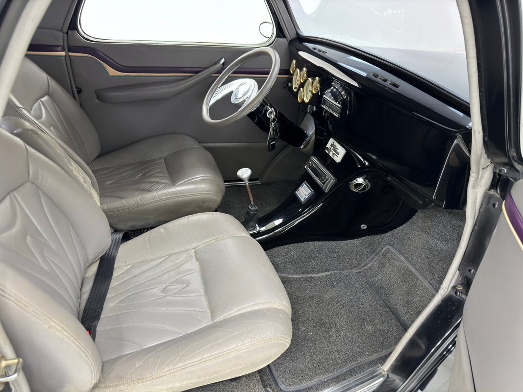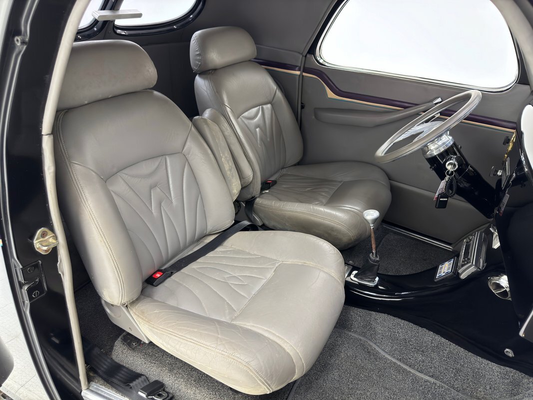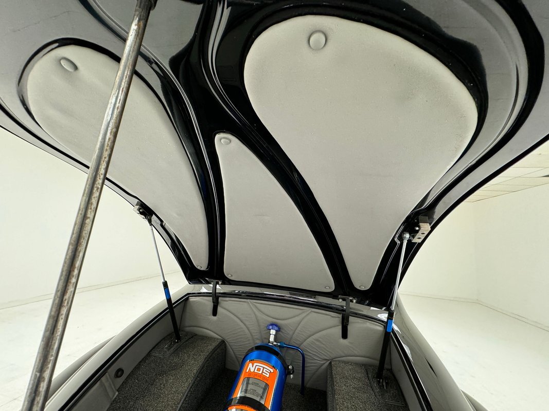 A tri colored leather graphic stripe spans the doors and flows to the back walls, all on a background of gray leather. A Willys "W" is cleverly stitched in the seat inserts of the tall bucket seats in gray leather with headrests and armrests on the inside. A wings style steering wheel is a familiar mod and fronts a glossy black dashboard filled with gold rimmed retro style VDO gauges for an attractive presentation. The center of the inky dash has a small A/C control panel, an AM/FM/CD player, and a digital monitor for the Air Ride suspension. A Lokar shifter rises from the floor, showing some patina on the shaft, and electric window toggles fall just behind it. Low pile gray carpet covers the floor with matching mats and the headliner is taut and gray. The trunk houses the inner fender wells and a bottle of nitrous, lined with the same gray carpet and stitched leather walls. The inside of the trunk lid is also dressed with gray leather fill pieces.