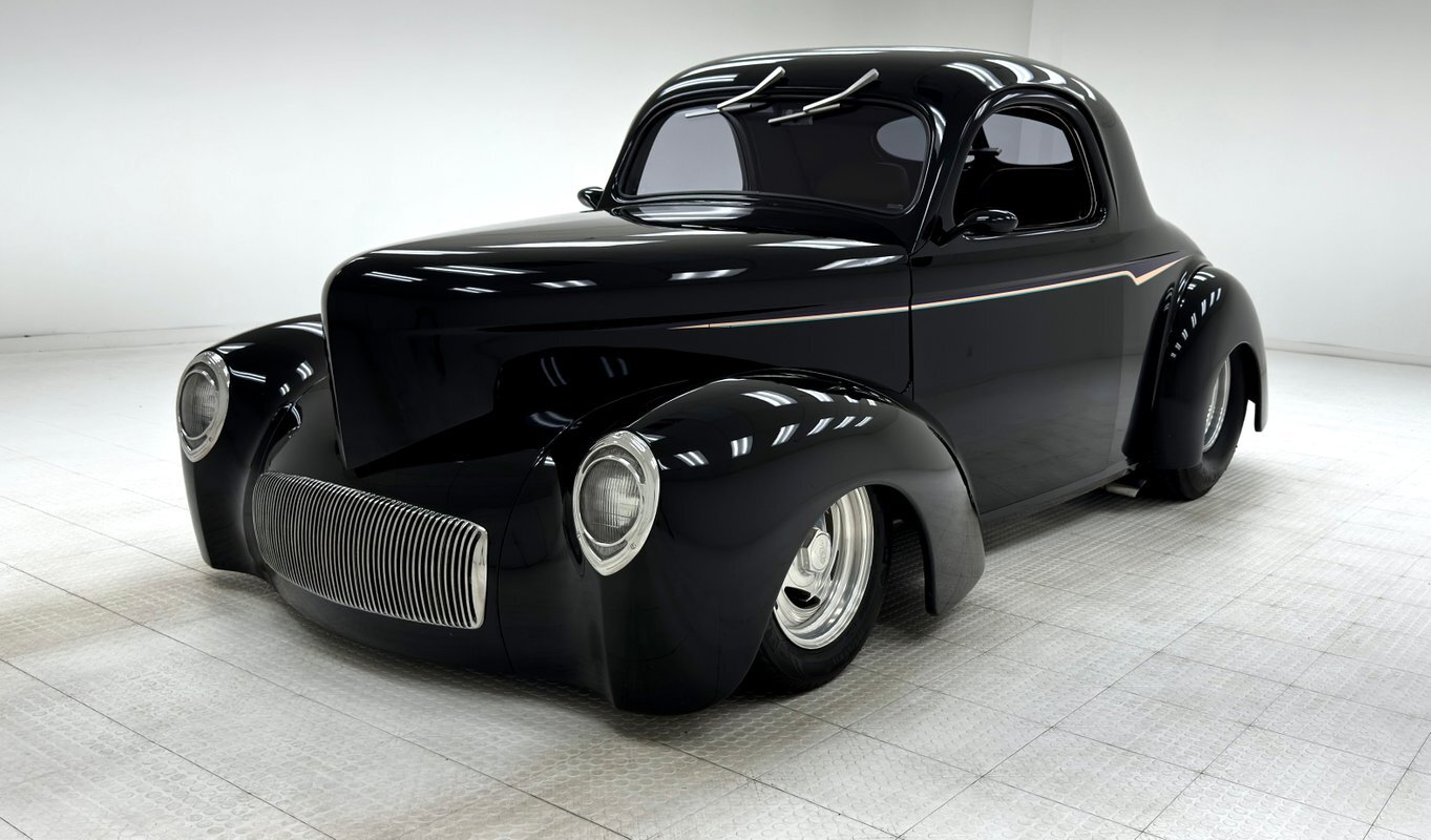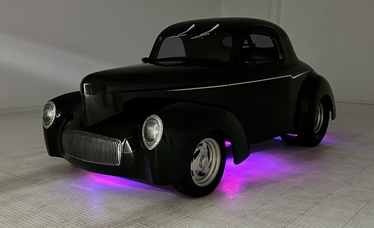 For consignment, a 1941 Willys 441 coupe with a full street rod treatment. Tubbed rear, shaved handles, flush mounted lights, air ride suspension, a fiberglass body, and some neon flash underneath. The paint reflects like a mirror finish and no stone has been unturned on the top side of this high end build.