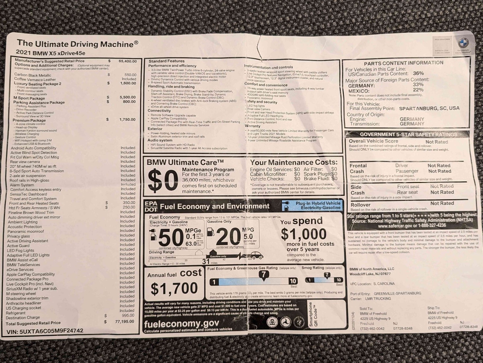 Gorgeous 2021 BMW X5 45e PHEV. Clean title. No accident LOW mileages. Original warranty until 11/30/2024. Exterior carbon black metallic. Interior coffee vernasca leather. M-SPORT package. PREMIUM Package. LUXURY SEATING package (front seats with ventilation and message). For details please check the window sticker below.