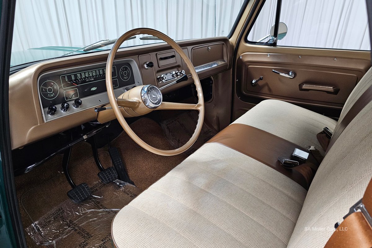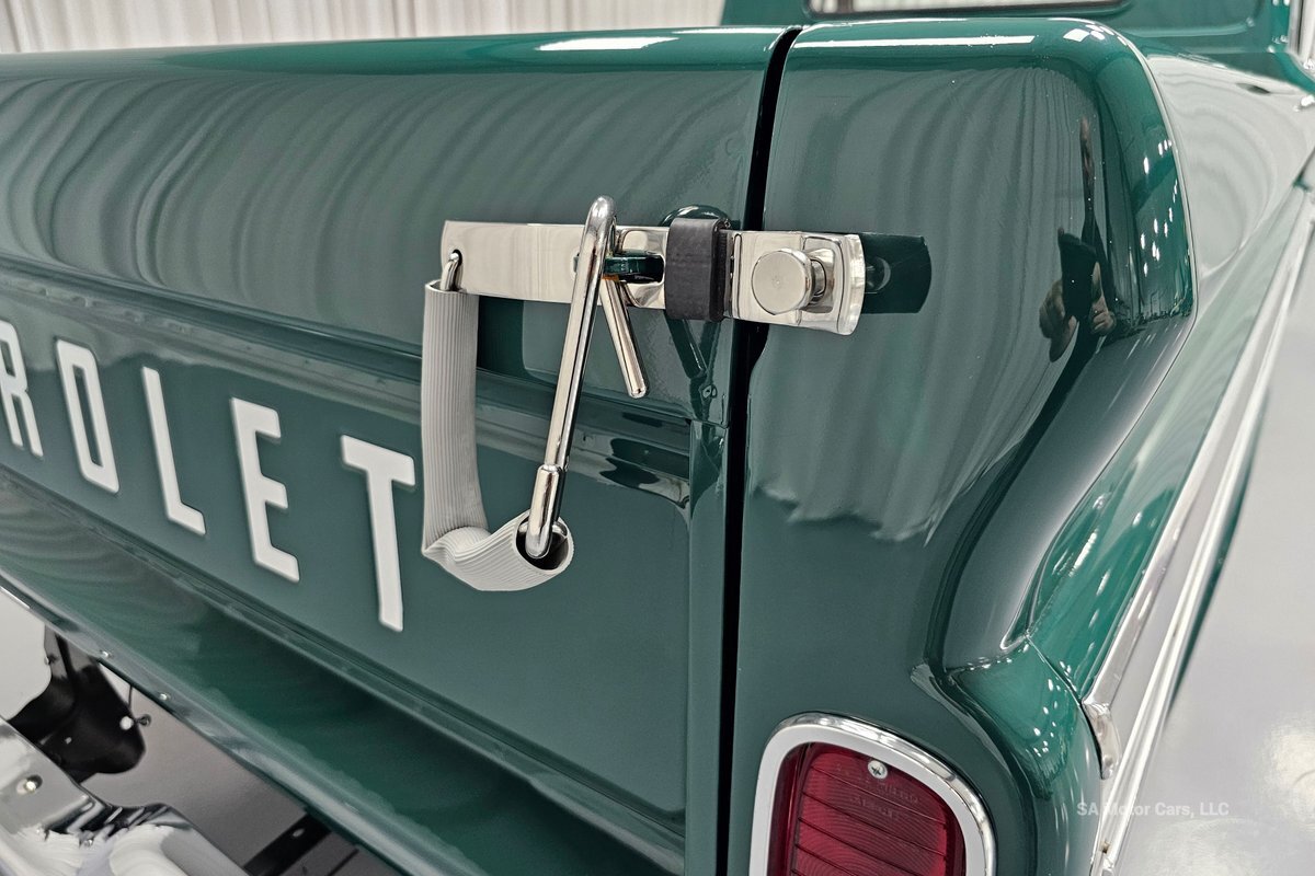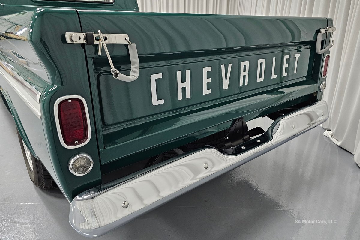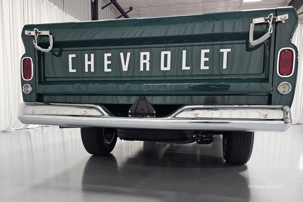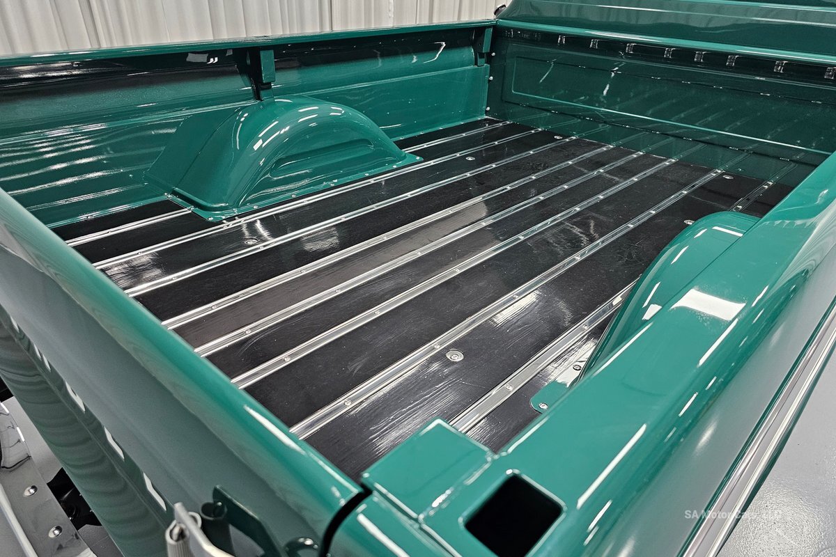 This all so lovely C-10 is painted in a beautiful Green with painted white strip down the cab and bed, covered in clear coat. Nice Michelin Tires 235/75R15 front and back. The Tail Bed has a beautiful wooden floor.