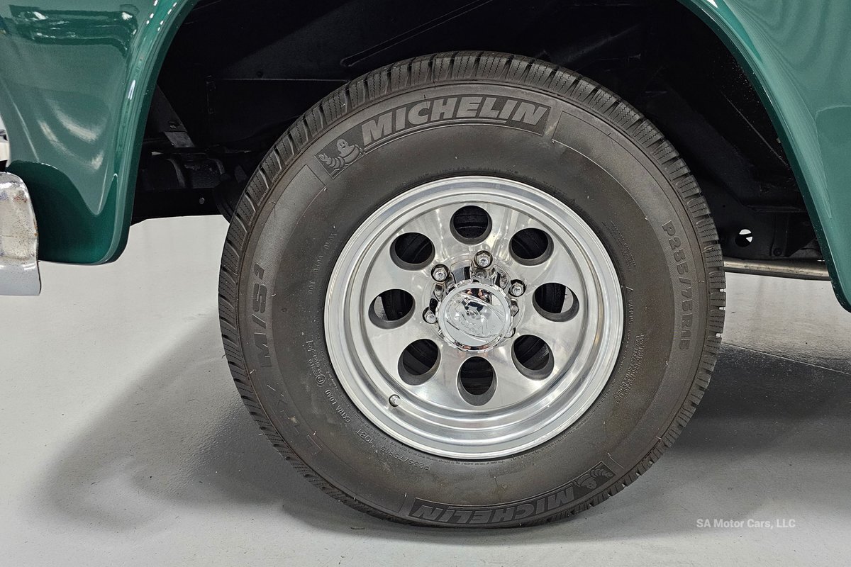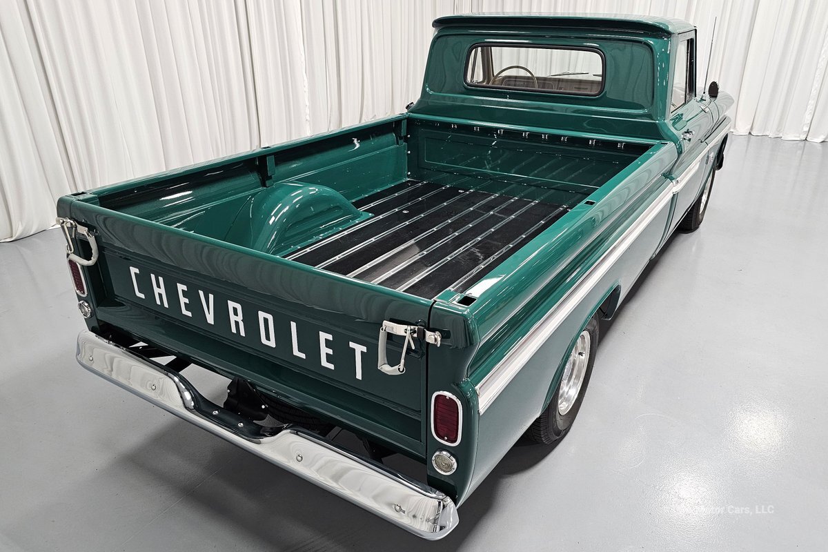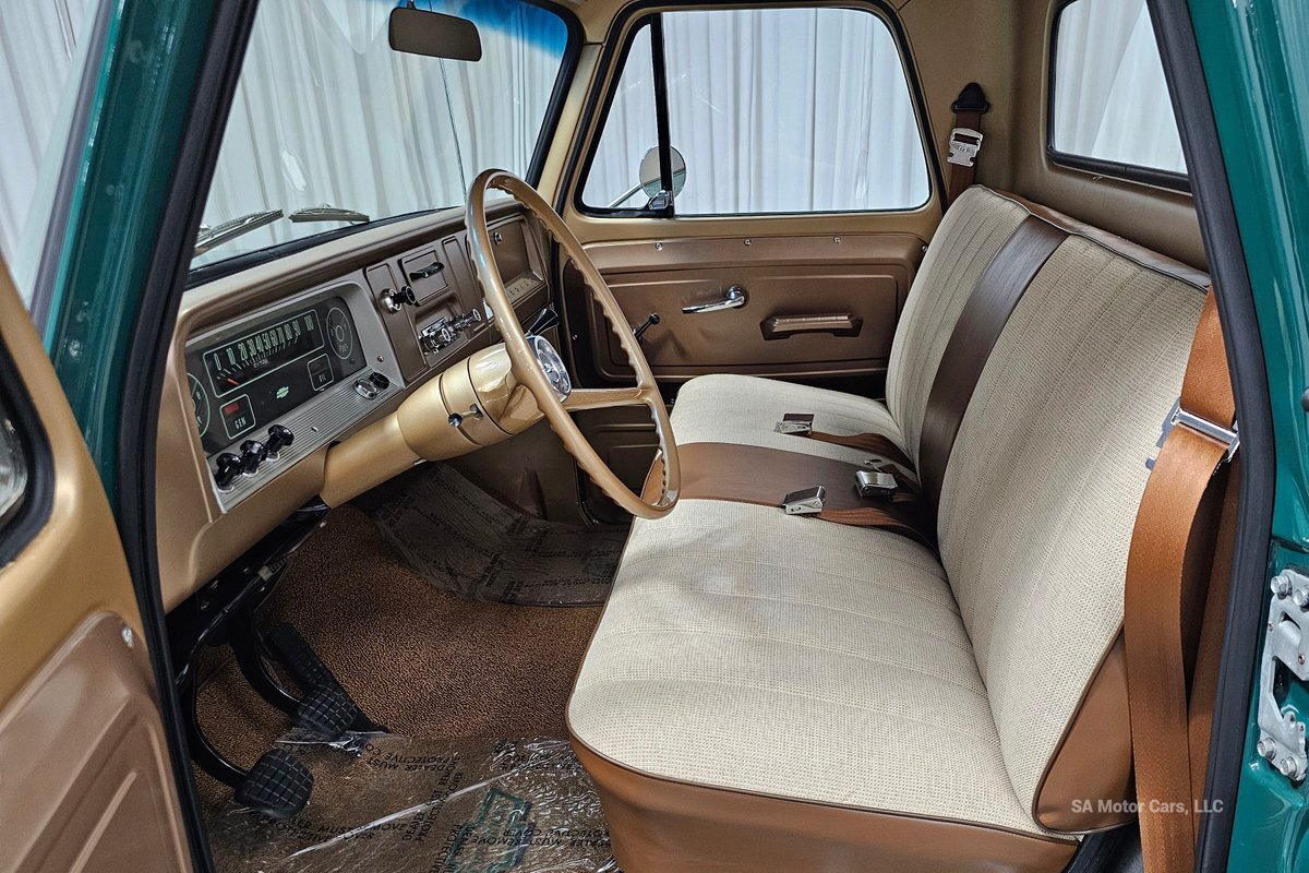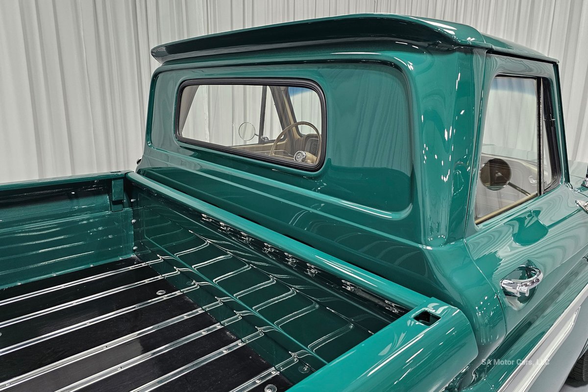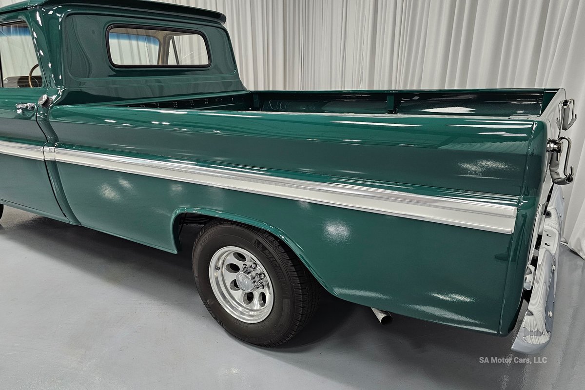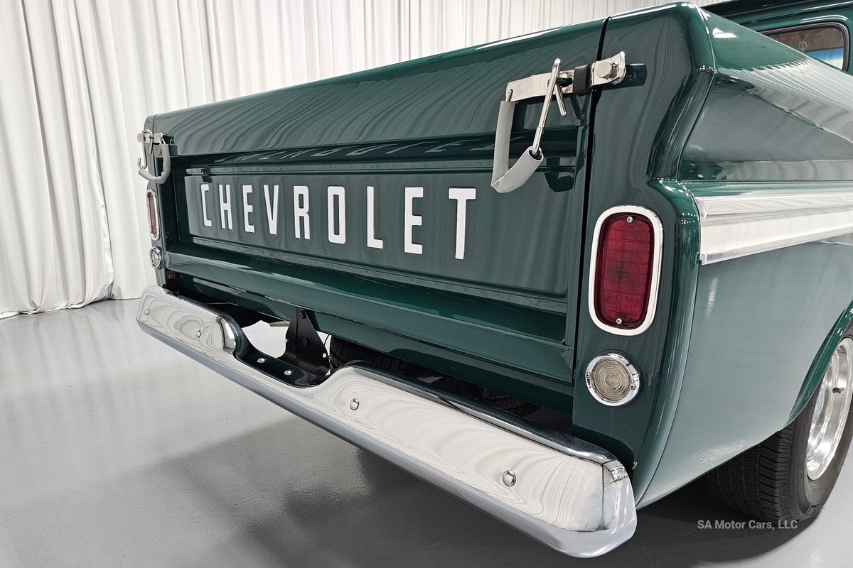 This all so lovely C-10 is painted in a beautiful Green with painted white strip down the cab and bed, covered in clear coat. Nice Michelin Tires 235/75R15 front and back. The Tail Bed has a beautiful wooden floor.