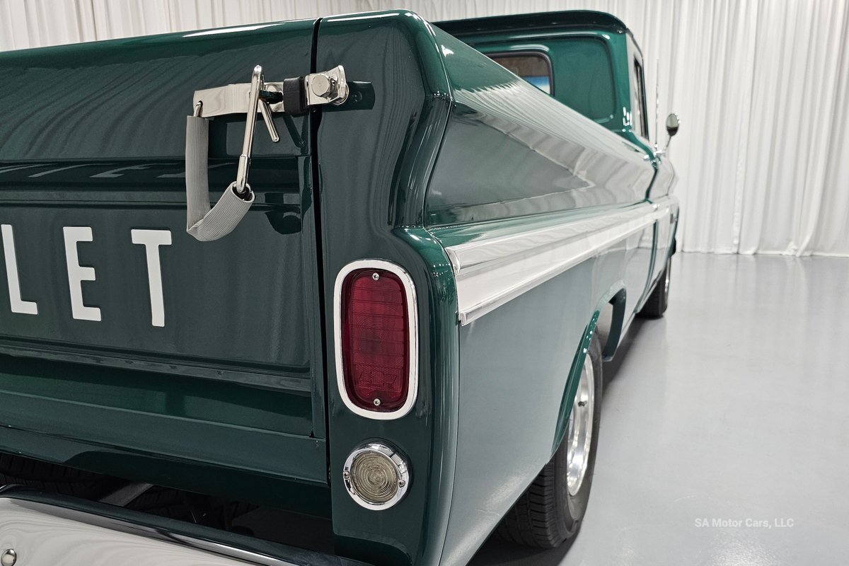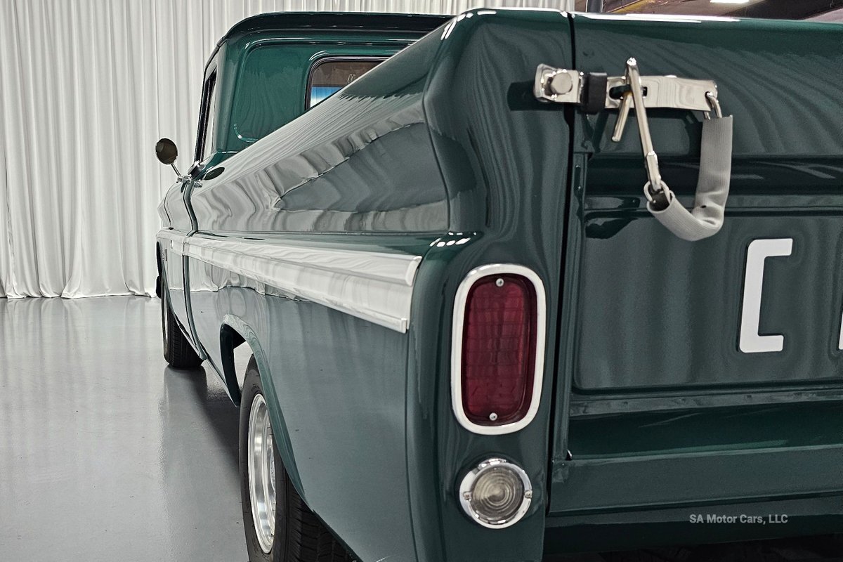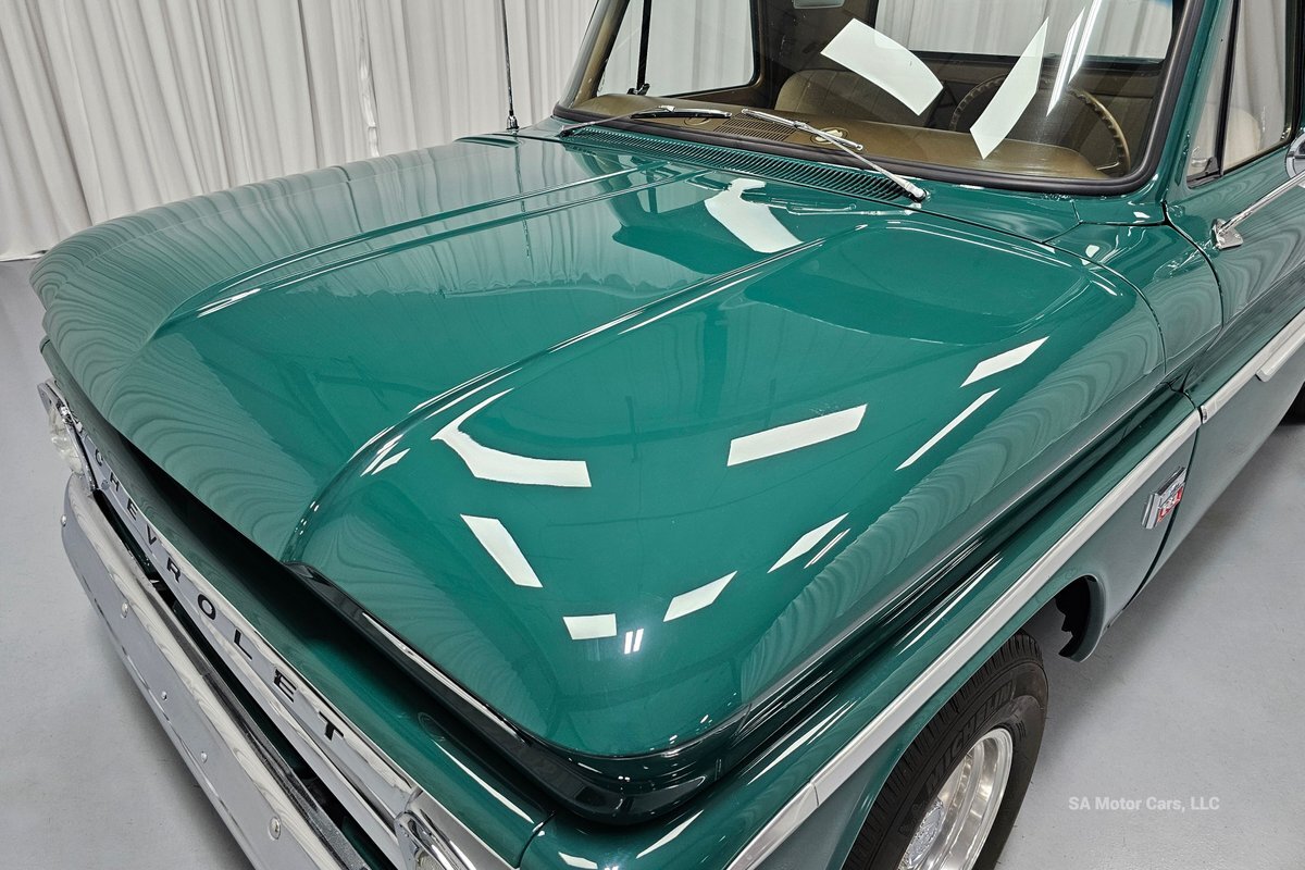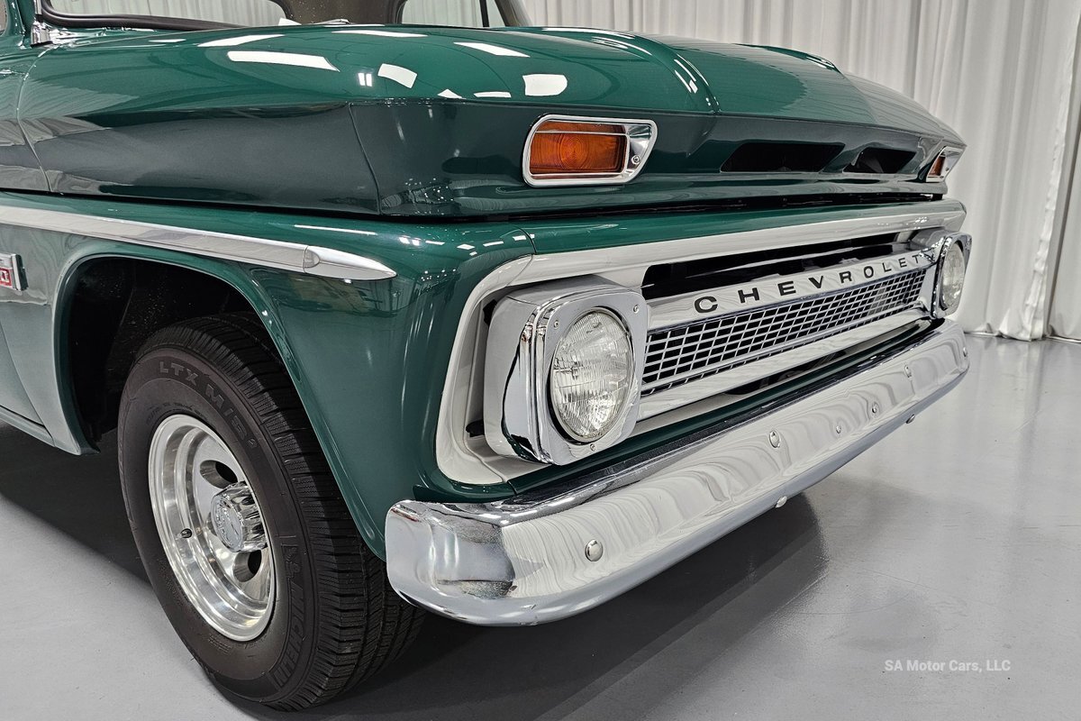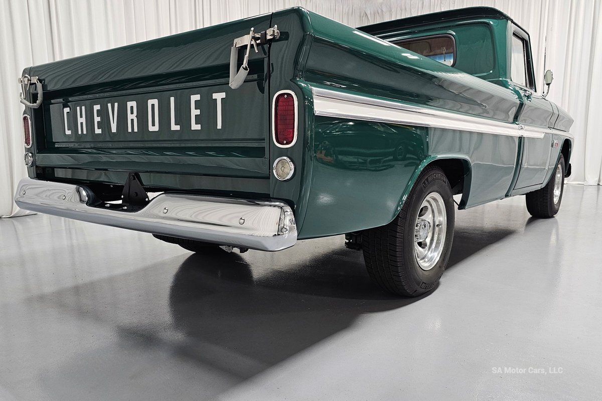 This all so lovely C-10 is painted in a beautiful Green with painted white strip down the cab and bed, covered in clear coat. Nice Michelin Tires 235/75R15 front and back. The Tail Bed has a beautiful wooden floor.