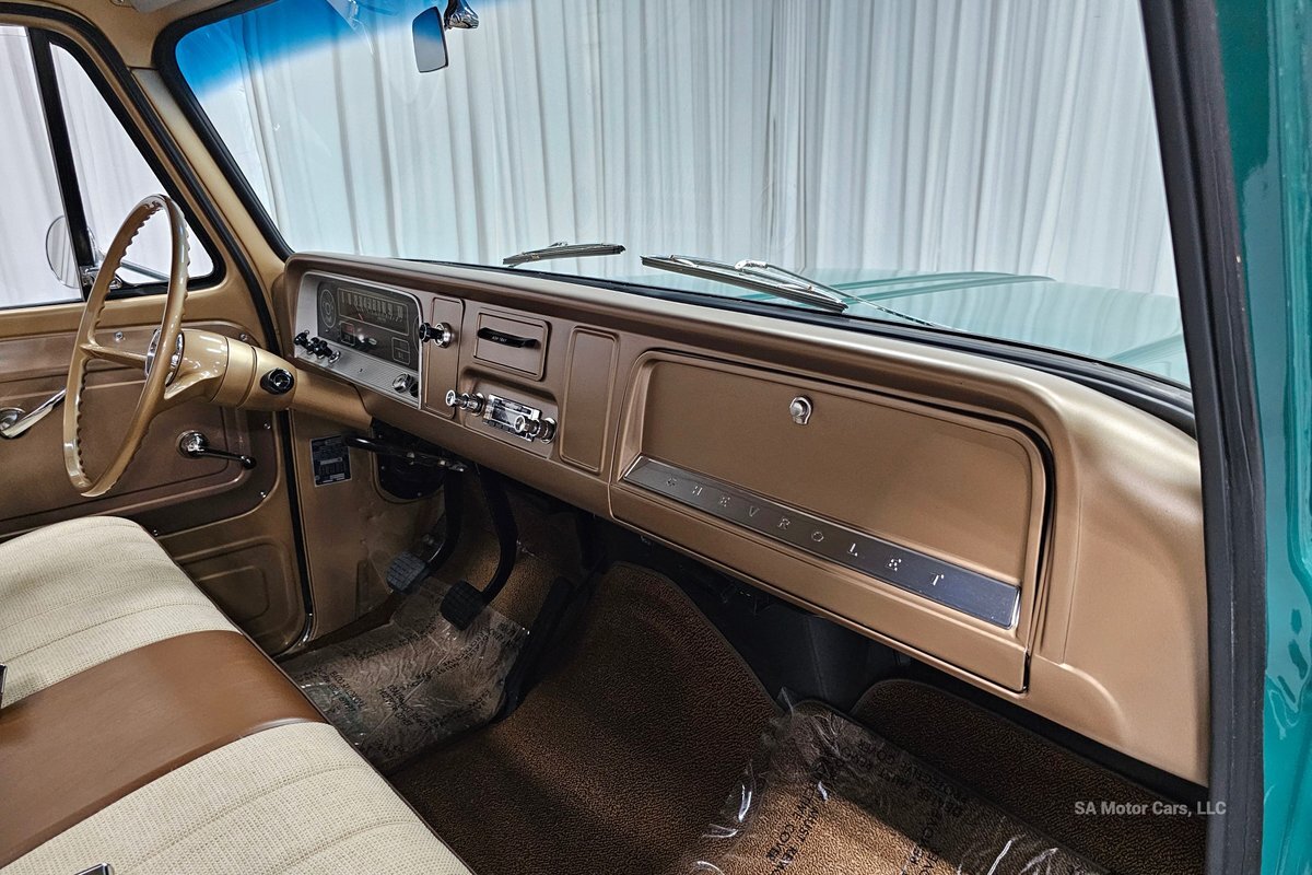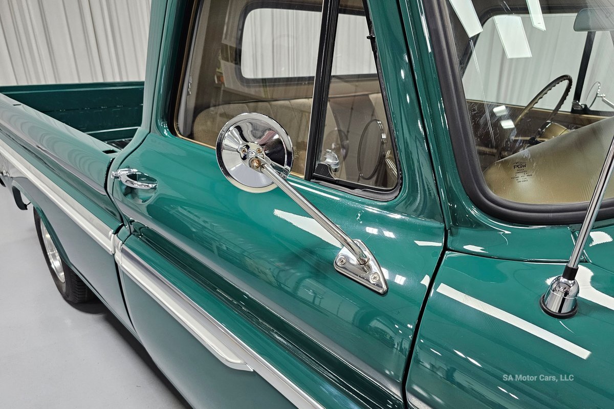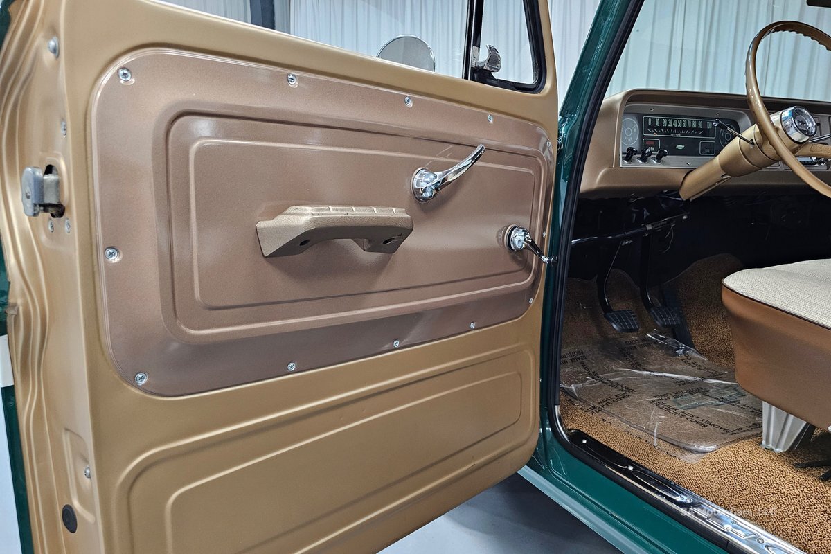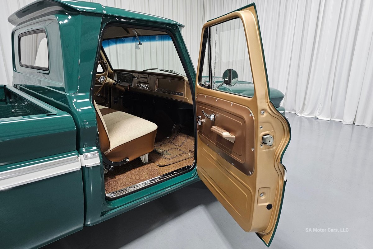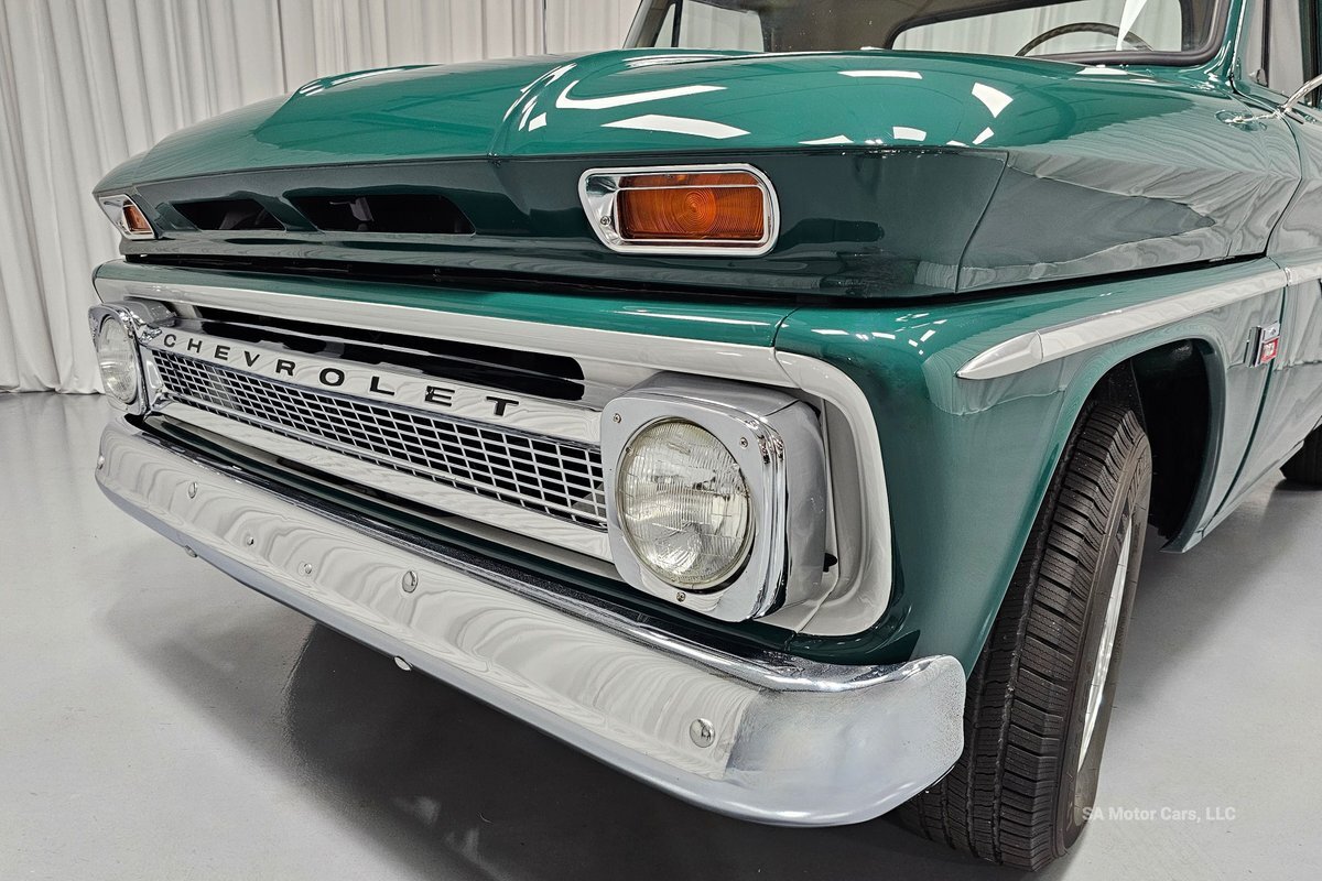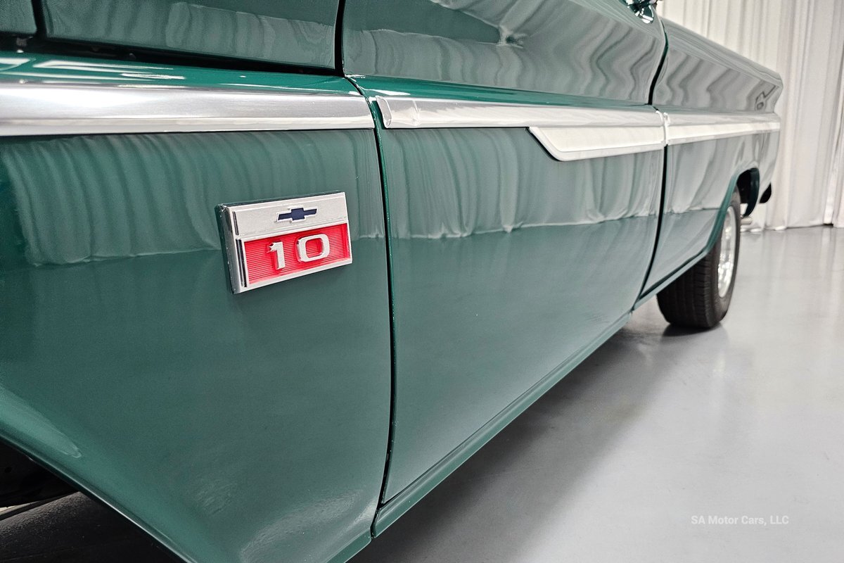 This all so lovely C-10 is painted in a beautiful Green with painted white strip down the cab and bed, covered in clear coat. Nice Michelin Tires 235/75R15 front and back. The Tail Bed has a beautiful wooden floor.