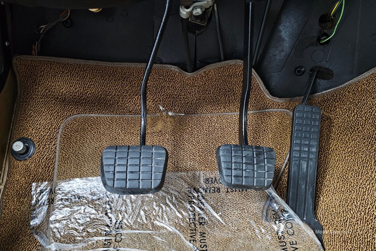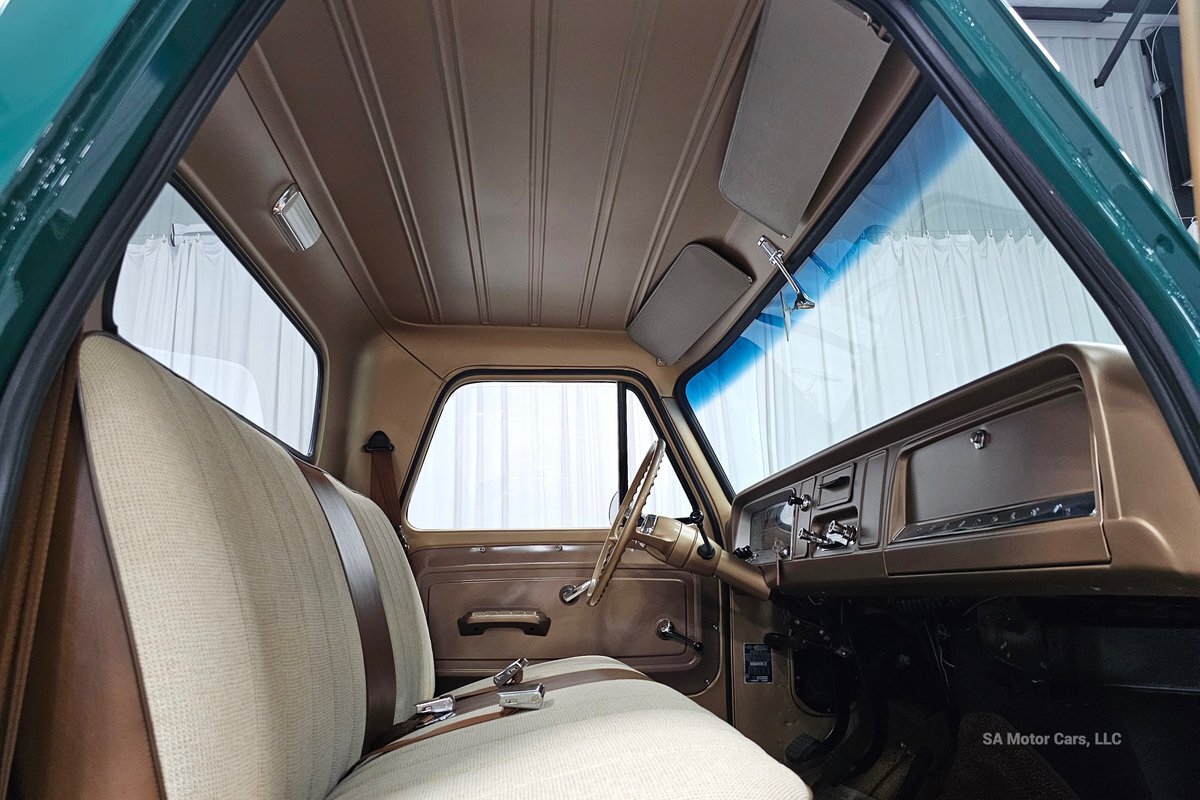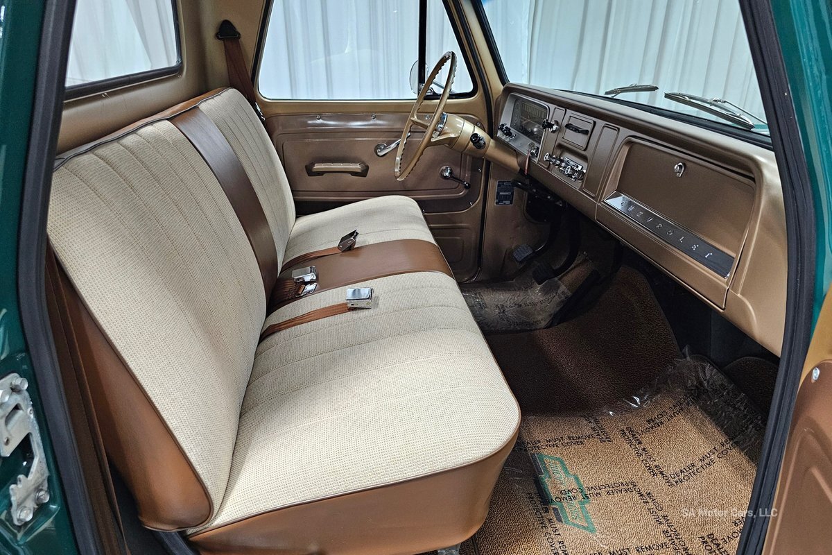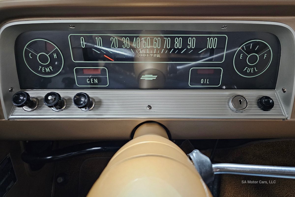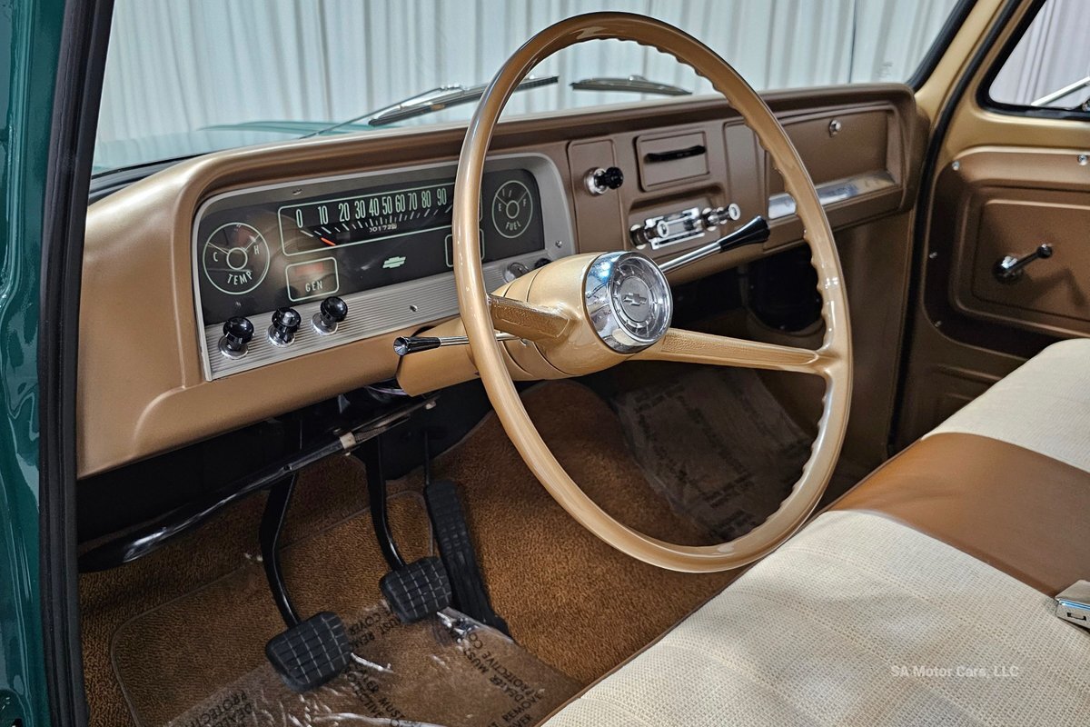 Sporting on the Inside of this beautiful '66 is a bench seat with nice Tweed upholstery faux w/ Brown vinyl, Classic Instruments for gauges, pull out ashtray, AM/FM pull button radio for those who do enjoy riding along with tunes on their drive. Let a nice breeze in while you drive with the manual roll down windows. The floor is covered with Brown carpet and matching Brown Floor Mats with a Chevy Truck accent in green on them.