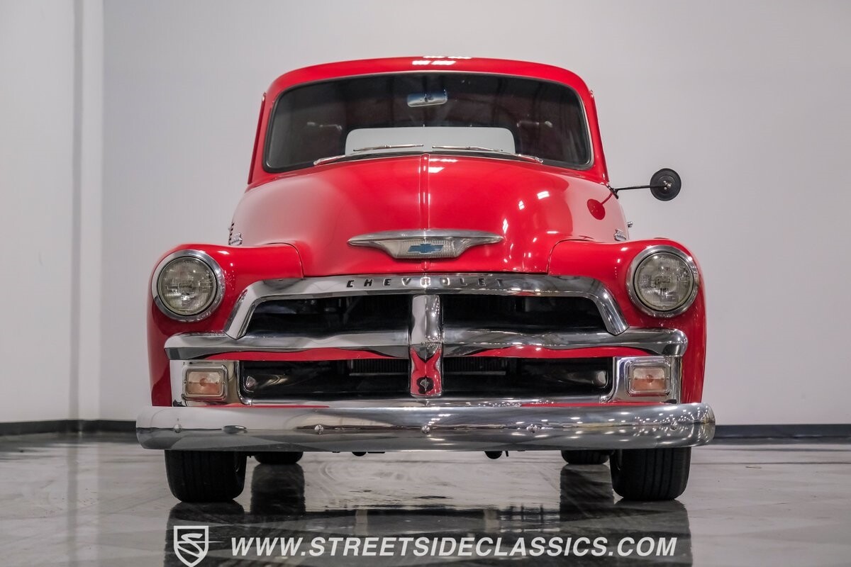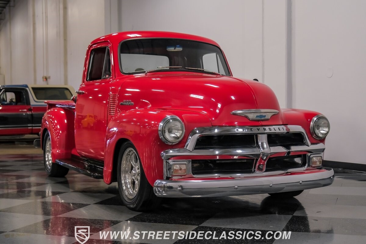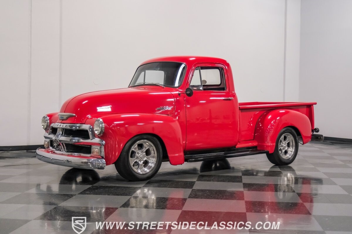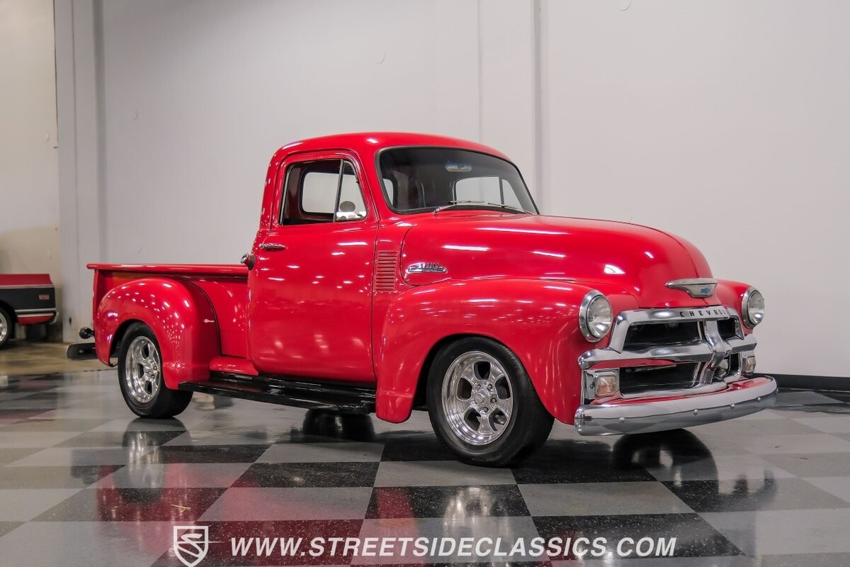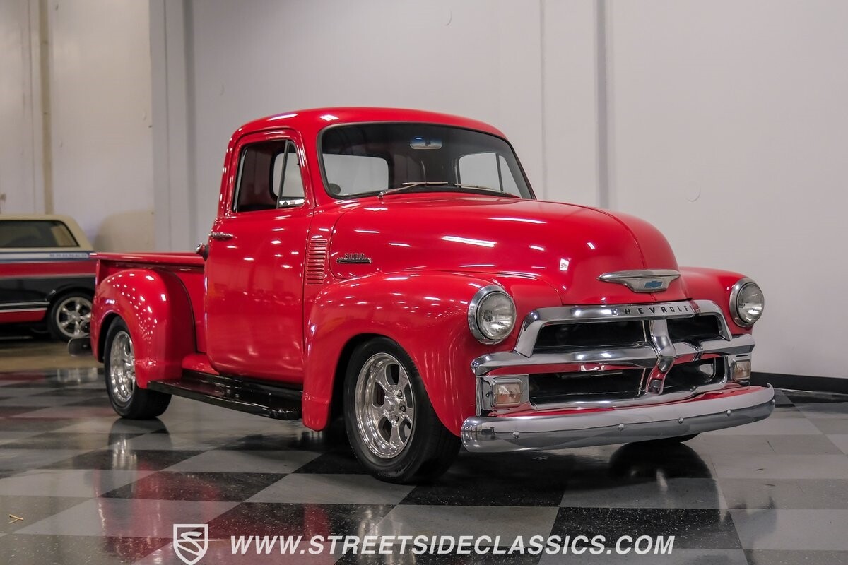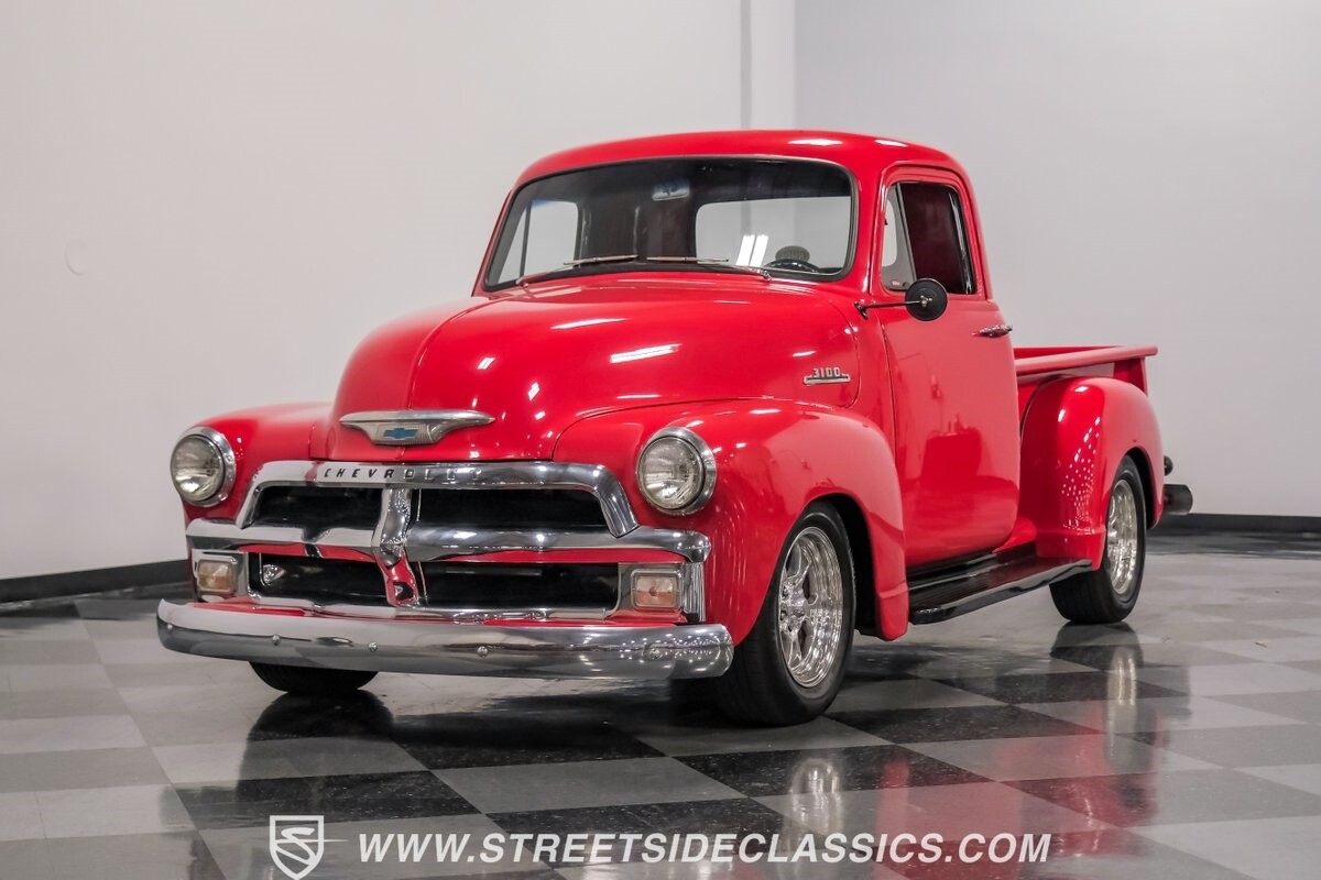 This vibrant 1954 Chevrolet 3100 3 Window pickup is a true embodiment of classic American style. Sporting a Viper Red paint that's as bold as it is beautiful, this truck is sure to capture attention wherever it roams. The vivid hue is complemented by 16" American Racing wheels wrapped in staggered 215/65R16 and 235/60R16 tires, providing both a striking look and a confident grip on the asphalt. Professionally restored, the left rear fender was replaced to accommodate the spare tire, resulting in a seamless and authentic appearance.