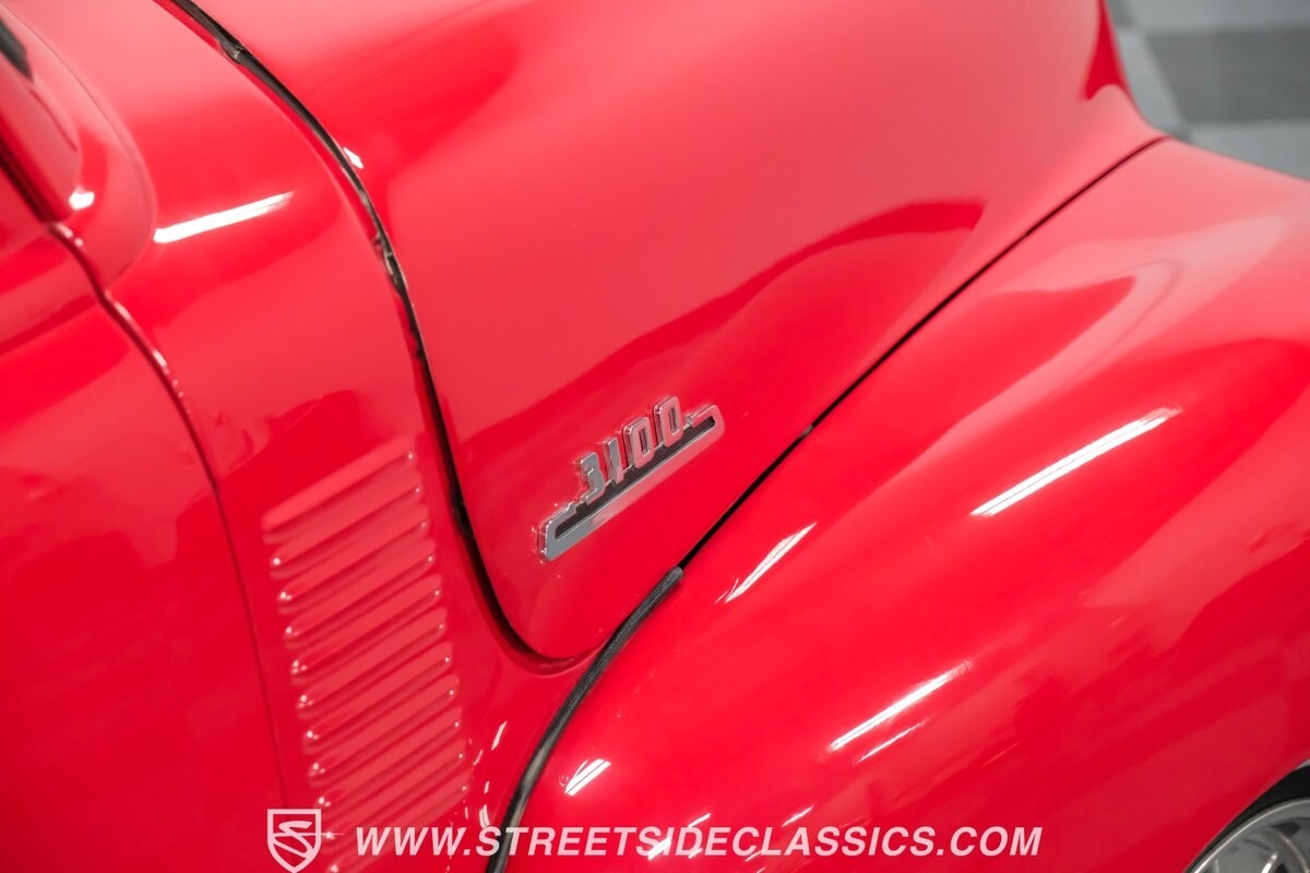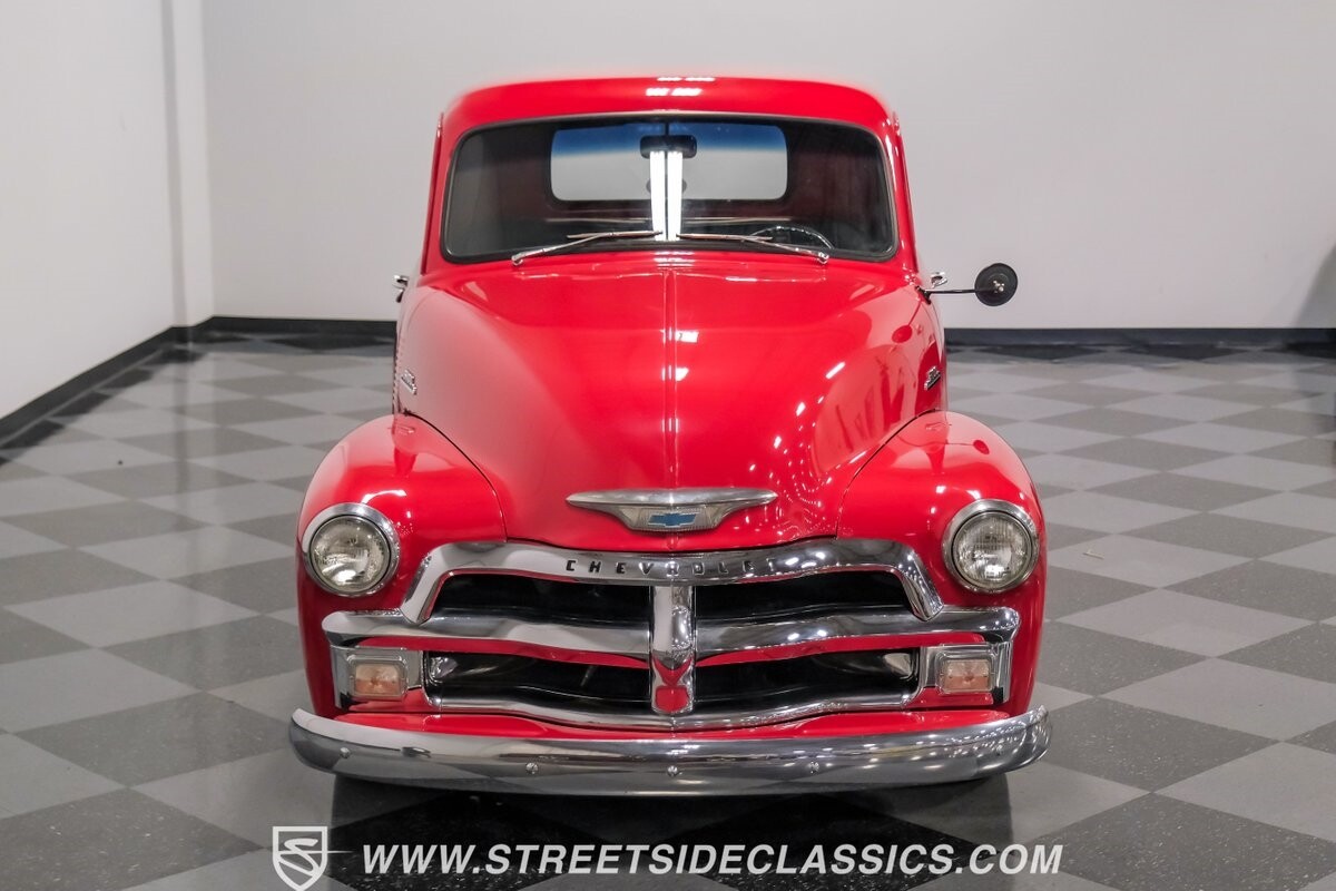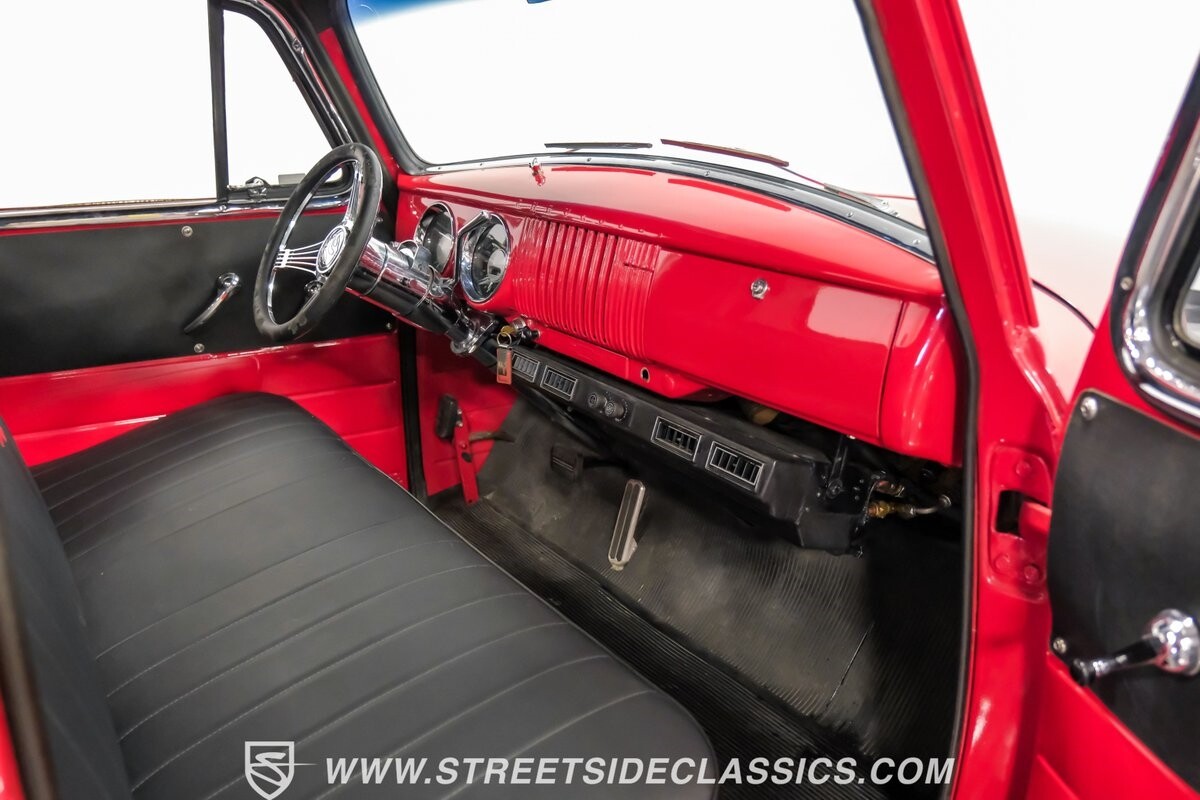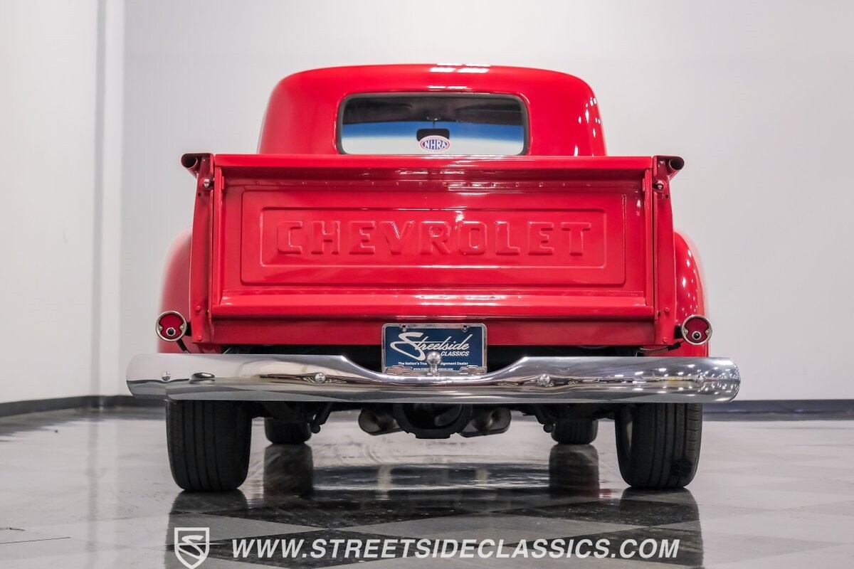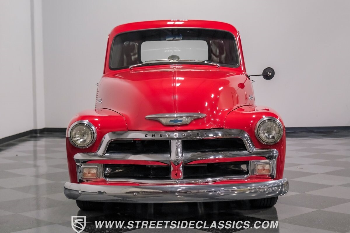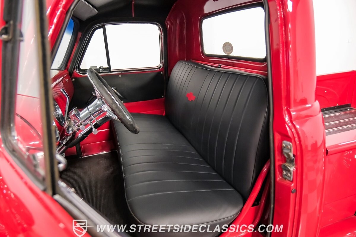 This vibrant 1954 Chevrolet 3100 3 Window pickup is a true embodiment of classic American style. Sporting a Viper Red paint that's as bold as it is beautiful, this truck is sure to capture attention wherever it roams. The vivid hue is complemented by 16" American Racing wheels wrapped in staggered 215/65R16 and 235/60R16 tires, providing both a striking look and a confident grip on the asphalt. Professionally restored, the left rear fender was replaced to accommodate the spare tire, resulting in a seamless and authentic appearance.