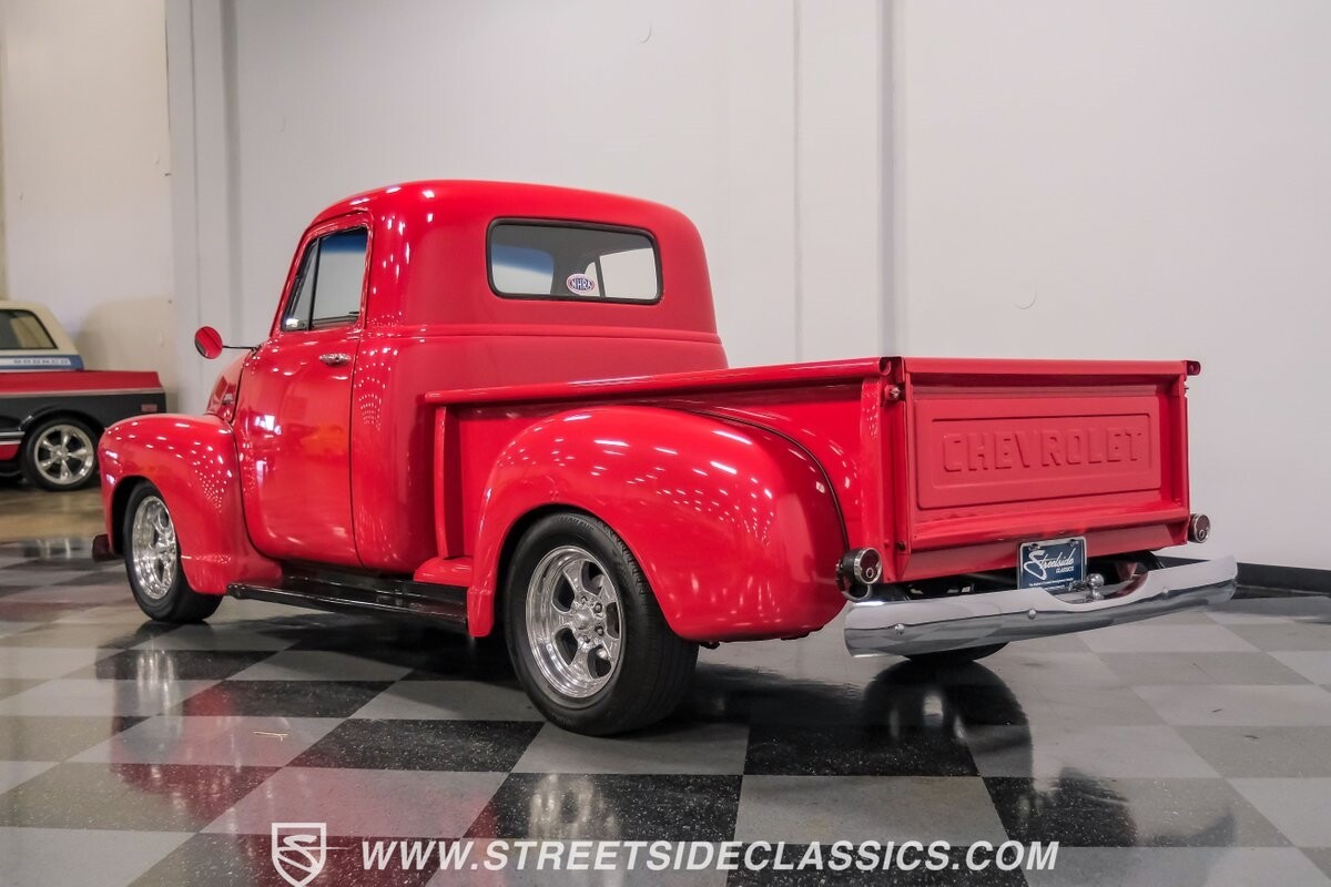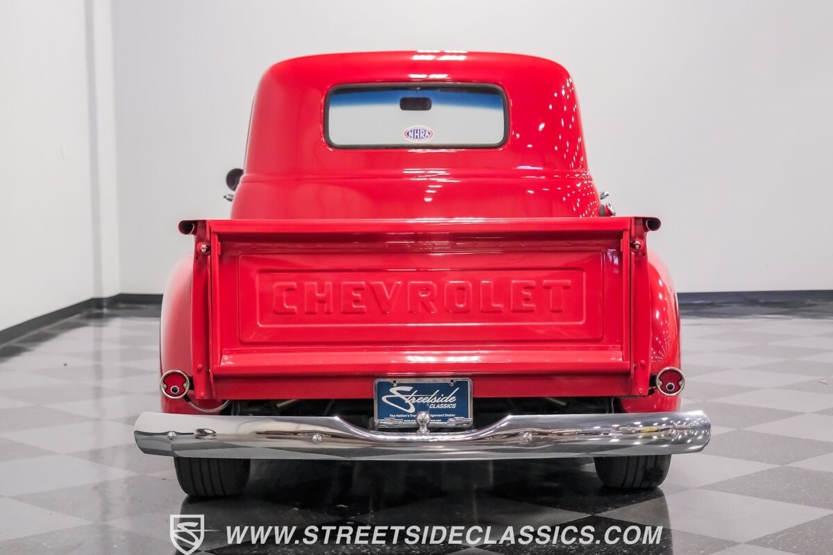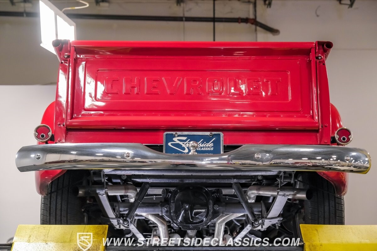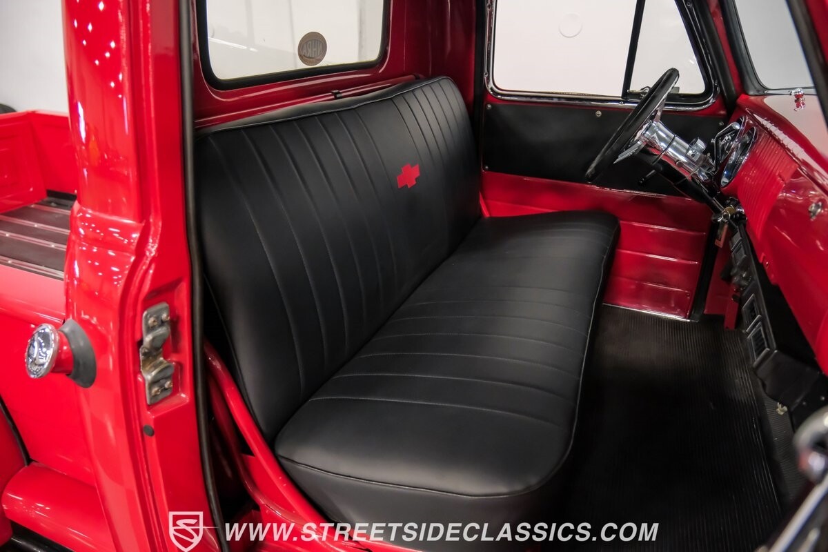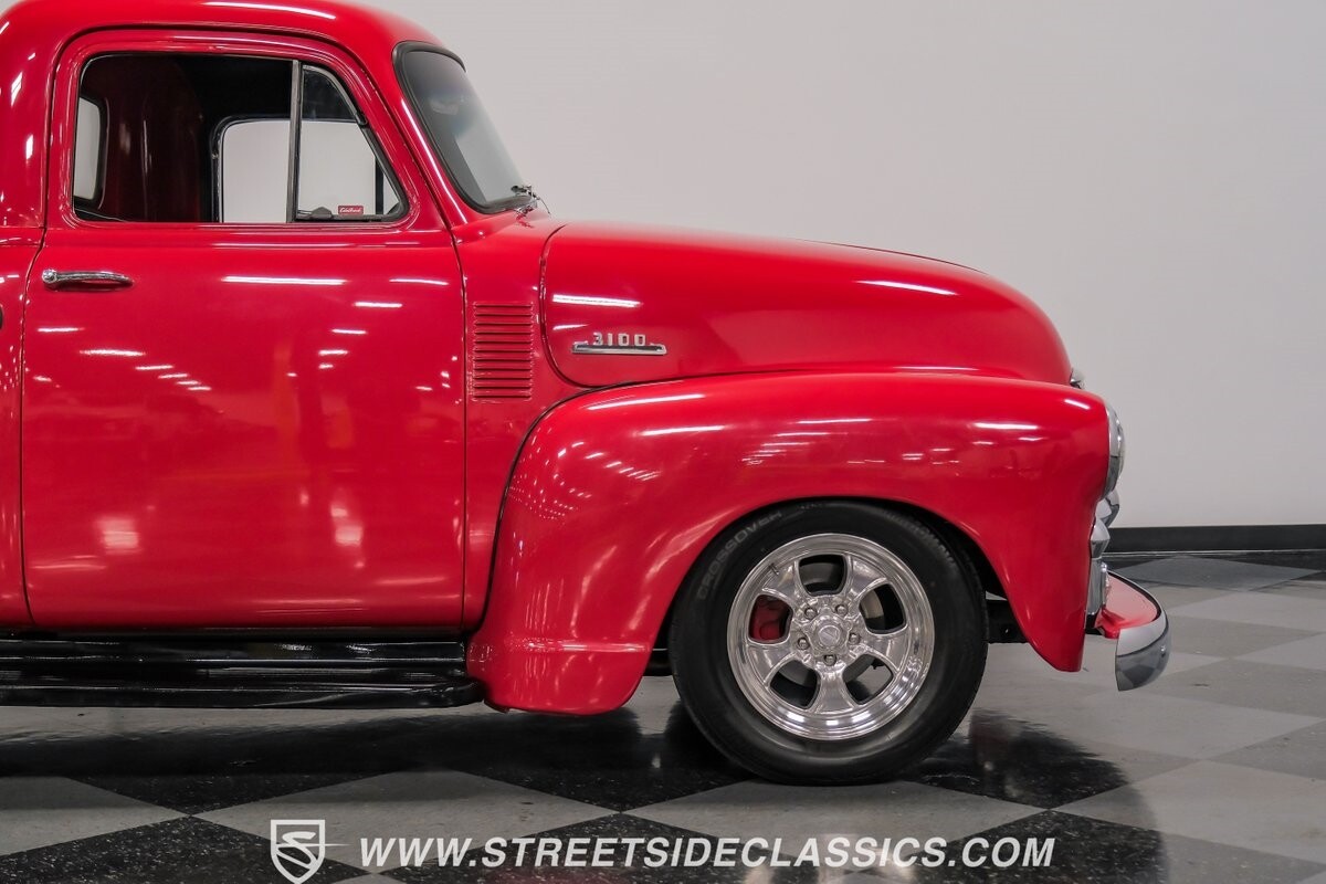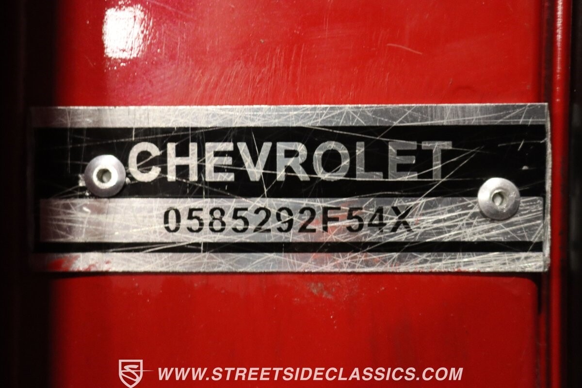 This vibrant 1954 Chevrolet 3100 3 Window pickup is a true embodiment of classic American style. Sporting a Viper Red paint that's as bold as it is beautiful, this truck is sure to capture attention wherever it roams. The vivid hue is complemented by 16" American Racing wheels wrapped in staggered 215/65R16 and 235/60R16 tires, providing both a striking look and a confident grip on the asphalt. Professionally restored, the left rear fender was replaced to accommodate the spare tire, resulting in a seamless and authentic appearance.