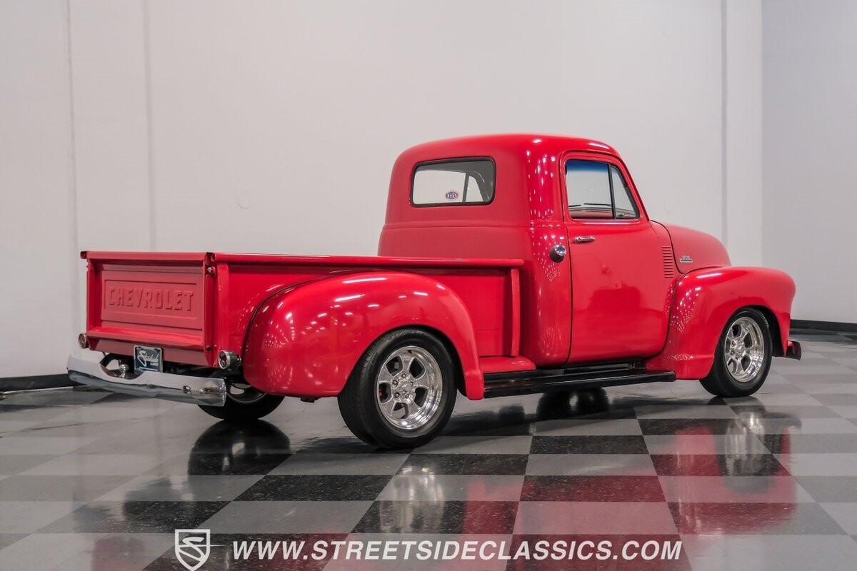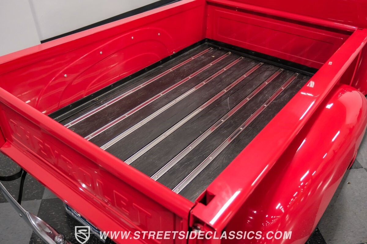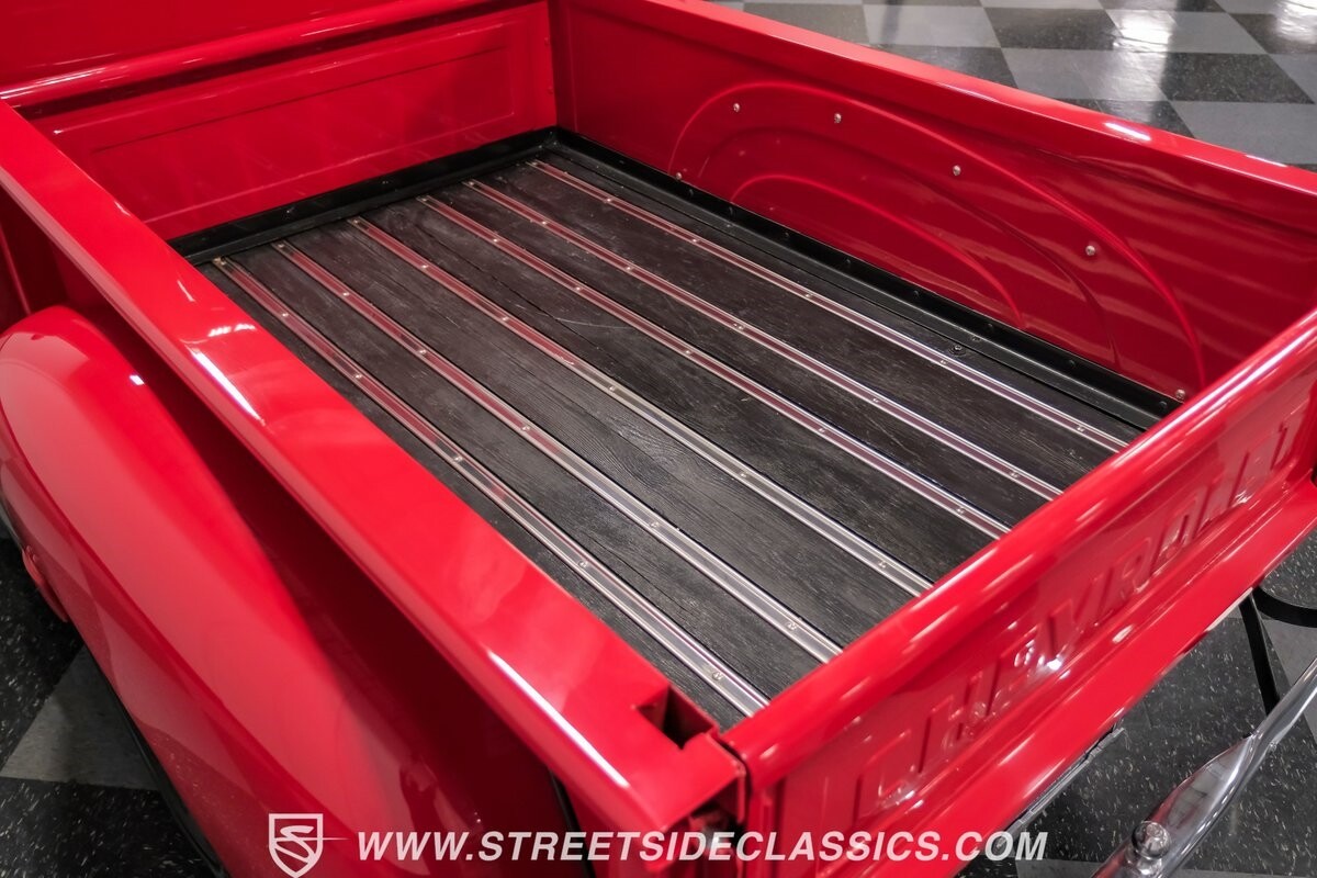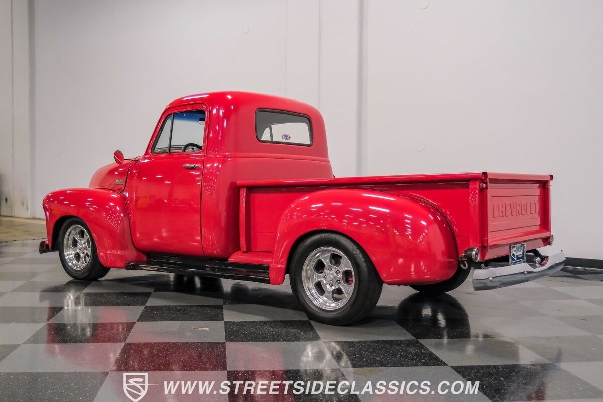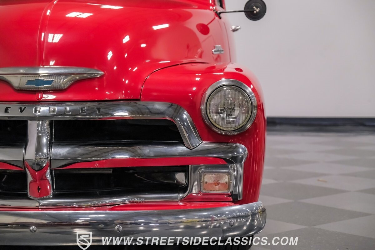 This vibrant 1954 Chevrolet 3100 3 Window pickup is a true embodiment of classic American style. Sporting a Viper Red paint that's as bold as it is beautiful, this truck is sure to capture attention wherever it roams. The vivid hue is complemented by 16" American Racing wheels wrapped in staggered 215/65R16 and 235/60R16 tires, providing both a striking look and a confident grip on the asphalt. Professionally restored, the left rear fender was replaced to accommodate the spare tire, resulting in a seamless and authentic appearance.