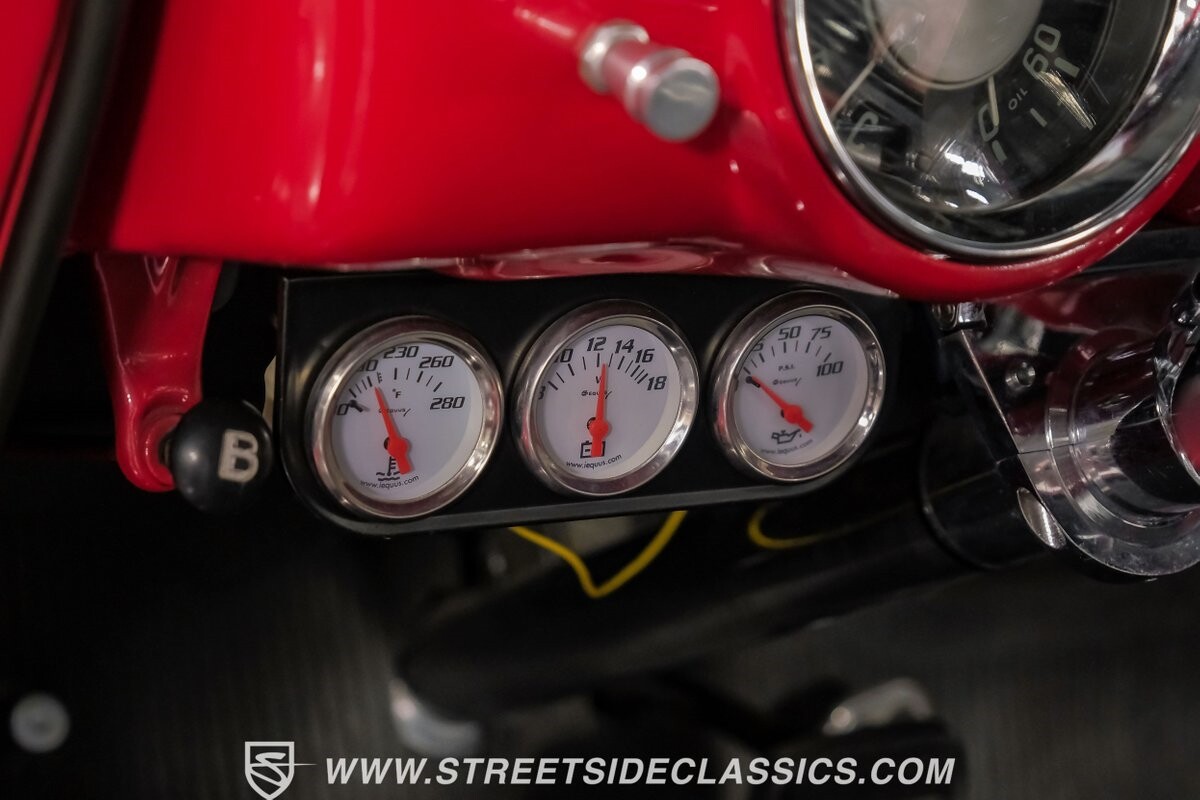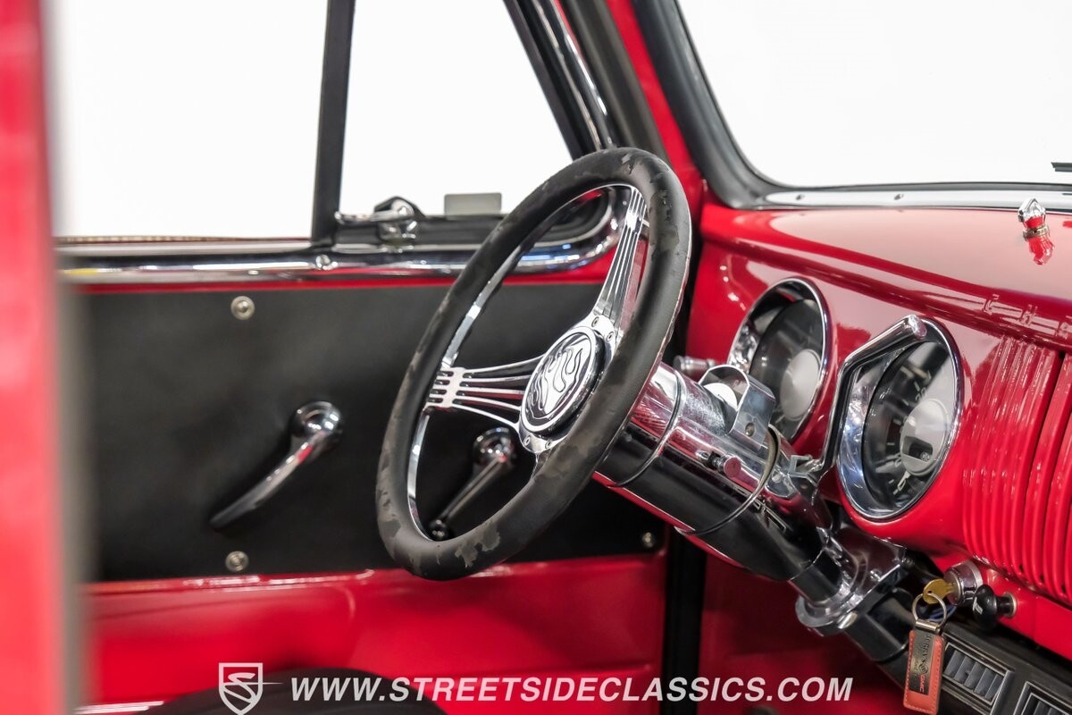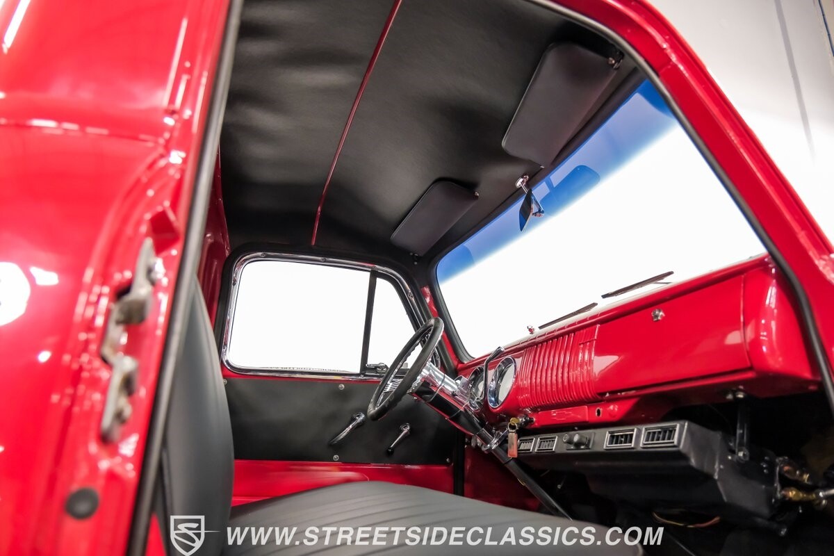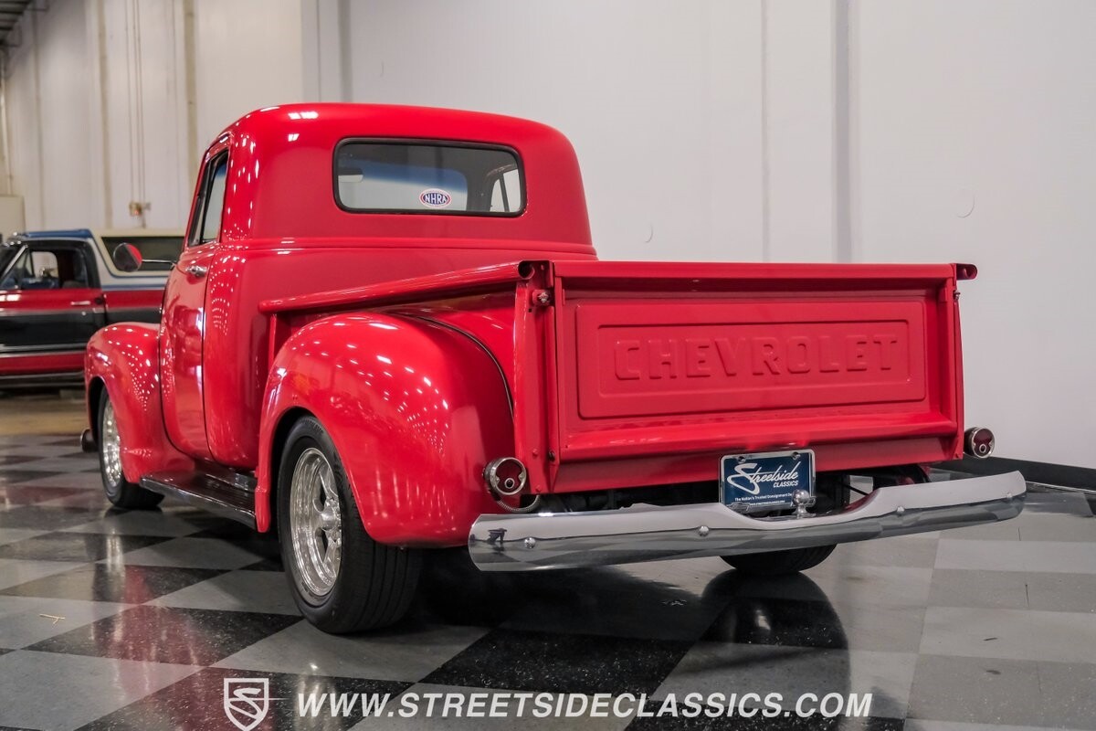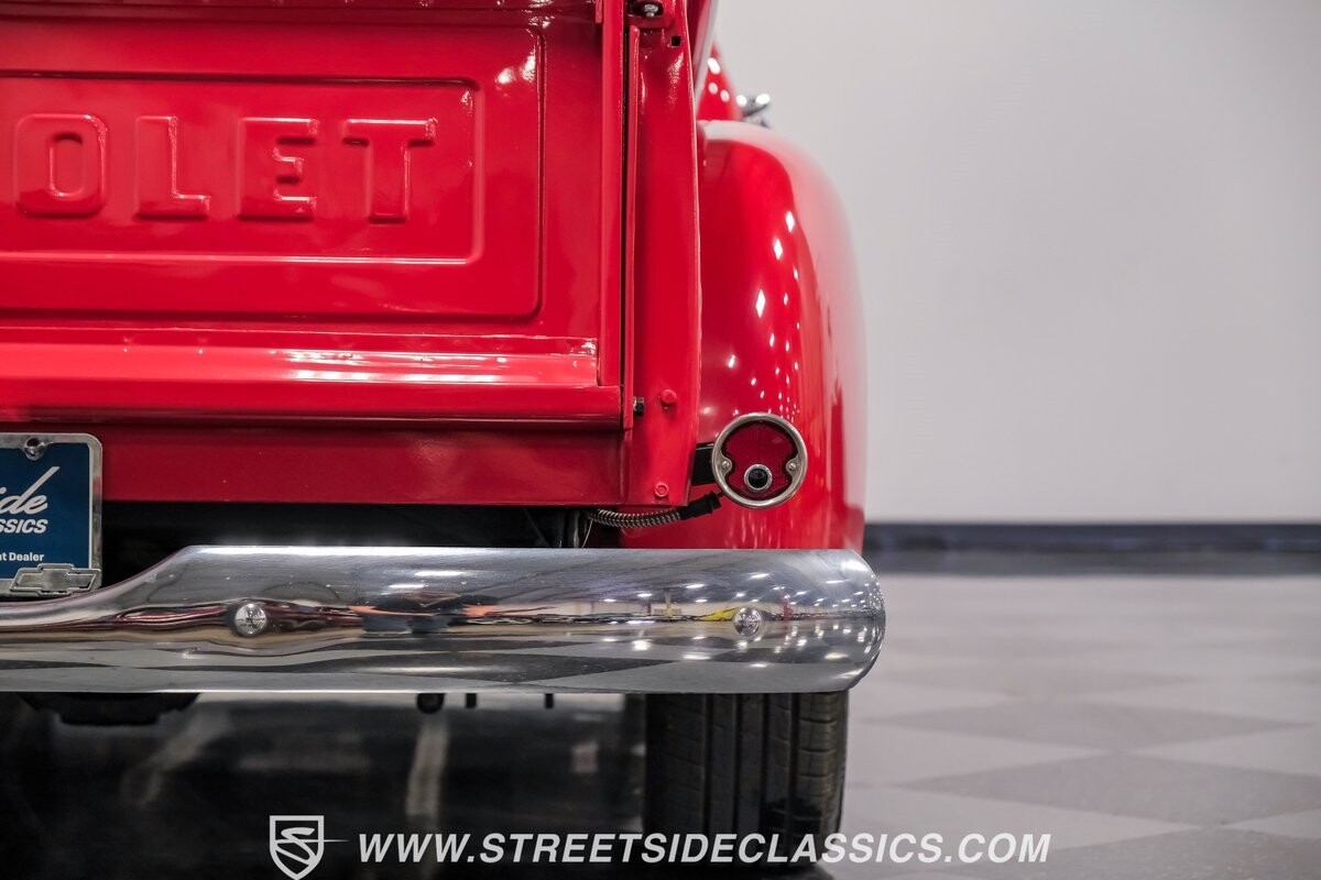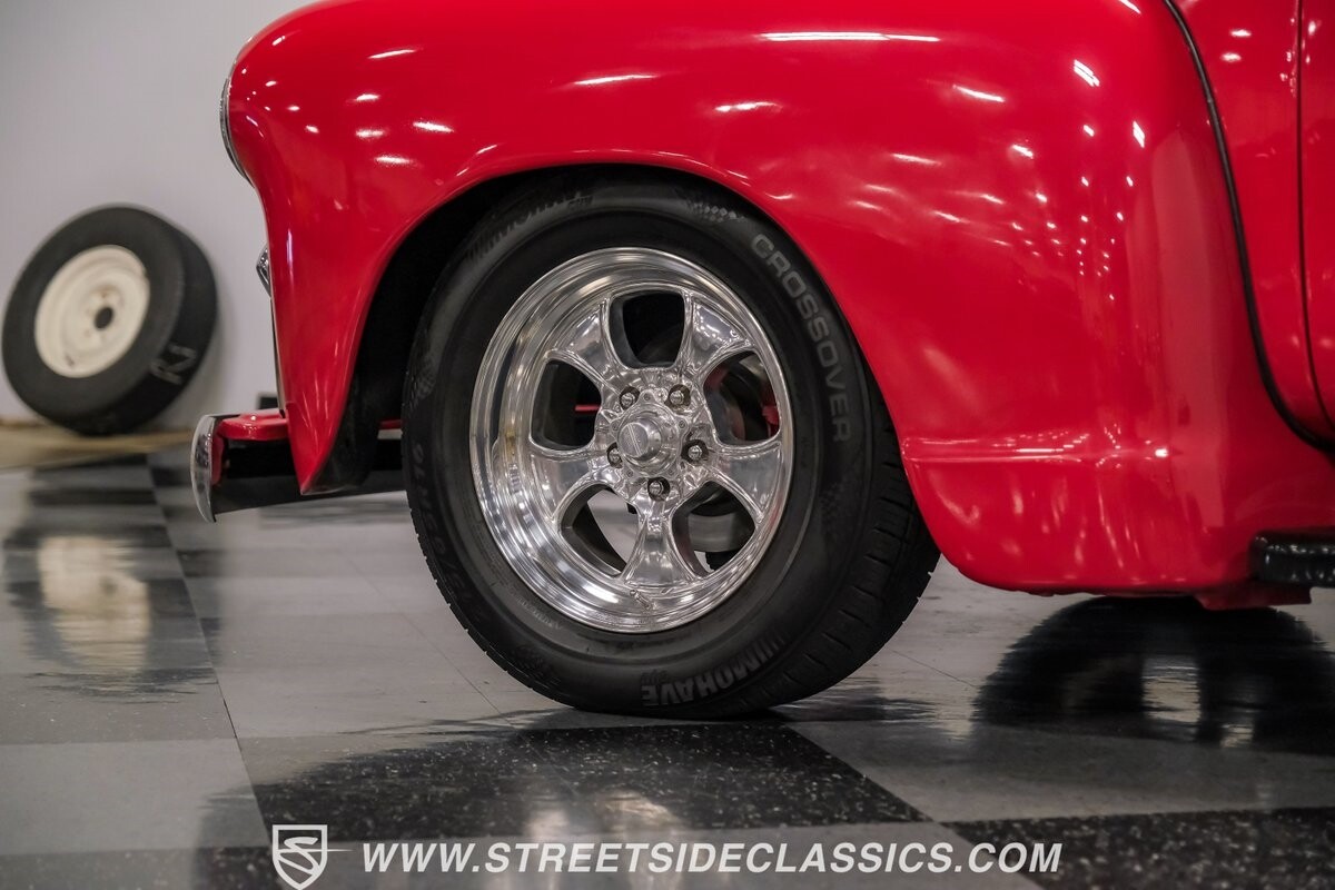 This vibrant 1954 Chevrolet 3100 3 Window pickup is a true embodiment of classic American style. Sporting a Viper Red paint that's as bold as it is beautiful, this truck is sure to capture attention wherever it roams. The vivid hue is complemented by 16" American Racing wheels wrapped in staggered 215/65R16 and 235/60R16 tires, providing both a striking look and a confident grip on the asphalt. Professionally restored, the left rear fender was replaced to accommodate the spare tire, resulting in a seamless and authentic appearance.