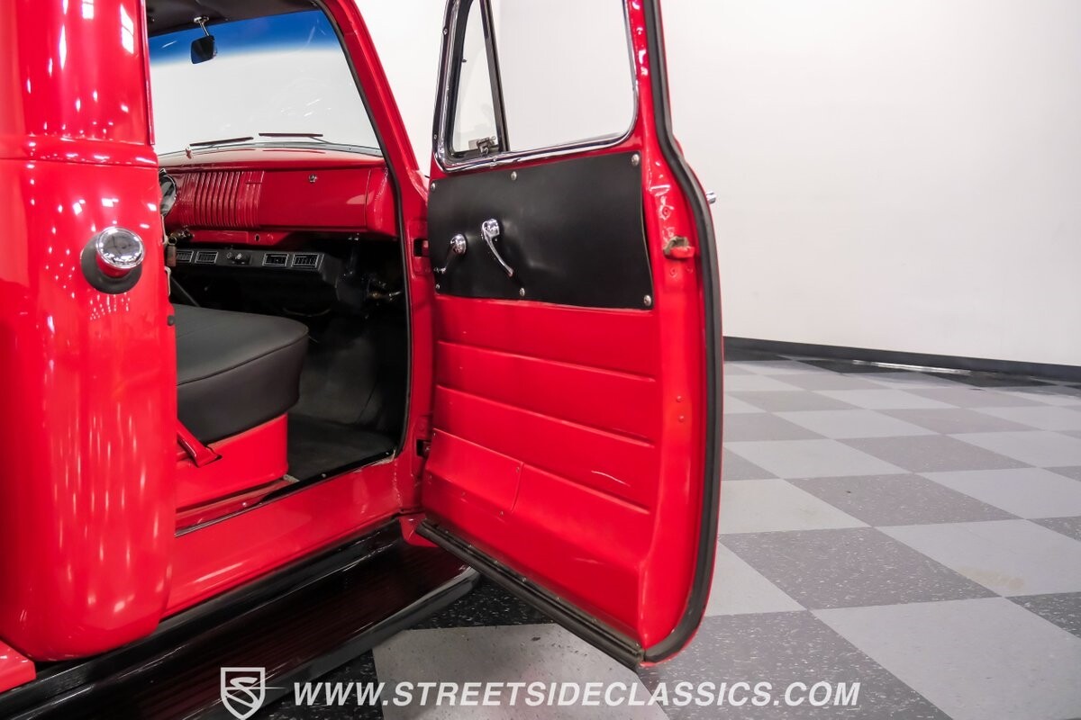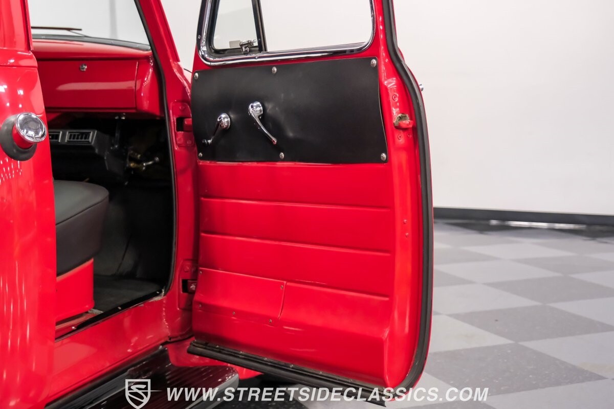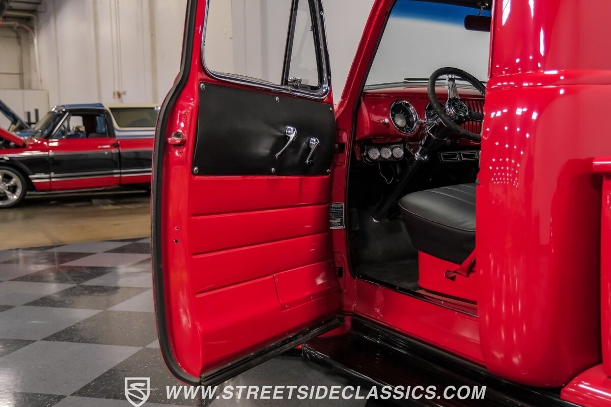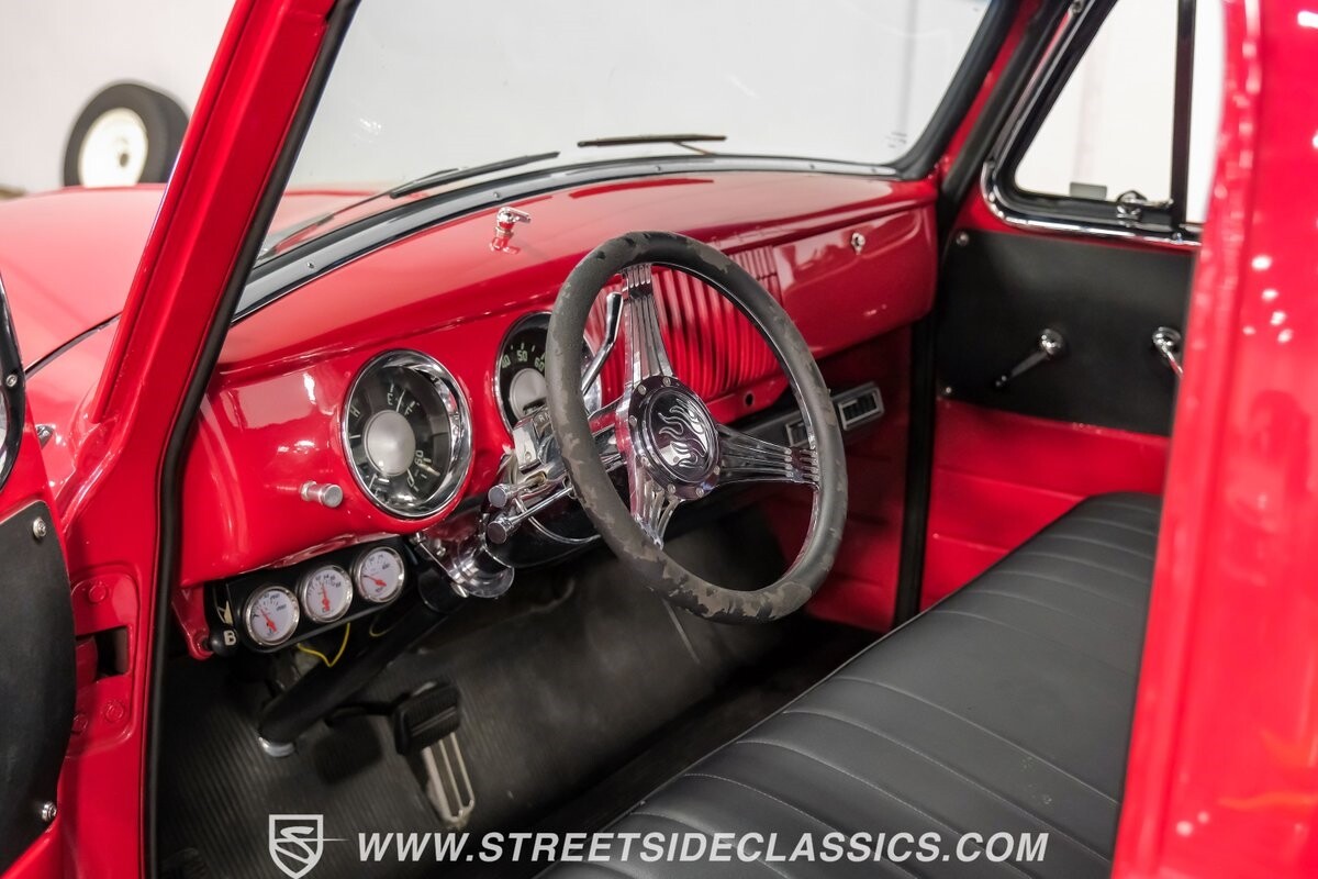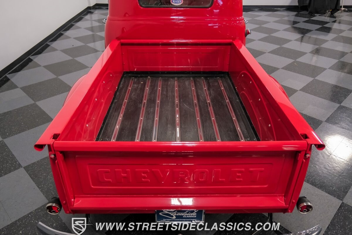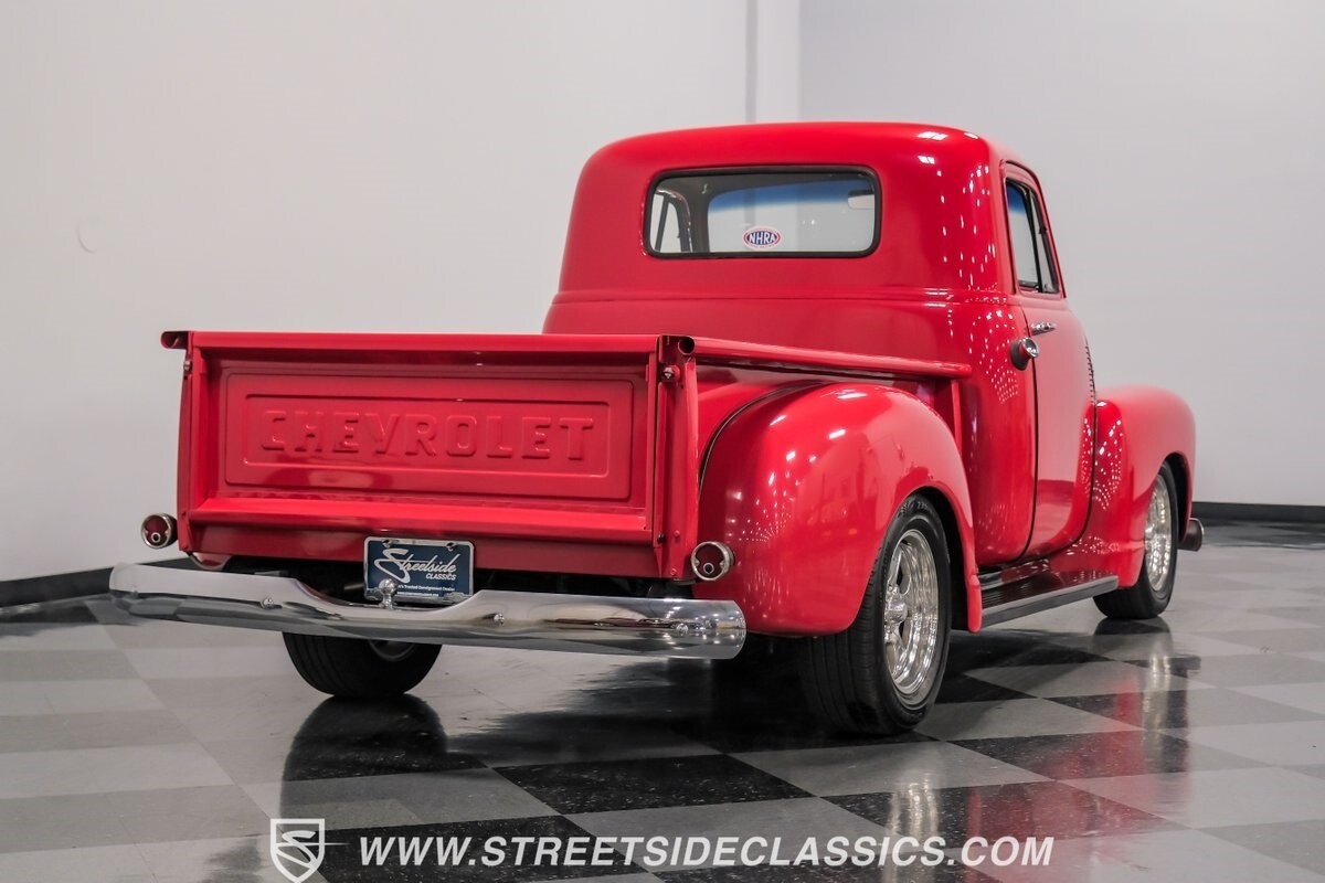 This vibrant 1954 Chevrolet 3100 3 Window pickup is a true embodiment of classic American style. Sporting a Viper Red paint that's as bold as it is beautiful, this truck is sure to capture attention wherever it roams. The vivid hue is complemented by 16" American Racing wheels wrapped in staggered 215/65R16 and 235/60R16 tires, providing both a striking look and a confident grip on the asphalt. Professionally restored, the left rear fender was replaced to accommodate the spare tire, resulting in a seamless and authentic appearance.