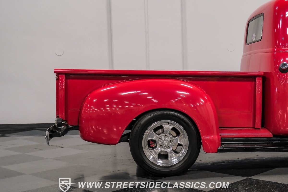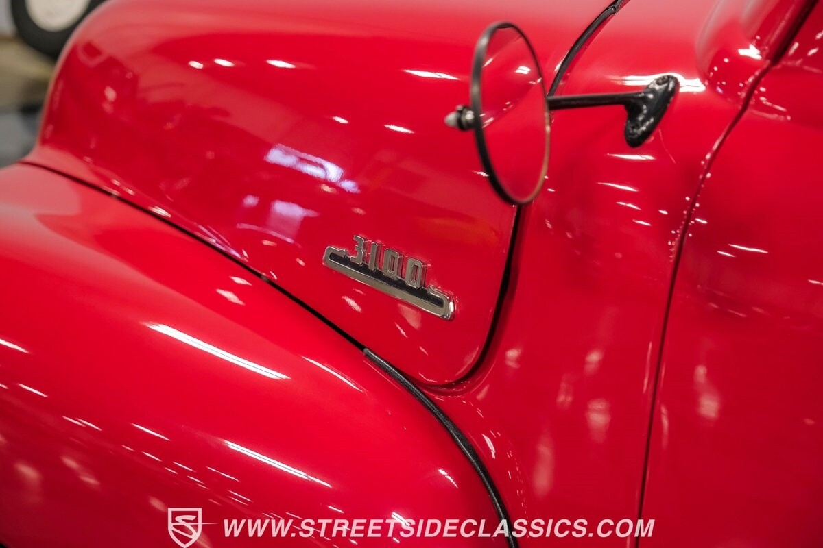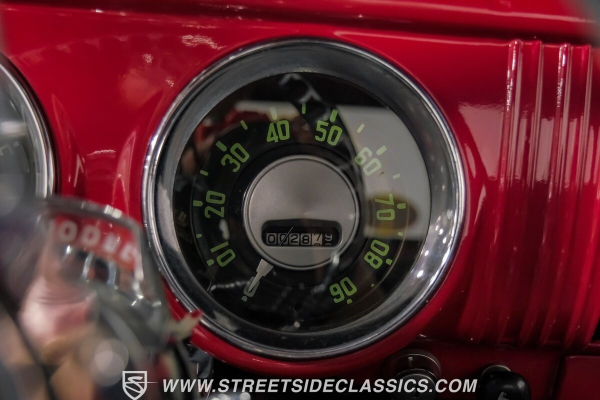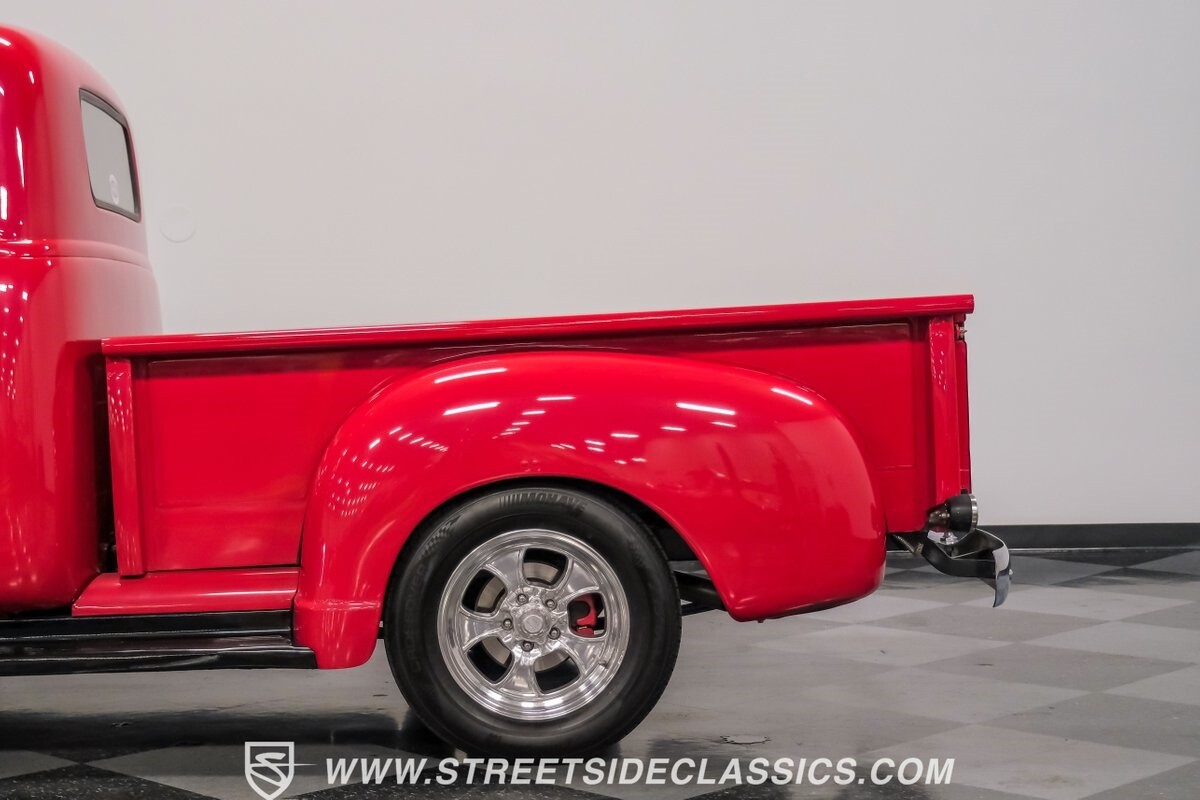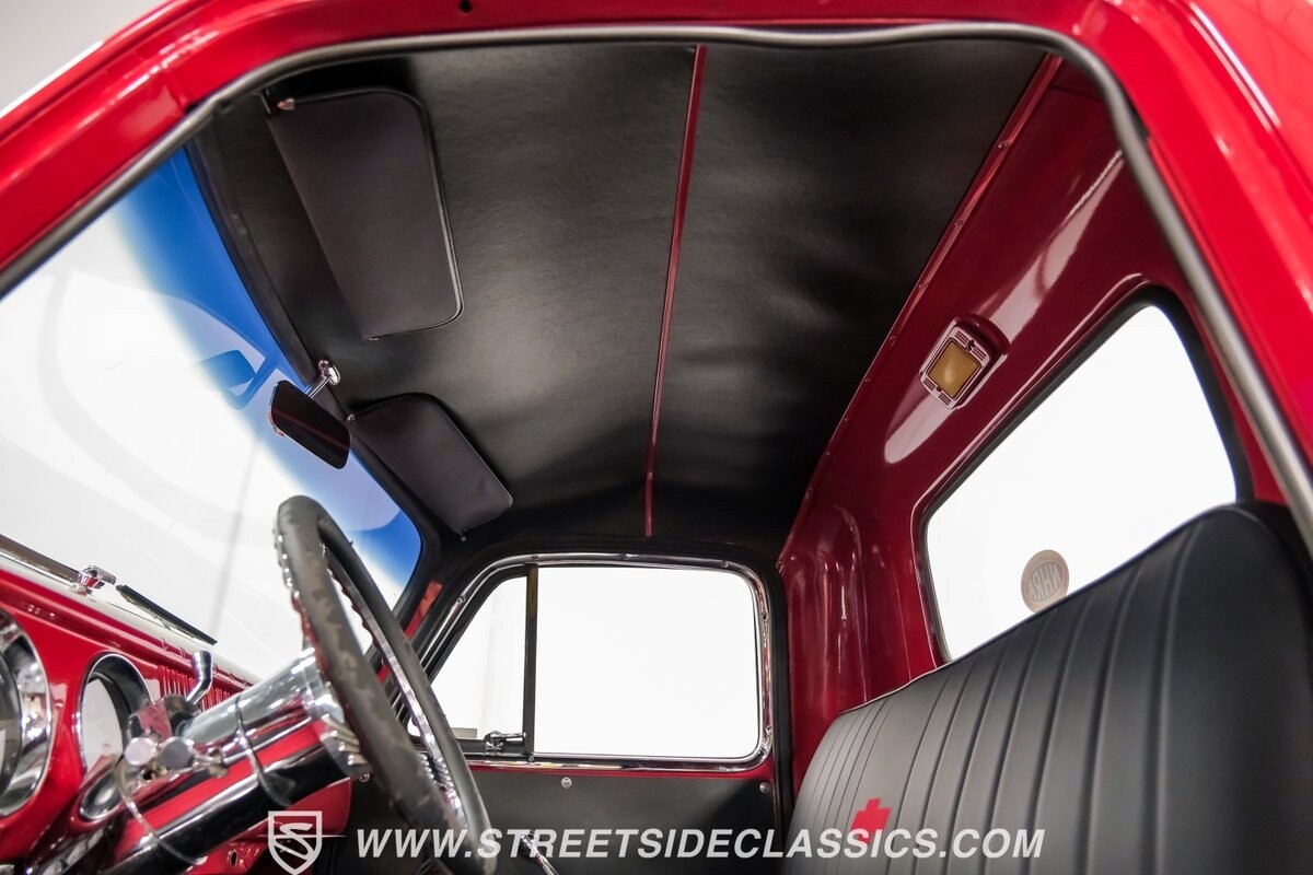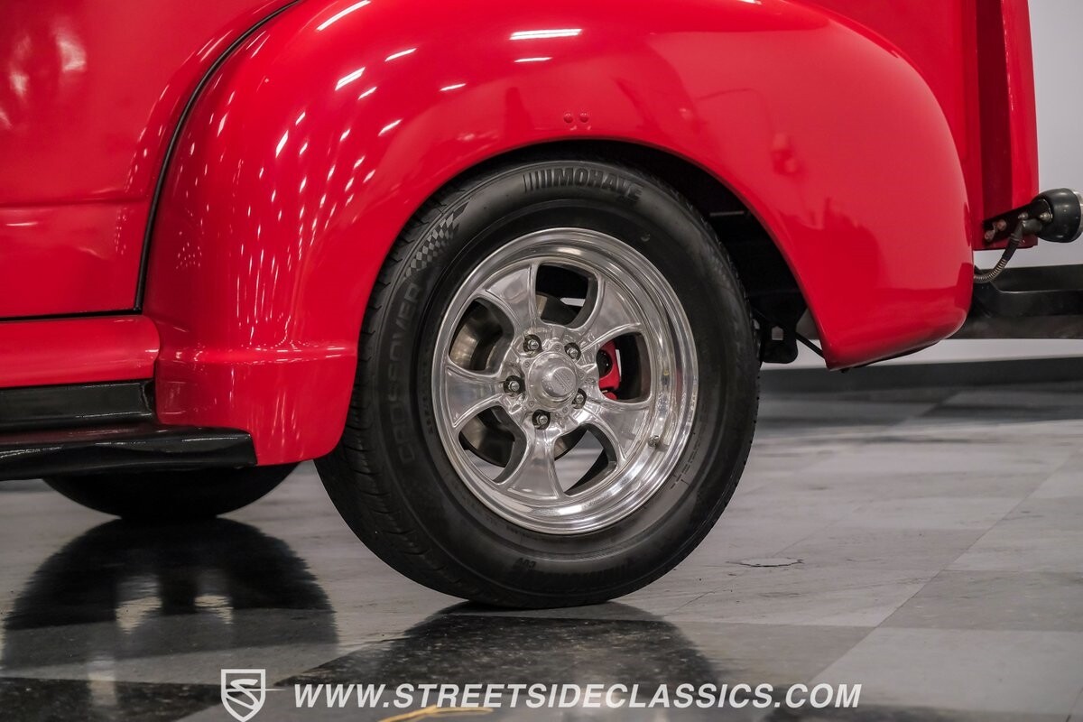This vibrant 1954 Chevrolet 3100 3 Window pickup is a true embodiment of classic American style. Sporting a Viper Red paint that's as bold as it is beautiful, this truck is sure to capture attention wherever it roams. The vivid hue is complemented by 16" American Racing wheels wrapped in staggered 215/65R16 and 235/60R16 tires, providing both a striking look and a confident grip on the asphalt. Professionally restored, the left rear fender was replaced to accommodate the spare tire, resulting in a seamless and authentic appearance.