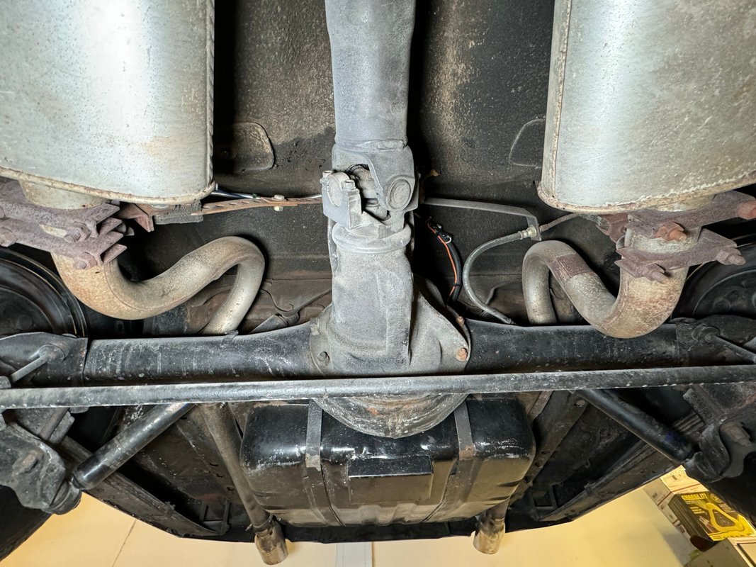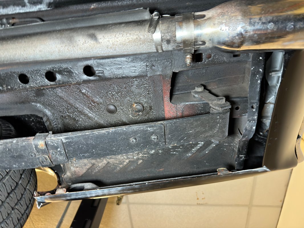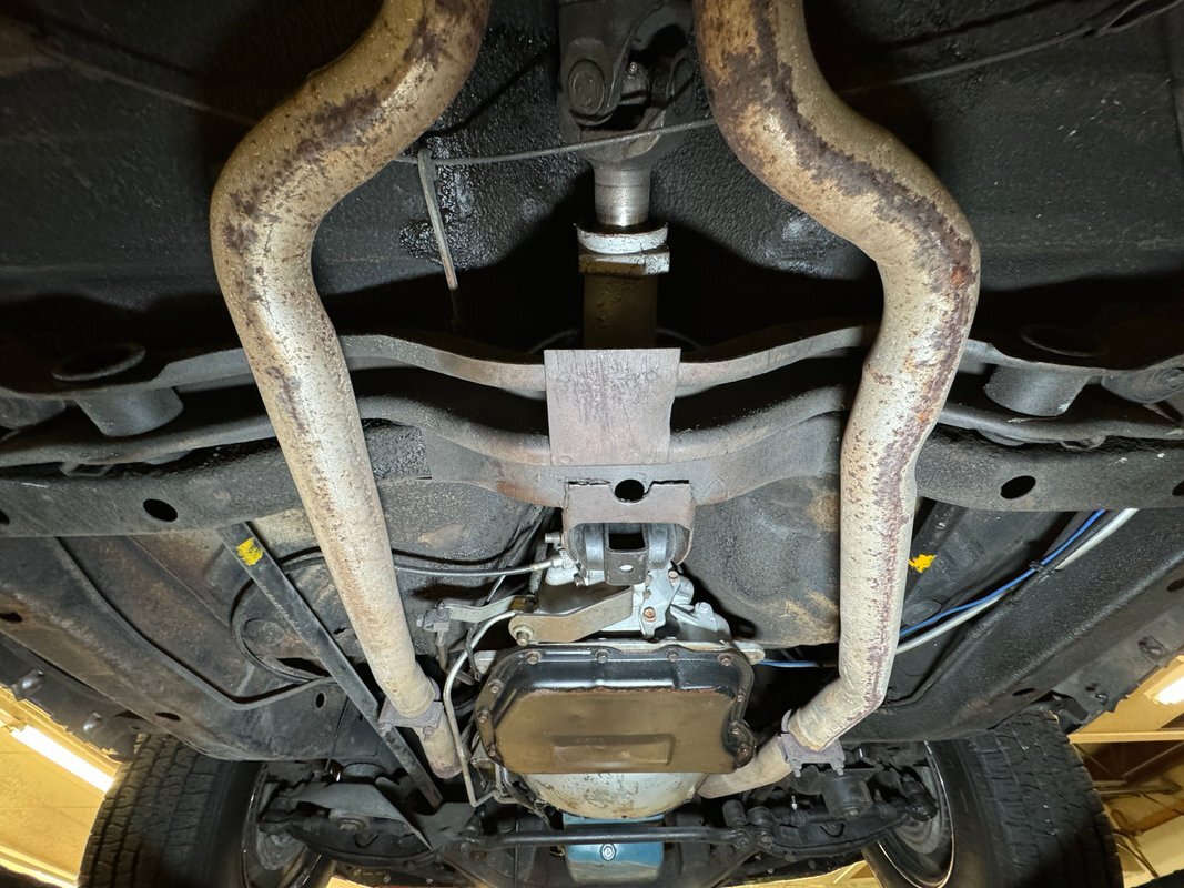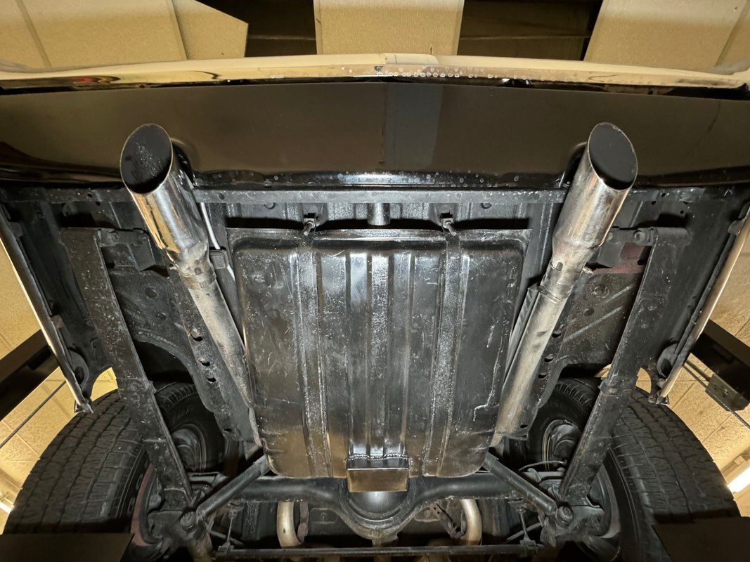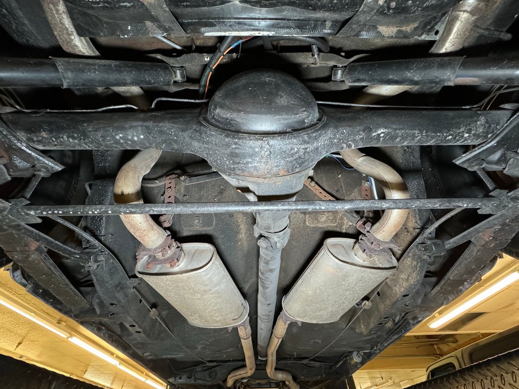 The underside is clean and dry, relatively driver quality, with only a few incidences of surface rust and no errant fluids or grease build up to be found. The dual exhaust meets stock style mufflers before bellowing to the outside via chrome tips. Torsion bar suspension is found up front and leaf springs in back.