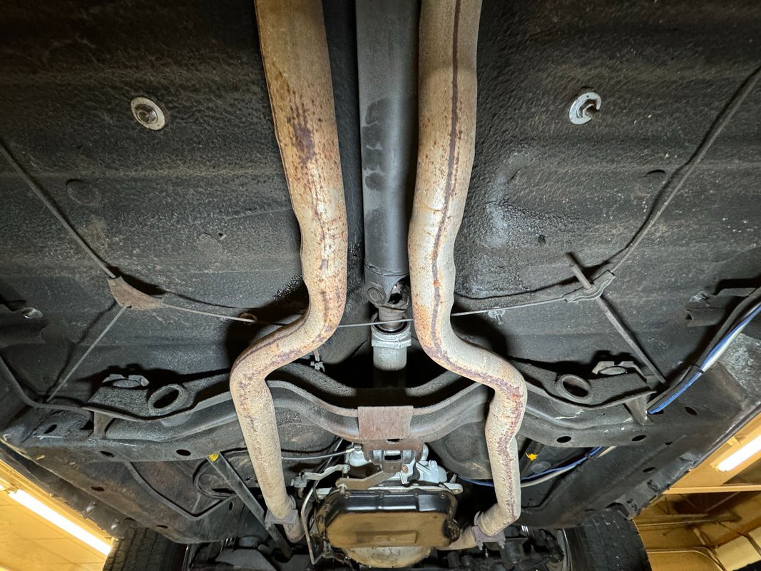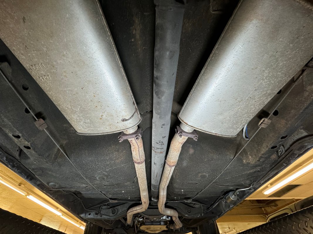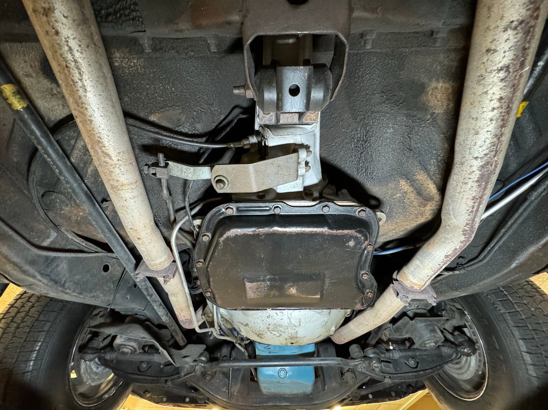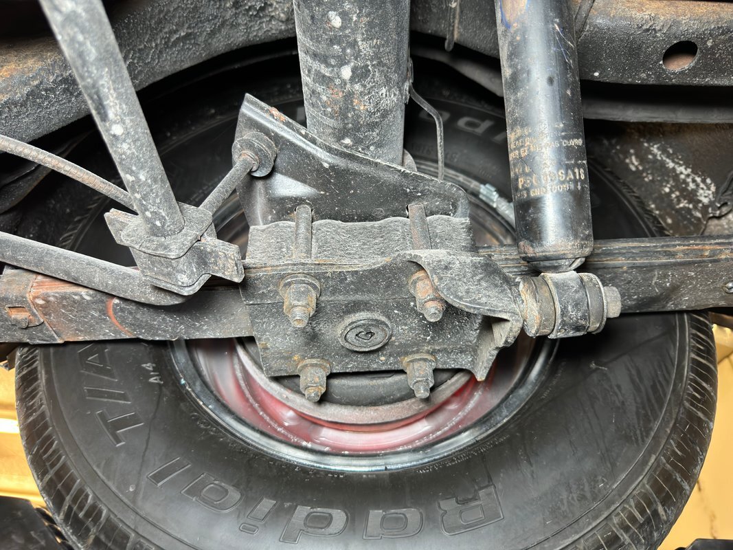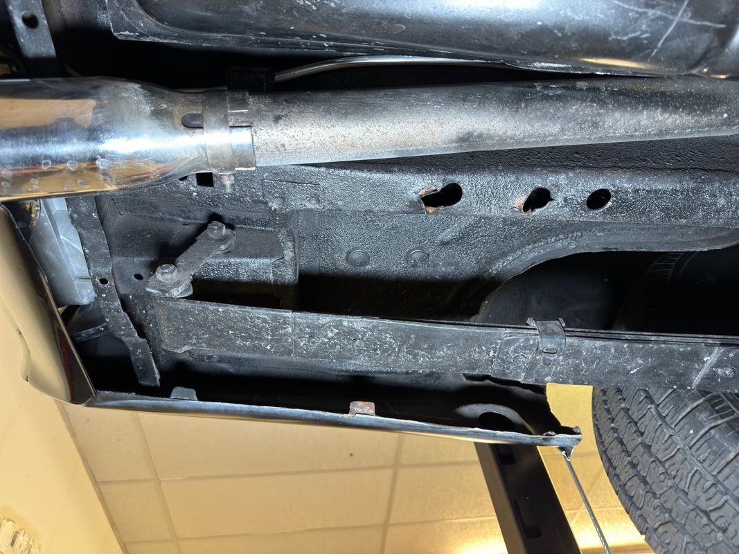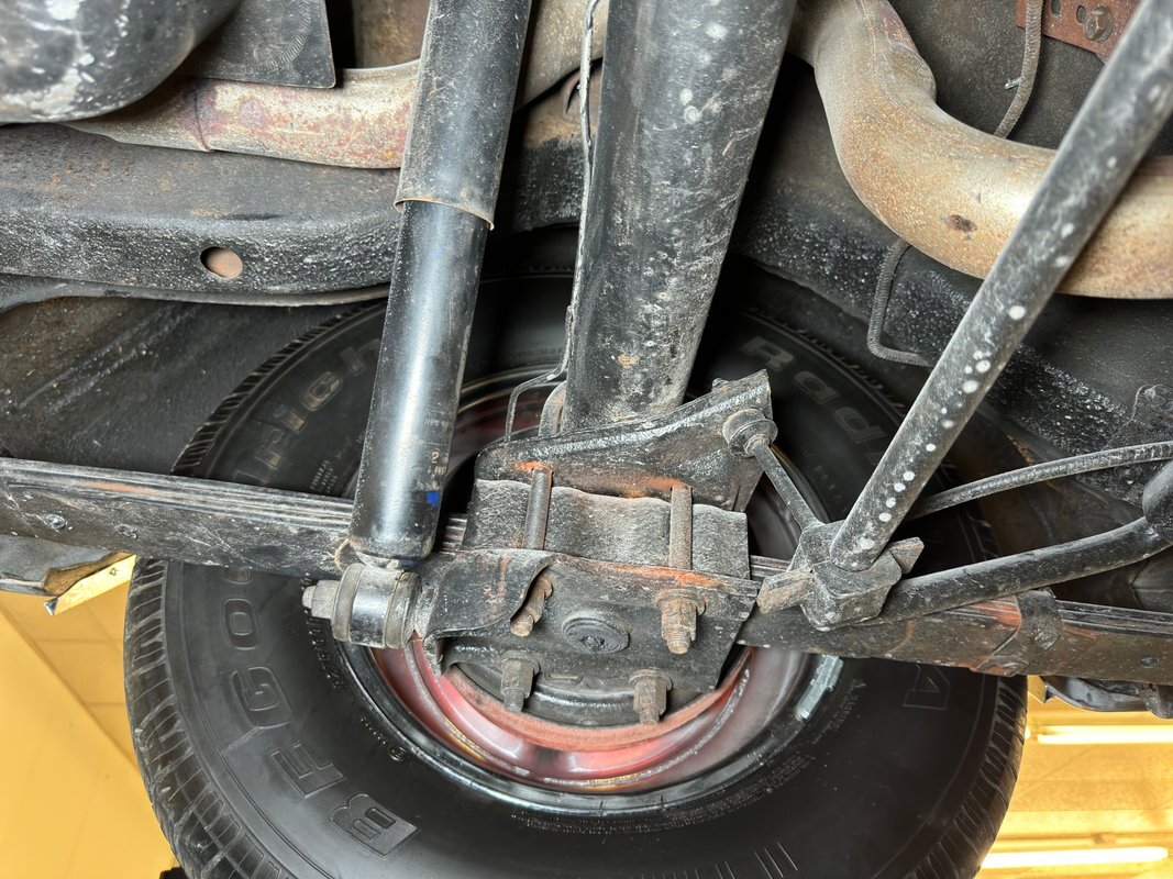 The underside is clean and dry, relatively driver quality, with only a few incidences of surface rust and no errant fluids or grease build up to be found. The dual exhaust meets stock style mufflers before bellowing to the outside via chrome tips. Torsion bar suspension is found up front and leaf springs in back.