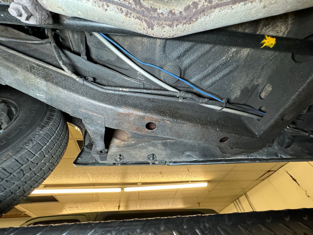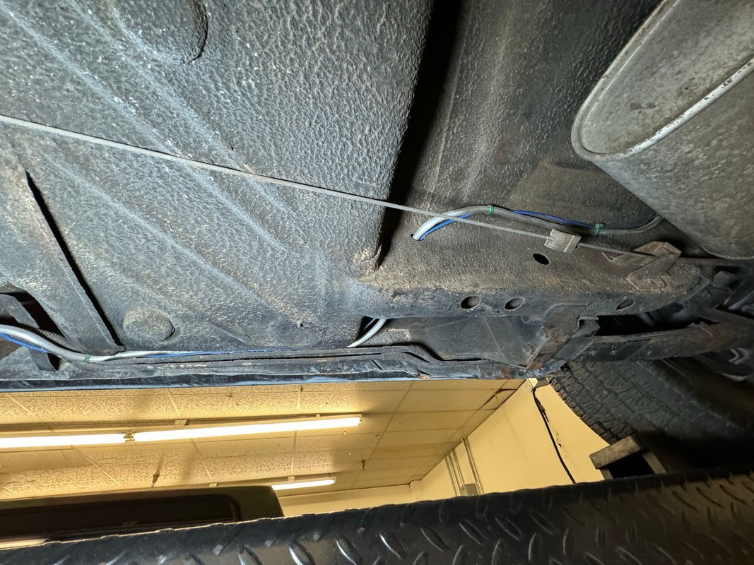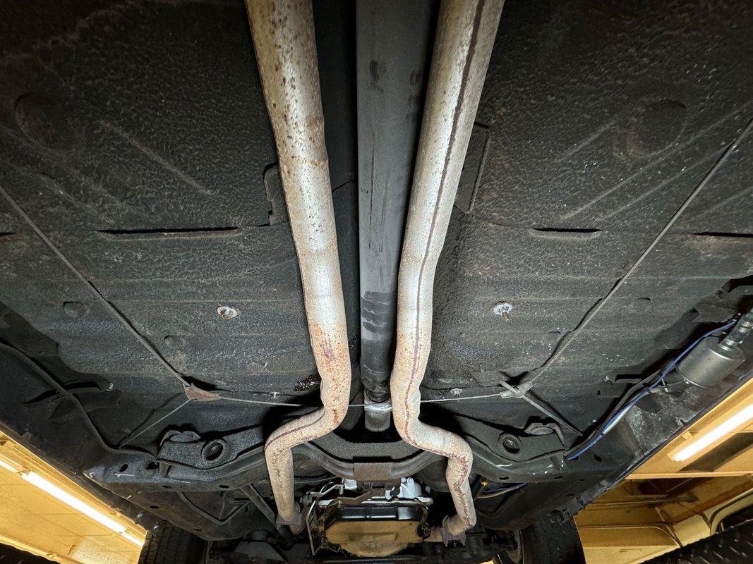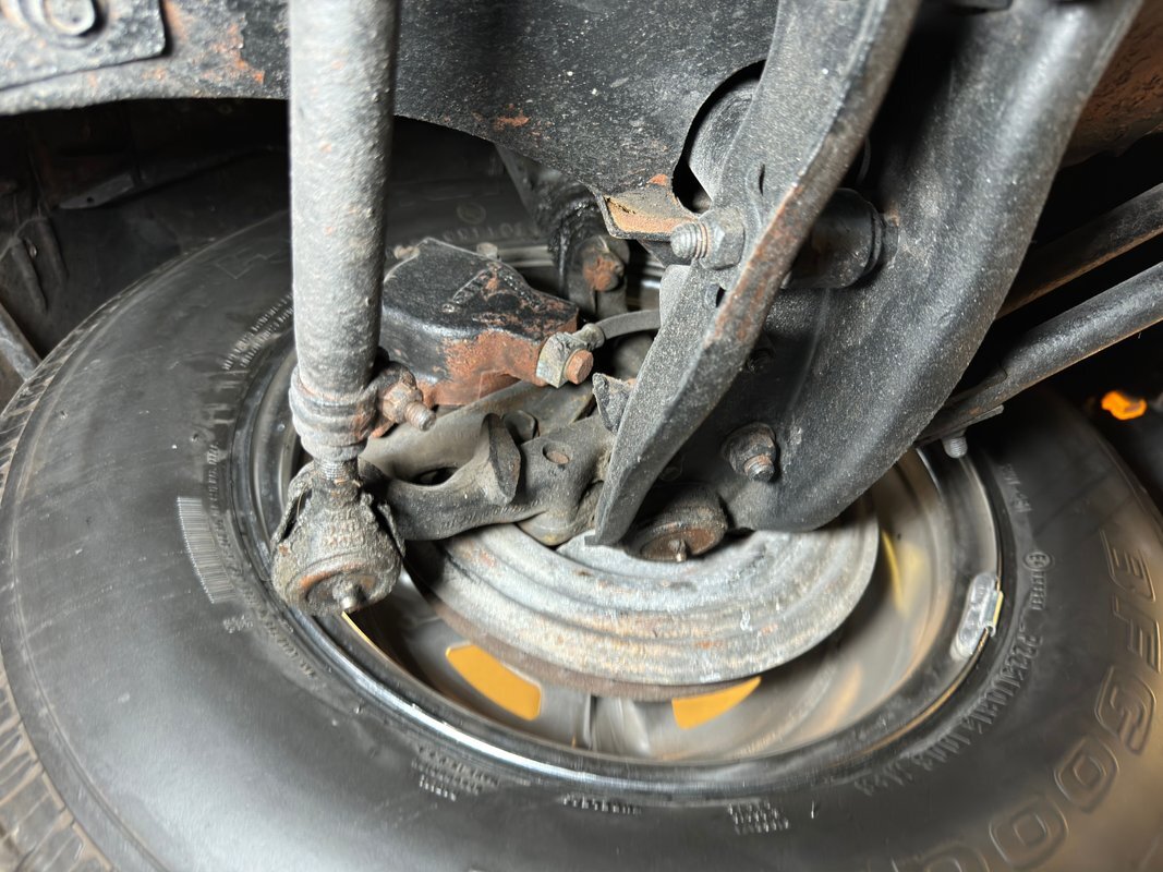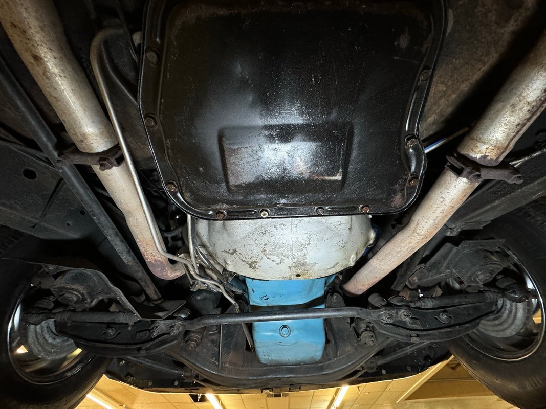 The underside is clean and dry, relatively driver quality, with only a few incidences of surface rust and no errant fluids or grease build up to be found. The dual exhaust meets stock style mufflers before bellowing to the outside via chrome tips. Torsion bar suspension is found up front and leaf springs in back.