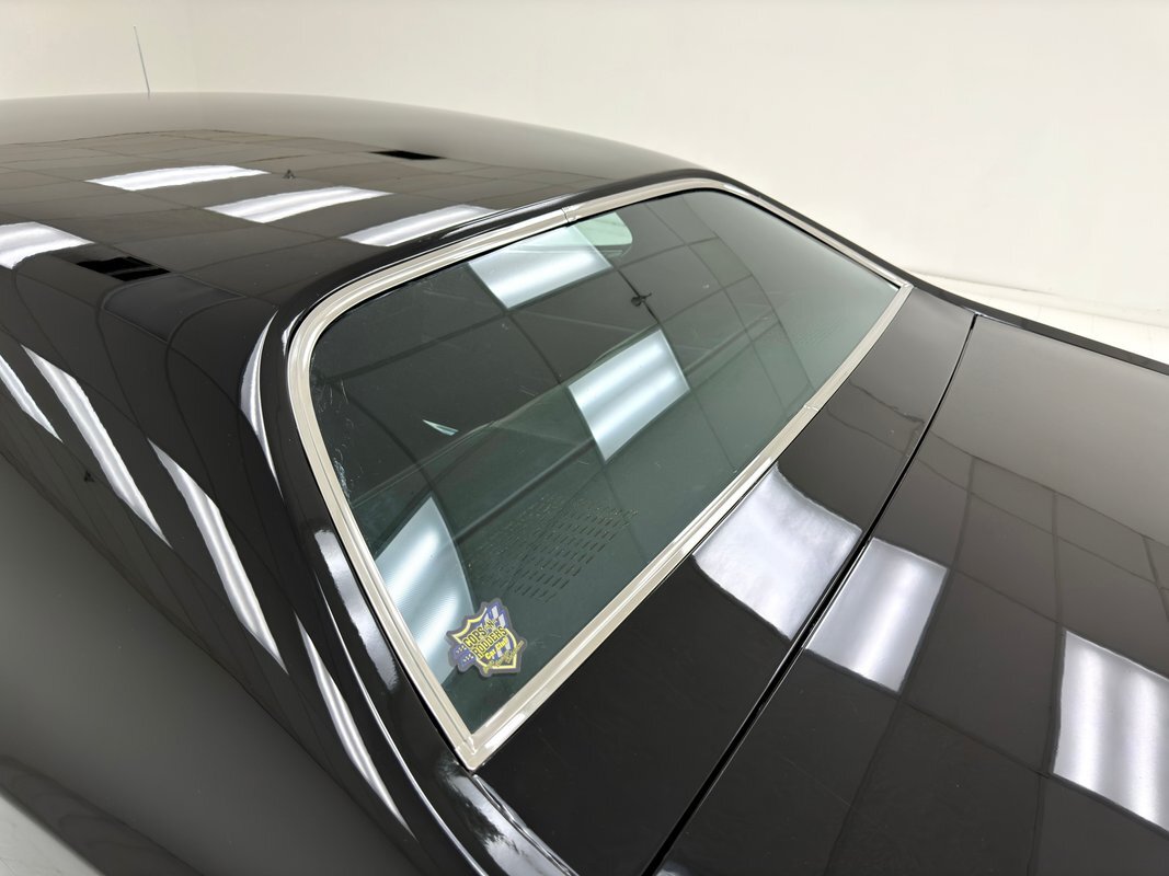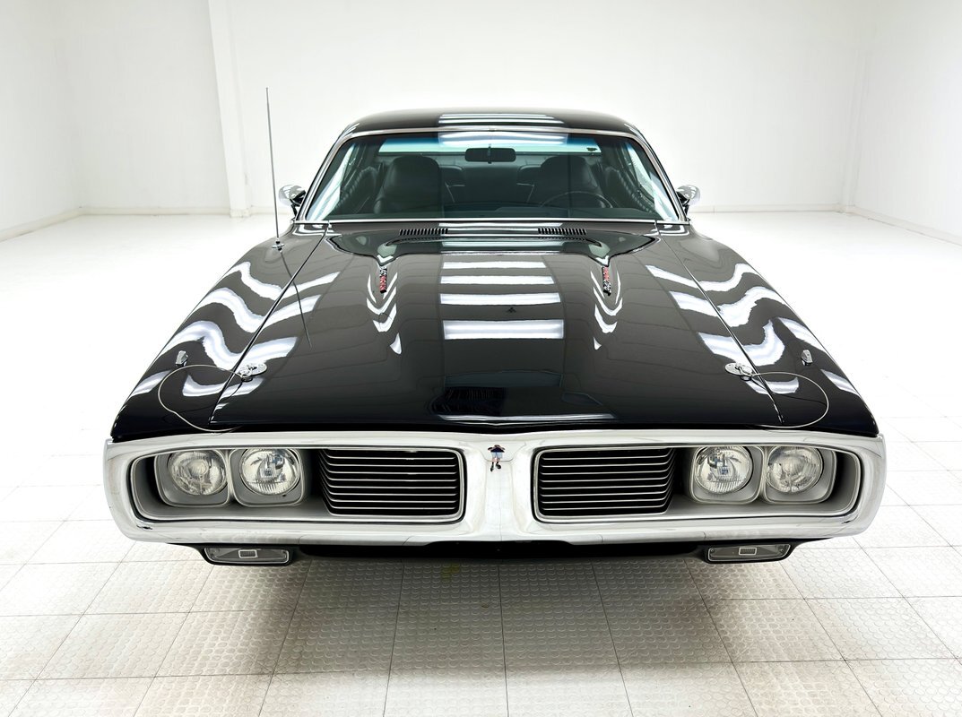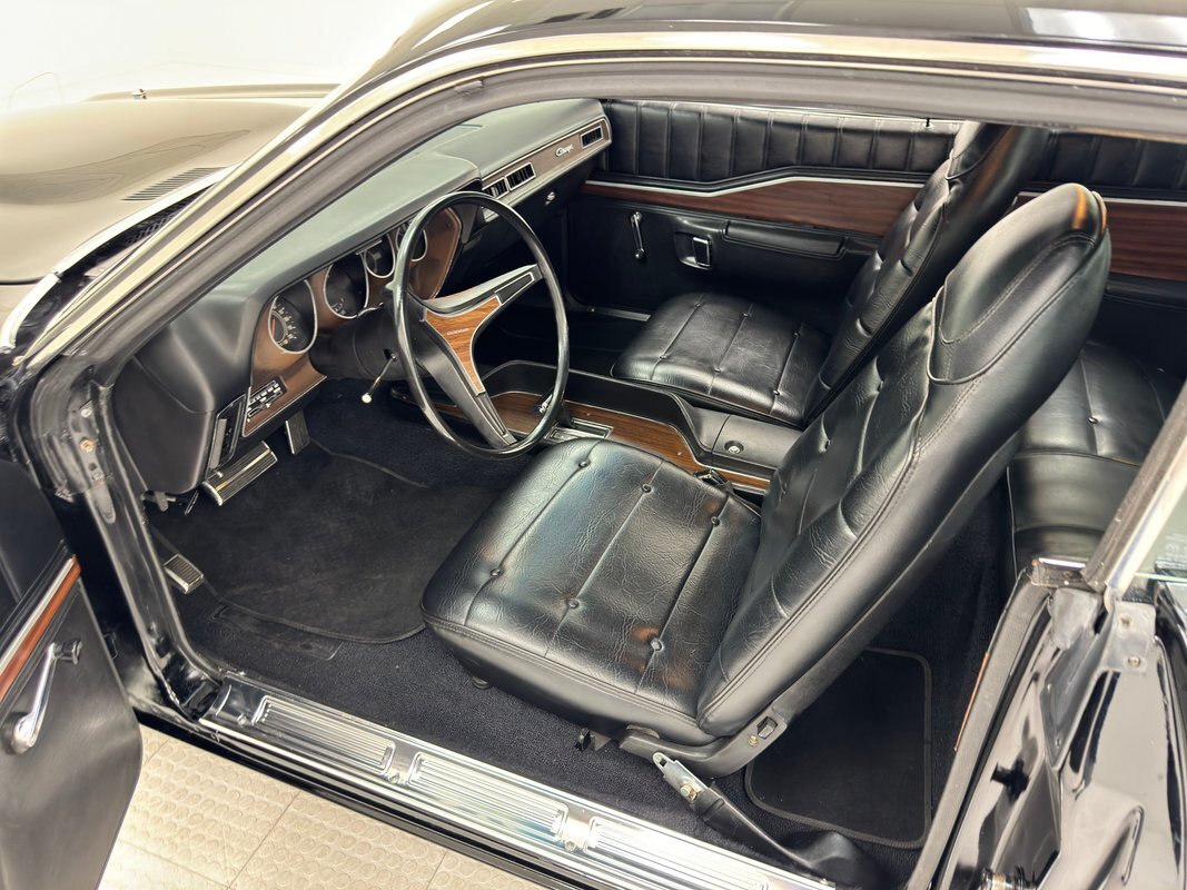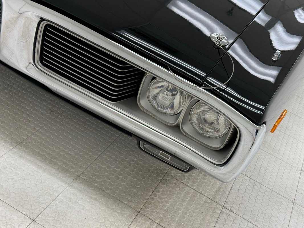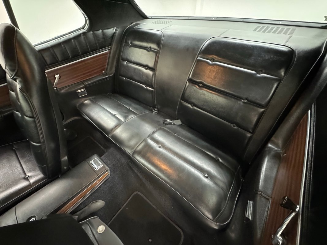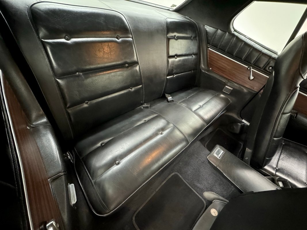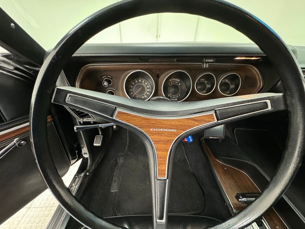 The fantastic face has dual headlights next to a cove formed by the horizontal grille that is boxed and flanks a chrome nose that is the hub of the surrounding trim. Behind it, a hood that screams muscle car with hood pins from the factory, a power bulge, and 340 Magnum on the raised portion. Cowl vents are cut into the hood, not on a separate cowl piece like so many cars. The polished window trim, as the chrome bumpers, are in excellent condition and that shine is picked up flawlessly by the side mirrors, the door handles, and the rear bumper. And while we're in the back, let's note that upturned tail, a slight but integrated rear wing over the vertical rows of the segmented tail lights over big chrome exhaust tips. Everything back here is intimidatingly muscular and intended to give the competition something cool to look at. New 15-inch Magnum 500 wheels present nicely with their black inserts matching the car, and the wheel openings are augmented by polished trim. We could not find any glaring imperfections on the exterior on this mean looking B-body.