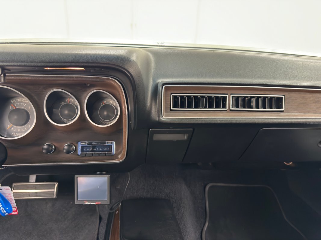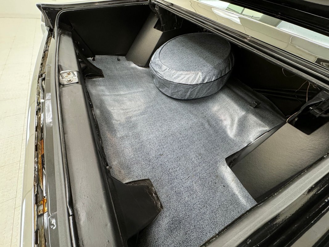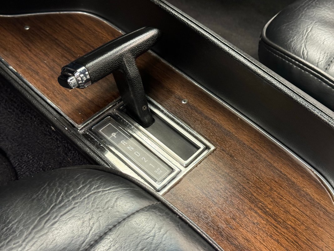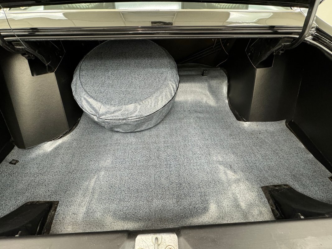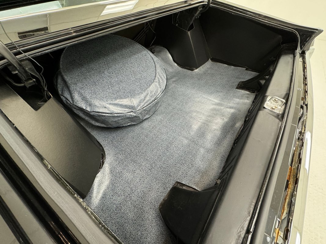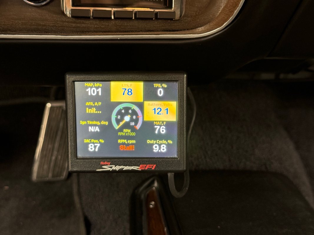 A wood applique, shaped a bit like the stock of a rifle, adorns the door and this won't be the last of the woodgrain we see. Meanwhile the pleated top and lower plastic panel of both doors looks great and shows no wear. Tall bucket seats with button trim also look fresh and particularly sporty. The rear bench in back shows a satin shine from non use and the wood of the doors continues on the sidewalls. A 3 spoke steering wheel leads to a deeply inset gauge pod with a compact arrangement of dials, switches, the A/C panel, and AM/FM radio. A Holley Sniper EFI screen and controller is mounted just under the dashboard, offering the only non stock appearing item on the clean interior. A faux woodgrain base houses the shifter in the center console which has a high right border to favor the driver and below it, black loop carpet covers the floor cleanly. The headliner is a bit wavy but intact, and the trunk is lined with a fitted mat and the same material covers the spare.