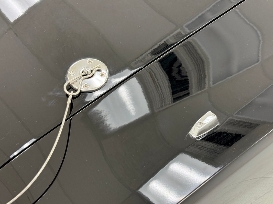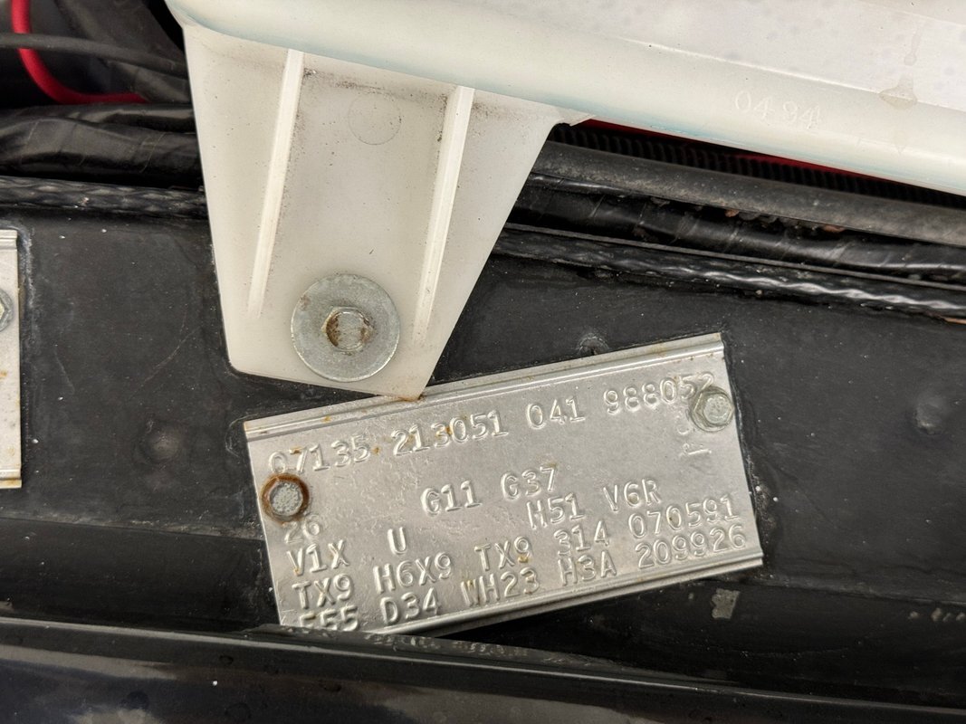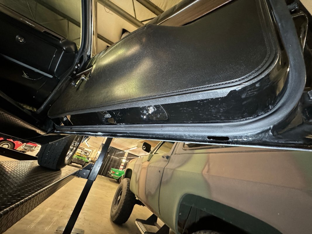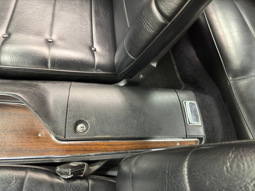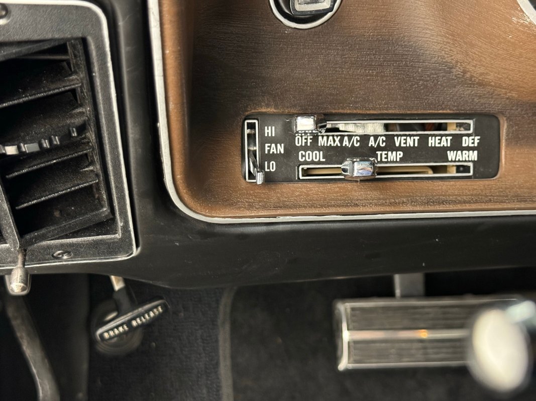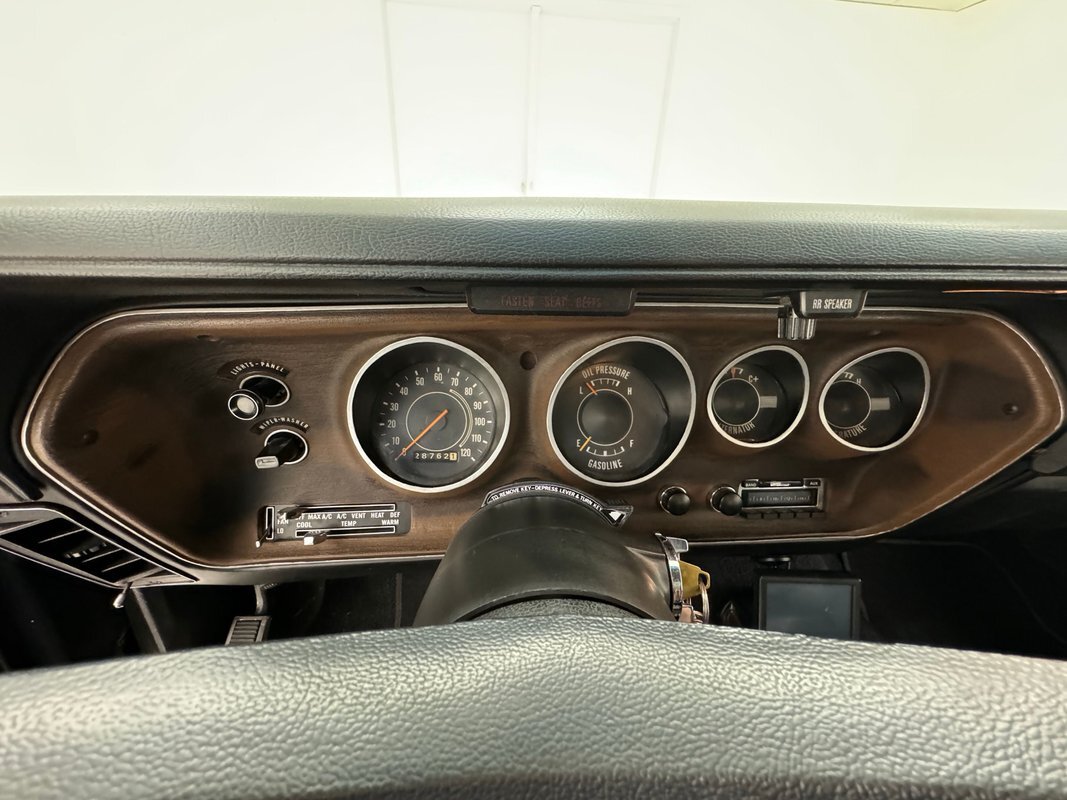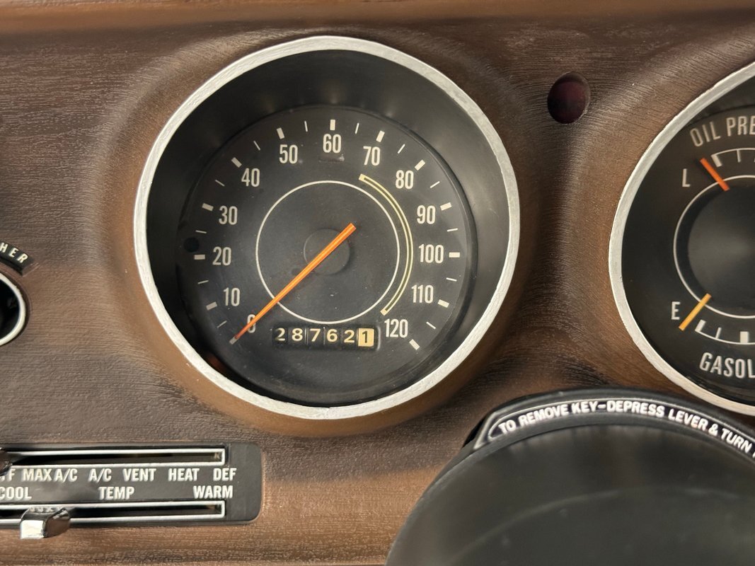 A wood applique, shaped a bit like the stock of a rifle, adorns the door and this won't be the last of the woodgrain we see. Meanwhile the pleated top and lower plastic panel of both doors looks great and shows no wear. Tall bucket seats with button trim also look fresh and particularly sporty. The rear bench in back shows a satin shine from non use and the wood of the doors continues on the sidewalls. A 3 spoke steering wheel leads to a deeply inset gauge pod with a compact arrangement of dials, switches, the A/C panel, and AM/FM radio. A Holley Sniper EFI screen and controller is mounted just under the dashboard, offering the only non stock appearing item on the clean interior. A faux woodgrain base houses the shifter in the center console which has a high right border to favor the driver and below it, black loop carpet covers the floor cleanly. The headliner is a bit wavy but intact, and the trunk is lined with a fitted mat and the same material covers the spare.