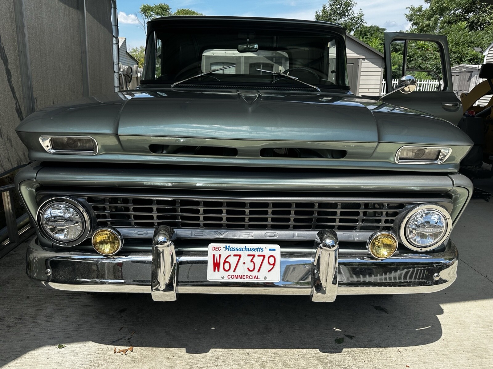 1963 Chevrolet C-10 fleet side pickup truck green metallic with gunmetal gray interior.