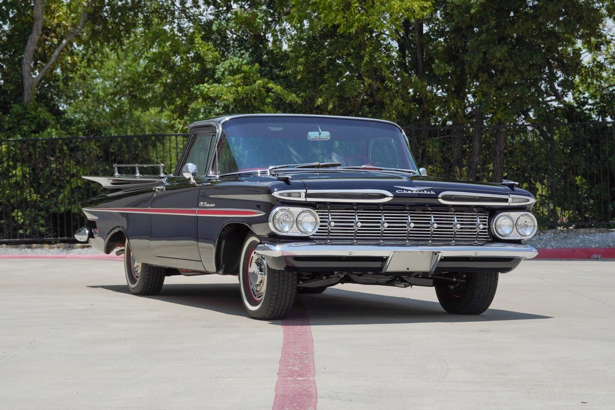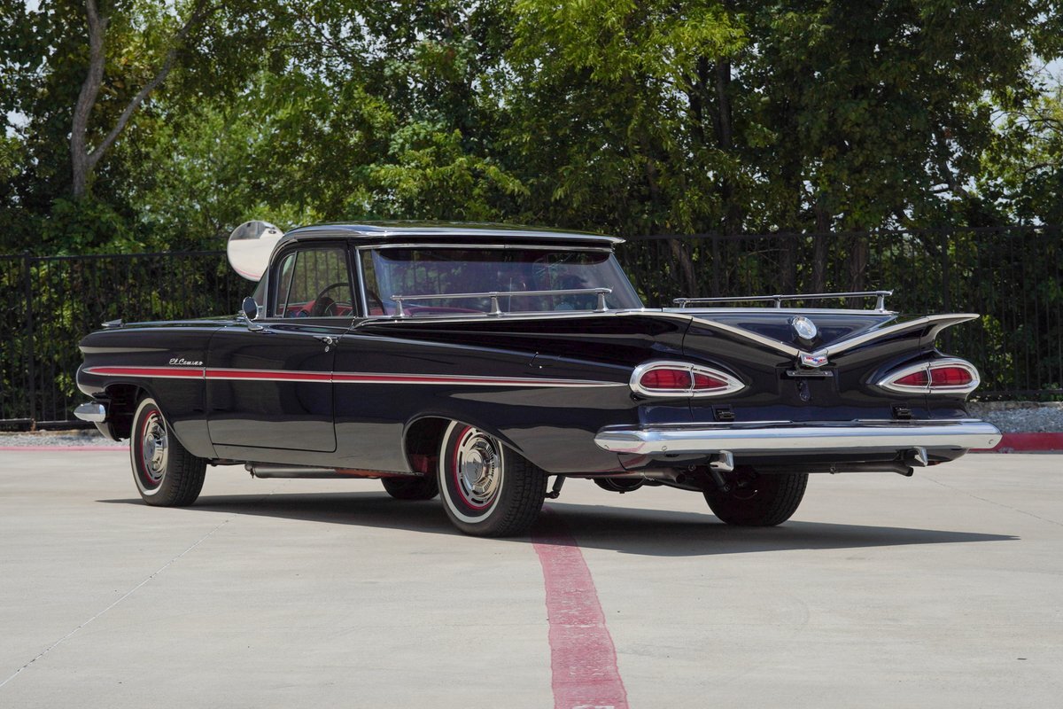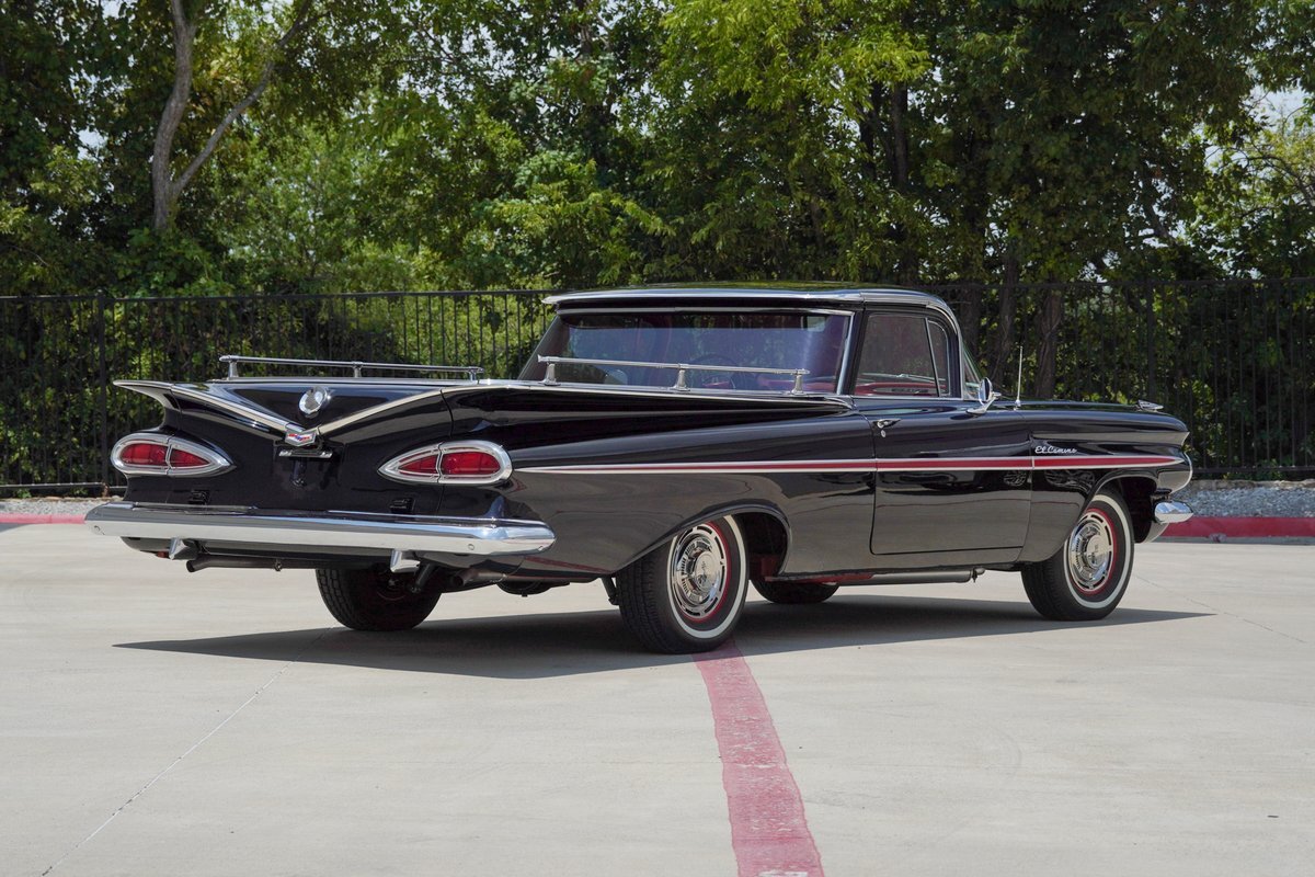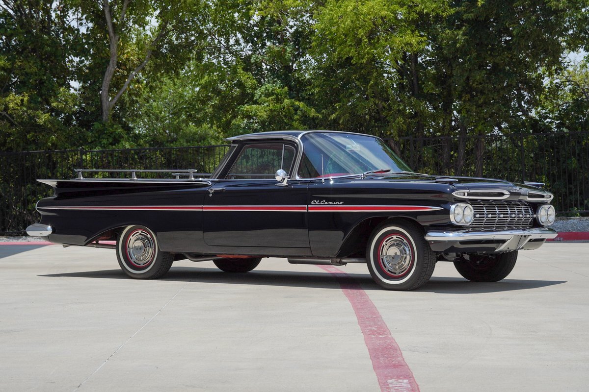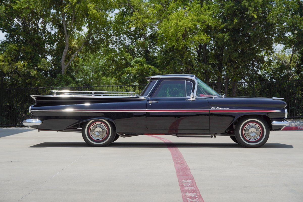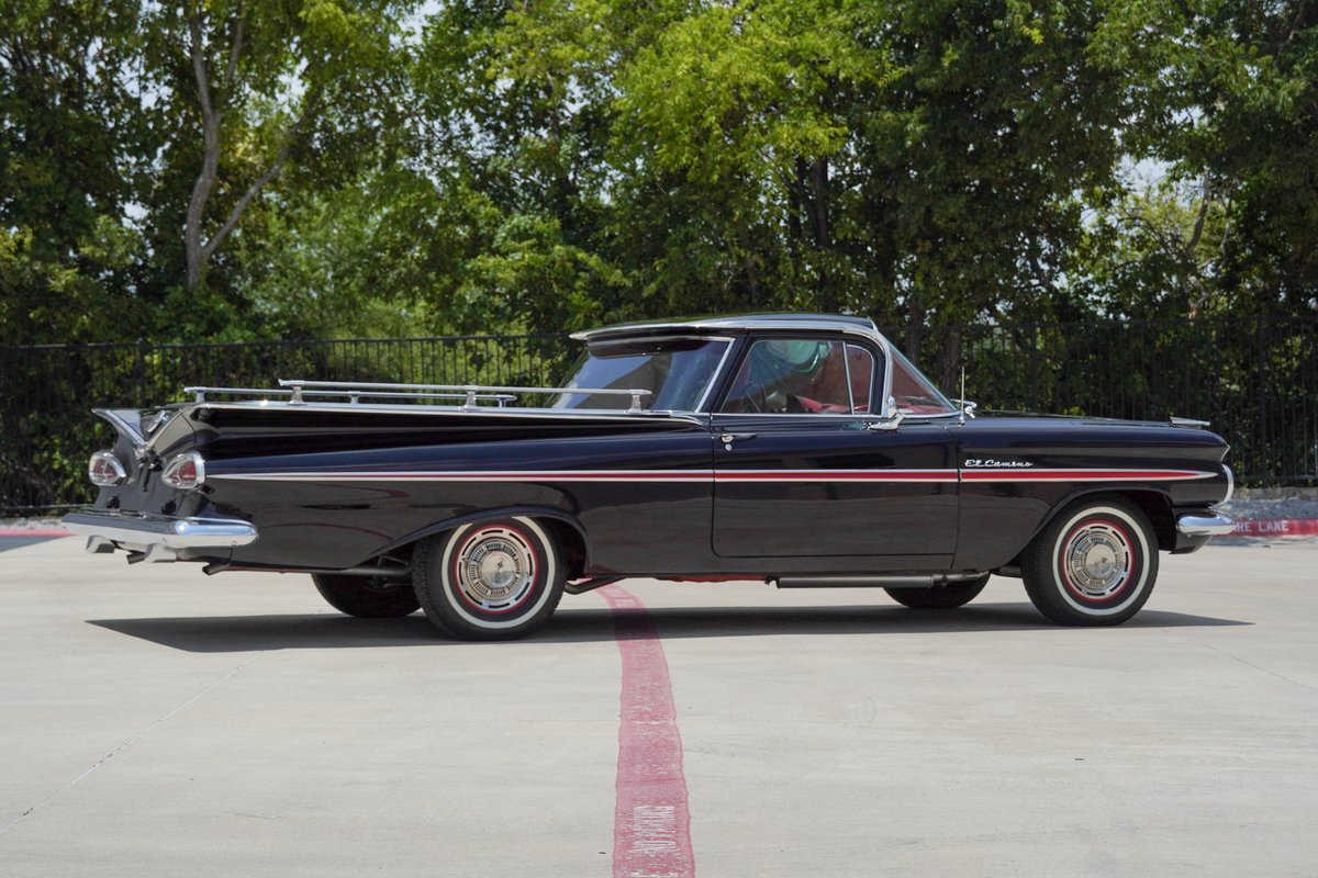 This 1959 Chevrolet El Camino was refurbished under prior ownership and is finished in black over a red interior. Power is provided by a 283ci paired with a two-speed Powerglide automatic transmission, and features include red-accented moldings and chrome bed rails. It is also equipped with an AM radio, a heater, a bench seat, and red and black carpets. The body was refinished in black during the refurbishment in 2019 and features red-accented side moldings, chrome bed rails, and "cat's eye" taillights. Braking is handled by drums at all four corners. The front bench seat is upholstered in red vinyl and is joined by a color-coordinated dashboard, headliner, and door panels. Equipment includes a heater, a push-button radio, and red and black carpets. The two-spoke steering wheel has a chrome horn ring and frames a 120-mph speedometer and auxiliary gauges. The five-digit odometer shows 1k miles, which is said to be the mileage added since the refurbishment. The 283ci V8 features a Rochester carburetor and an orange-finished engine block, intake manifold, and valve covers. Power is delivered to the rear wheels through a replacement aluminum Powerglide two-speed automatic transmission.