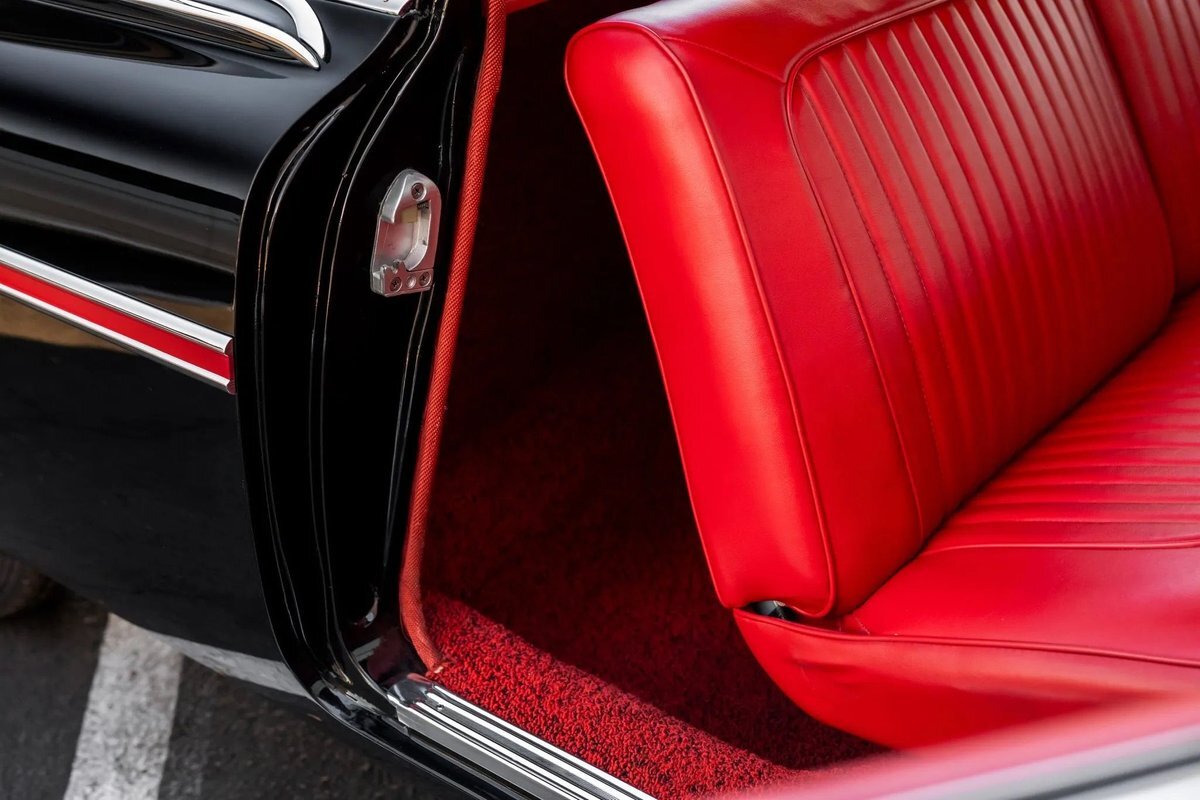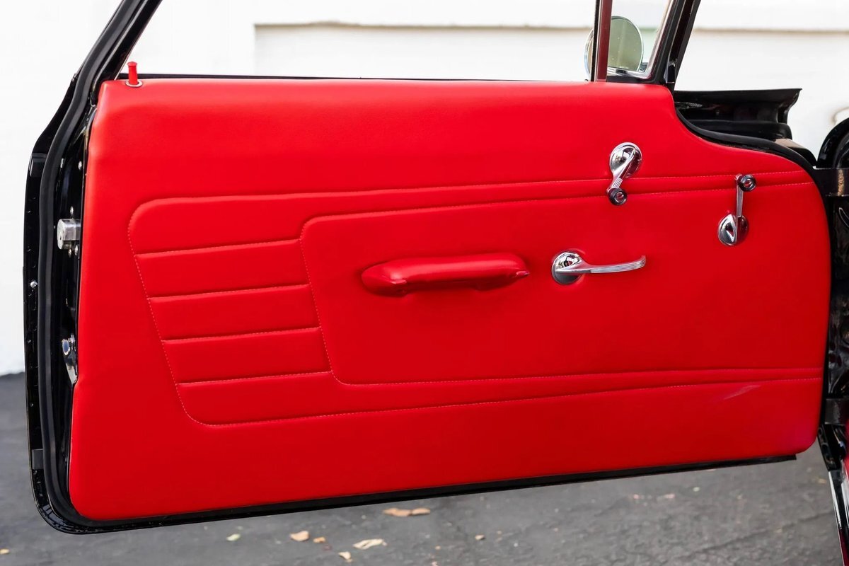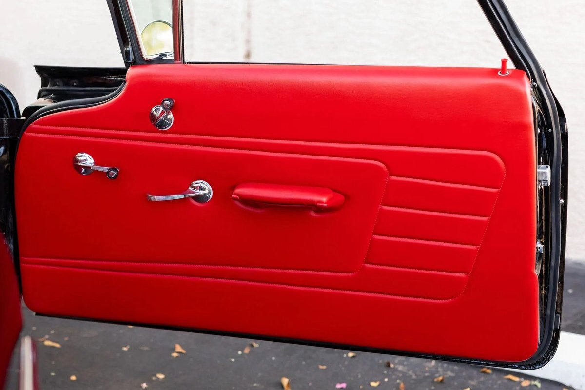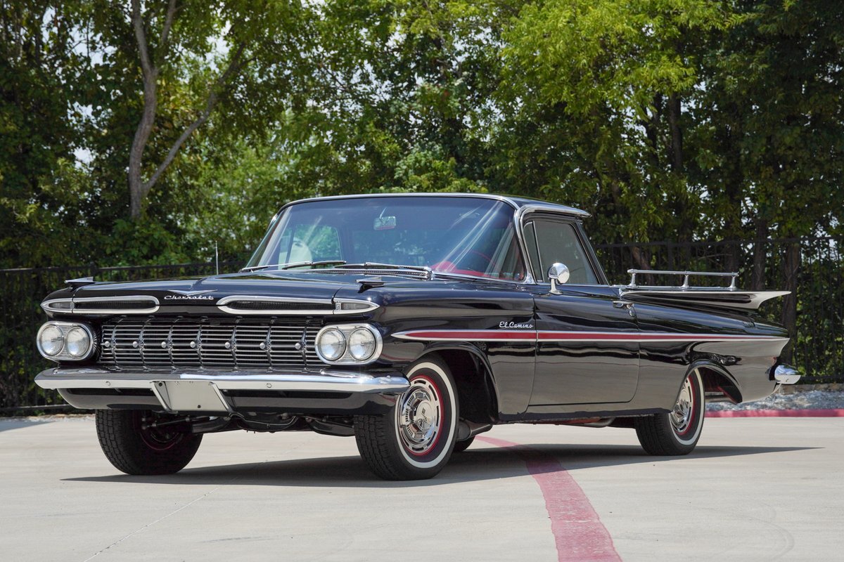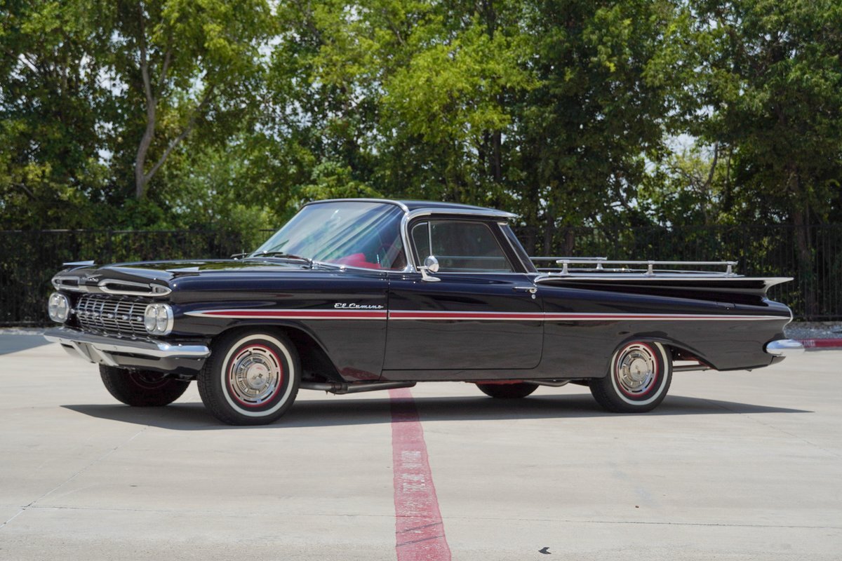 This 1959 Chevrolet El Camino was refurbished under prior ownership and is finished in black over a red interior. Power is provided by a 283ci paired with a two-speed Powerglide automatic transmission, and features include red-accented moldings and chrome bed rails. It is also equipped with an AM radio, a heater, a bench seat, and red and black carpets. The body was refinished in black during the refurbishment in 2019 and features red-accented side moldings, chrome bed rails, and "cat's eye" taillights. Braking is handled by drums at all four corners. The front bench seat is upholstered in red vinyl and is joined by a color-coordinated dashboard, headliner, and door panels. Equipment includes a heater, a push-button radio, and red and black carpets. The two-spoke steering wheel has a chrome horn ring and frames a 120-mph speedometer and auxiliary gauges. The five-digit odometer shows 1k miles, which is said to be the mileage added since the refurbishment. The 283ci V8 features a Rochester carburetor and an orange-finished engine block, intake manifold, and valve covers. Power is delivered to the rear wheels through a replacement aluminum Powerglide two-speed automatic transmission.