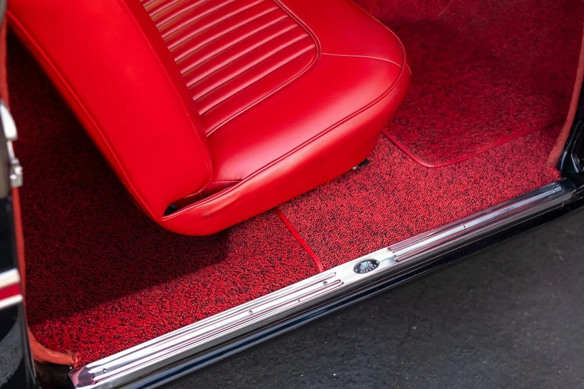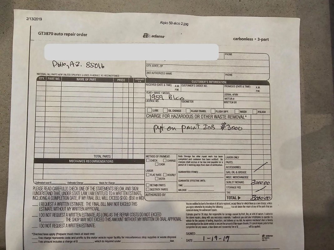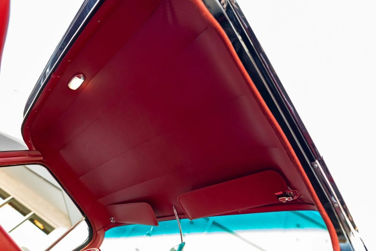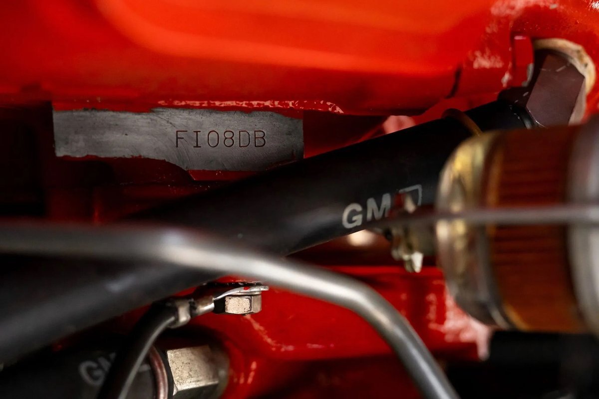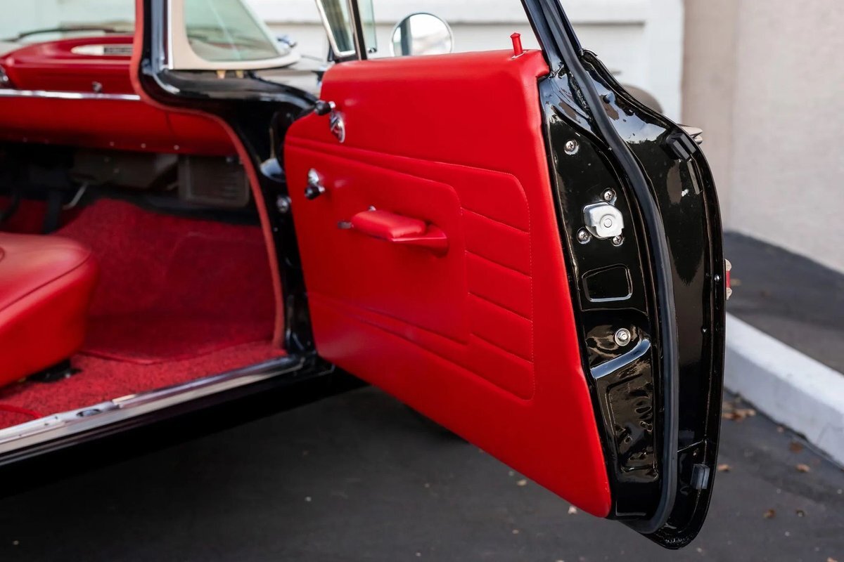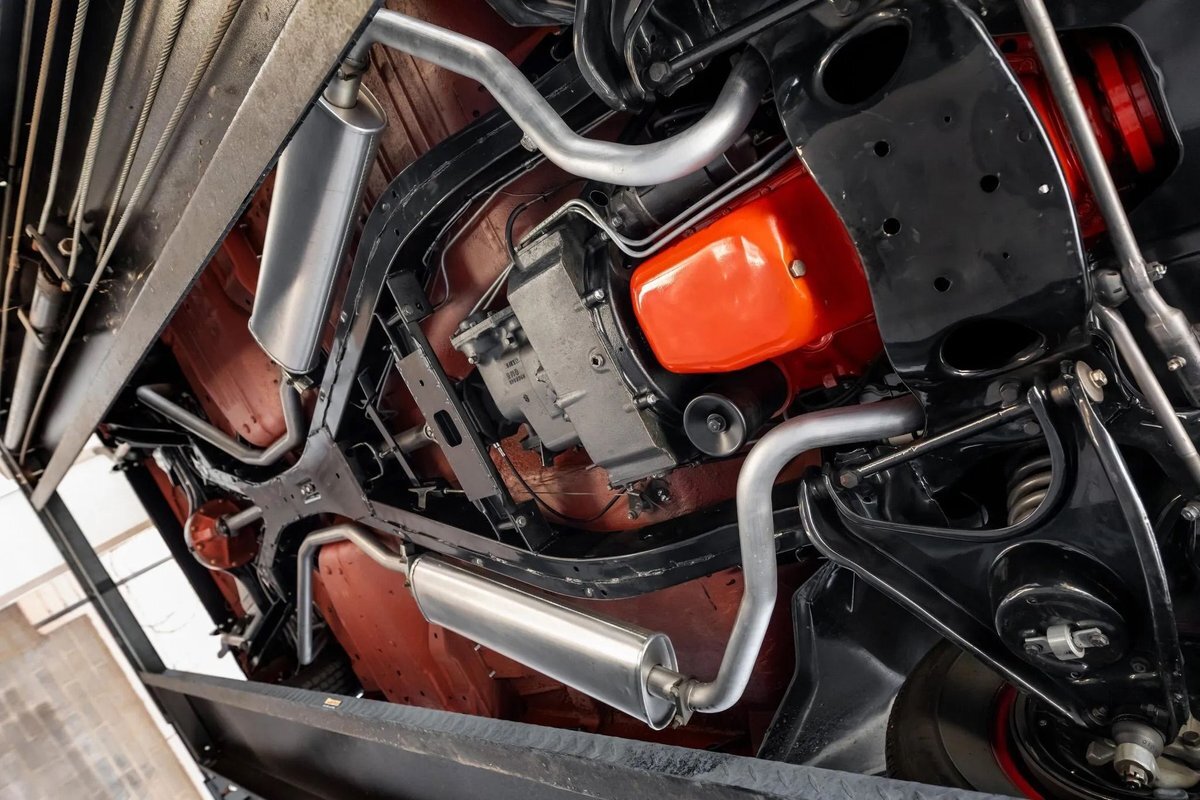 This 1959 Chevrolet El Camino was refurbished under prior ownership and is finished in black over a red interior. Power is provided by a 283ci paired with a two-speed Powerglide automatic transmission, and features include red-accented moldings and chrome bed rails. It is also equipped with an AM radio, a heater, a bench seat, and red and black carpets. The body was refinished in black during the refurbishment in 2019 and features red-accented side moldings, chrome bed rails, and "cat's eye" taillights. Braking is handled by drums at all four corners. The front bench seat is upholstered in red vinyl and is joined by a color-coordinated dashboard, headliner, and door panels. Equipment includes a heater, a push-button radio, and red and black carpets. The two-spoke steering wheel has a chrome horn ring and frames a 120-mph speedometer and auxiliary gauges. The five-digit odometer shows 1k miles, which is said to be the mileage added since the refurbishment. The 283ci V8 features a Rochester carburetor and an orange-finished engine block, intake manifold, and valve covers. Power is delivered to the rear wheels through a replacement aluminum Powerglide two-speed automatic transmission.