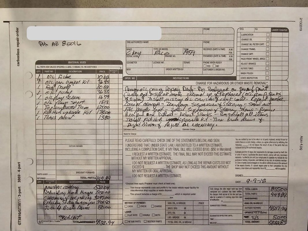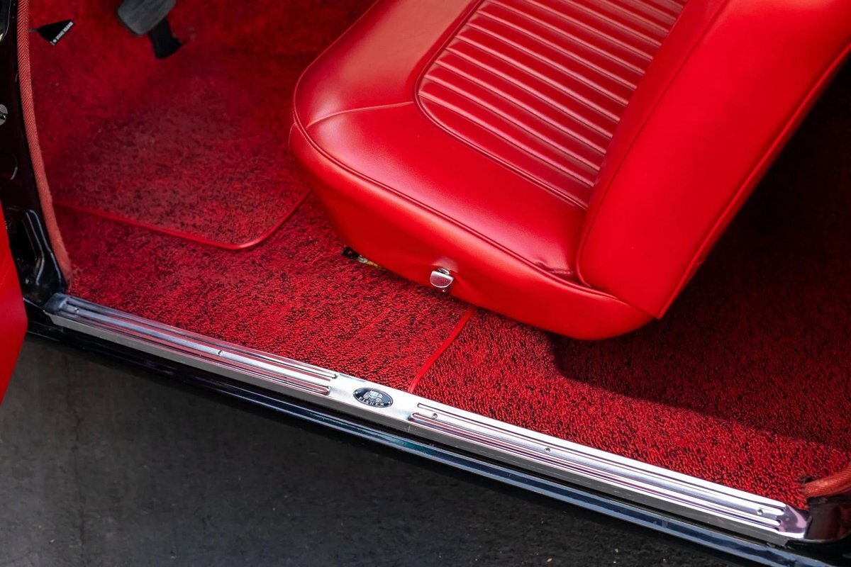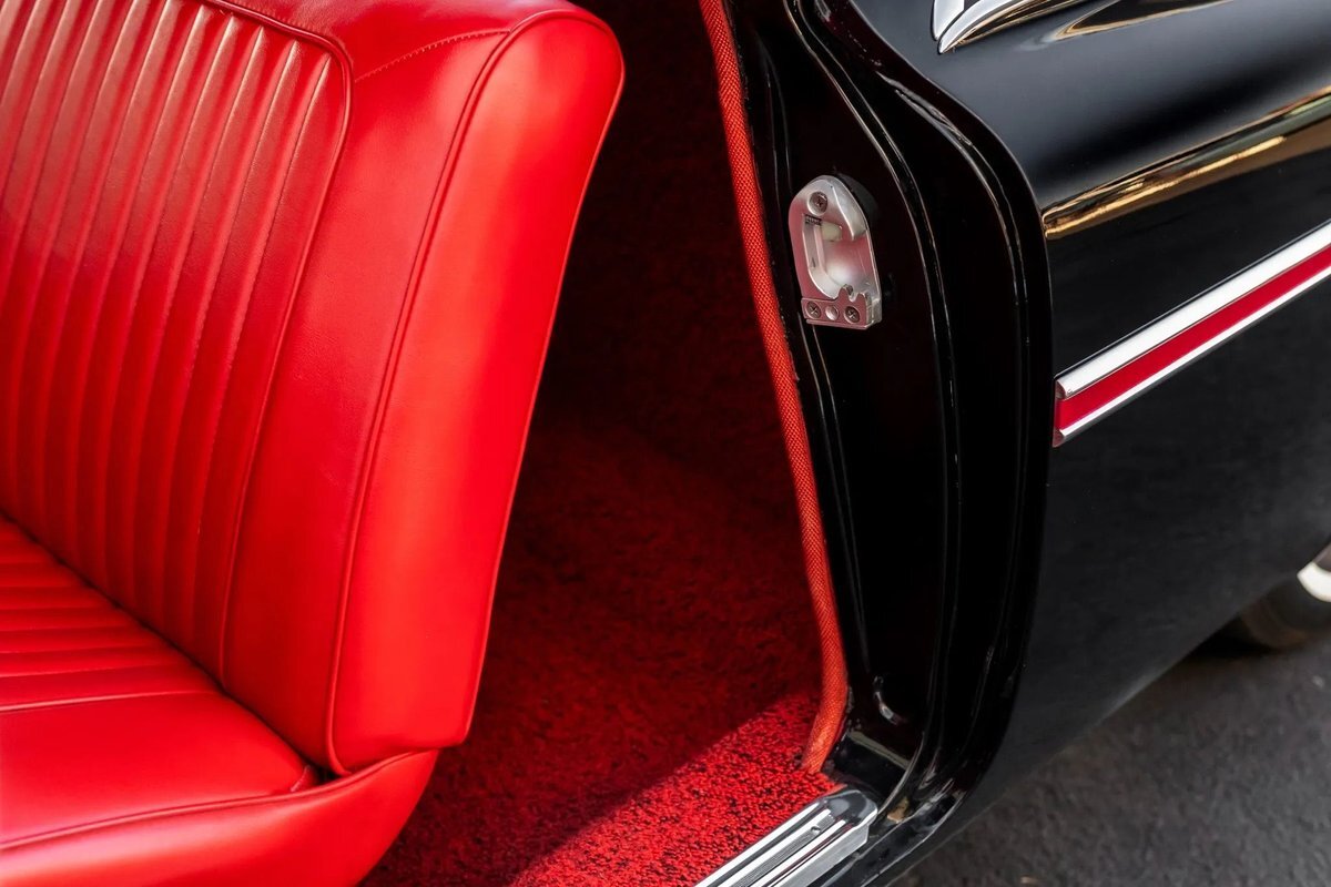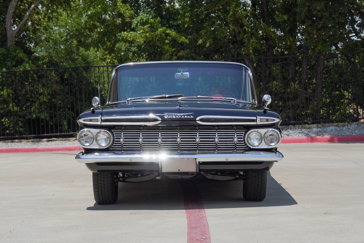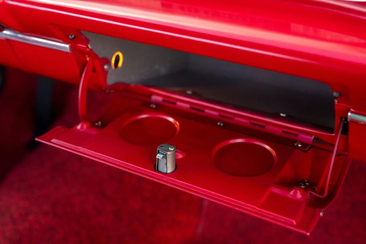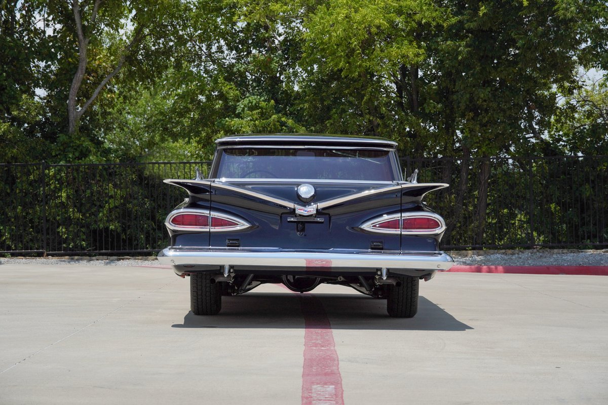 This 1959 Chevrolet El Camino was refurbished under prior ownership and is finished in black over a red interior. Power is provided by a 283ci paired with a two-speed Powerglide automatic transmission, and features include red-accented moldings and chrome bed rails. It is also equipped with an AM radio, a heater, a bench seat, and red and black carpets. The body was refinished in black during the refurbishment in 2019 and features red-accented side moldings, chrome bed rails, and "cat's eye" taillights. Braking is handled by drums at all four corners. The front bench seat is upholstered in red vinyl and is joined by a color-coordinated dashboard, headliner, and door panels. Equipment includes a heater, a push-button radio, and red and black carpets. The two-spoke steering wheel has a chrome horn ring and frames a 120-mph speedometer and auxiliary gauges. The five-digit odometer shows 1k miles, which is said to be the mileage added since the refurbishment. The 283ci V8 features a Rochester carburetor and an orange-finished engine block, intake manifold, and valve covers. Power is delivered to the rear wheels through a replacement aluminum Powerglide two-speed automatic transmission.