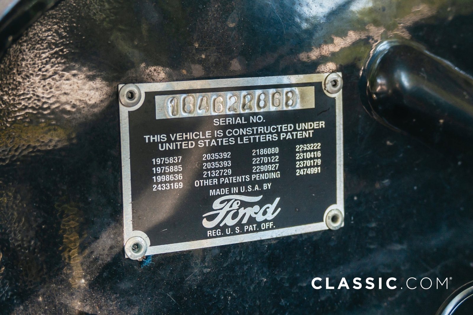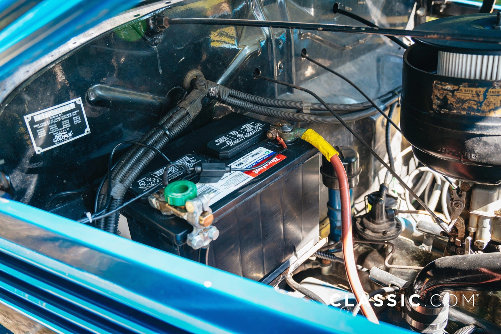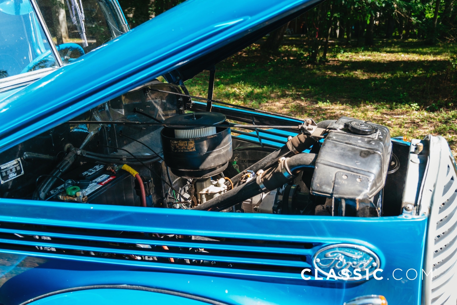 A rebuilt Ford Flathead V8 engine and floor-mounted manual transmission