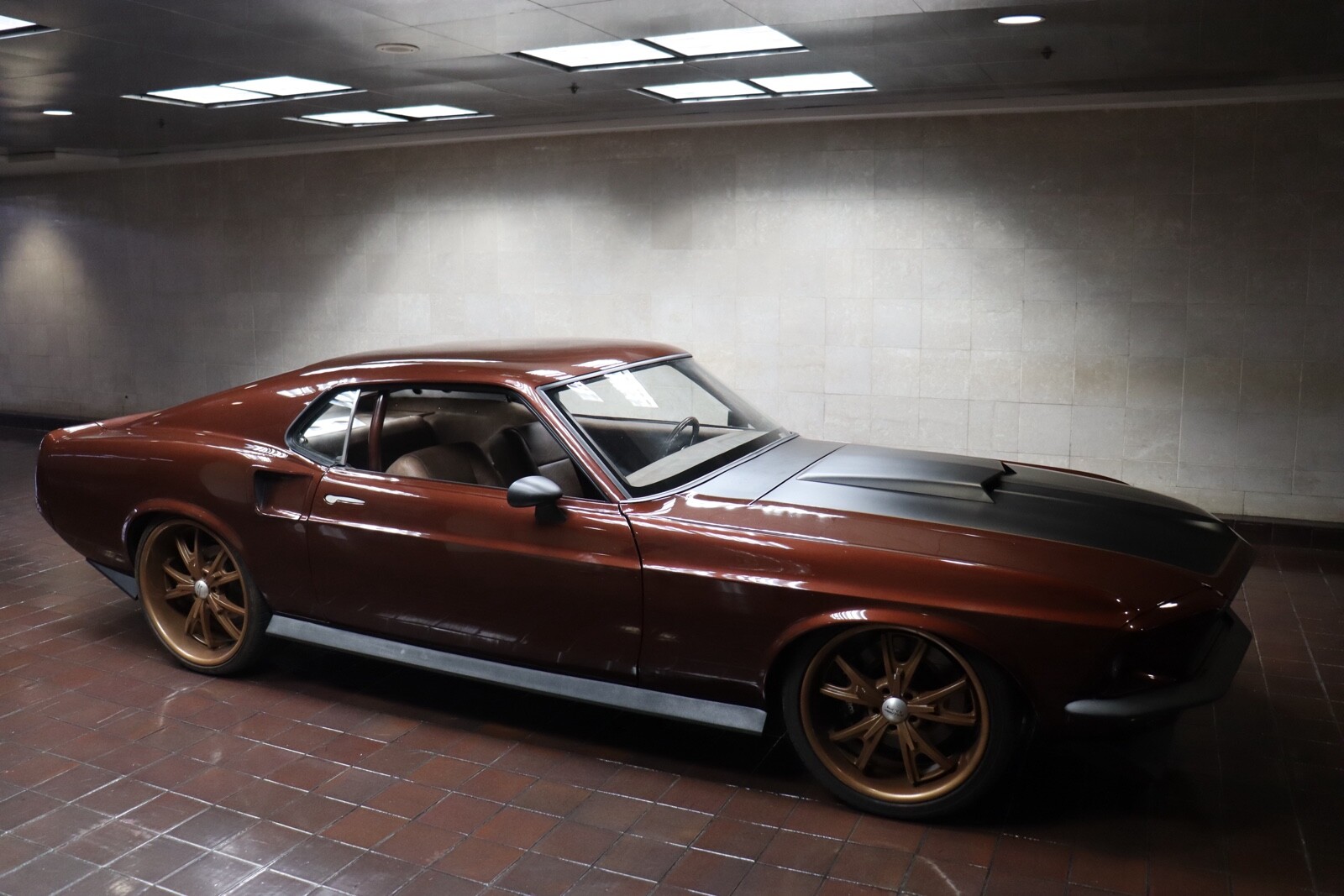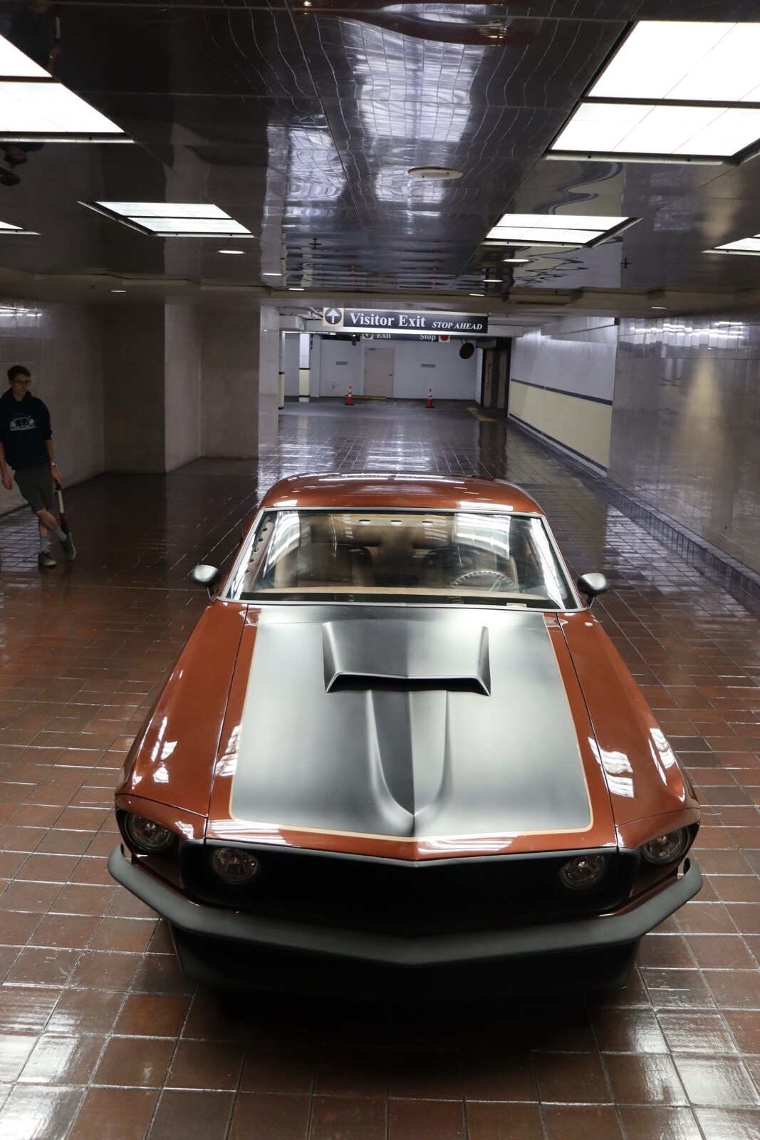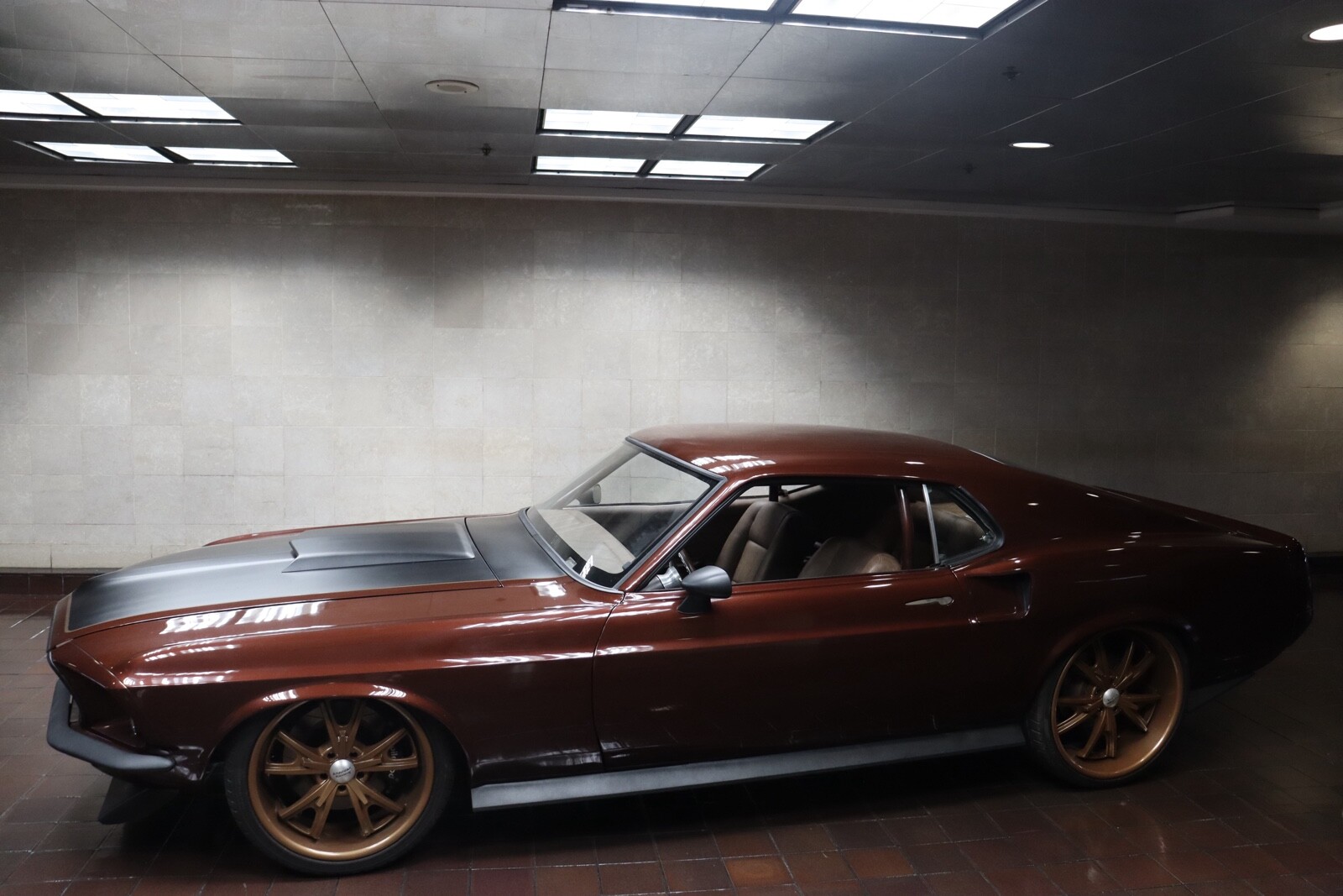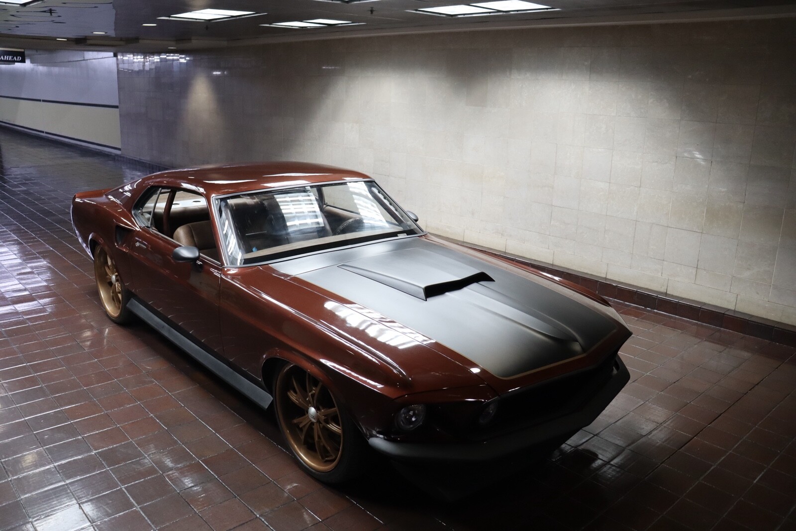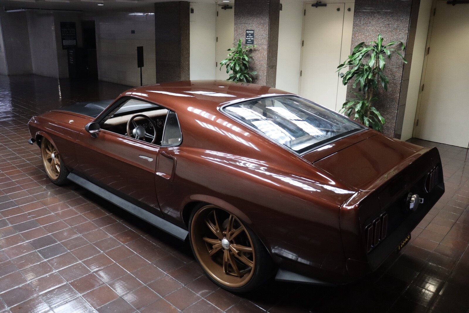 The interior has brown tones that give a nice contrast and separation. The 1969 Fastback has brushed aluminum parts such as a Budnik steering wheel that is upholstered to match the interior as well a tilt steering column. A Lokar shifter that’s an automatic for that simple easy driving. The dashboard as you can see was fully fabricated to make the design more streamline with Autometer gauges that are eye appealing and showing class. As you noticed the interior, we have a 10-point roll cage that is wrapped around the inside of the car and fabricated as part of the dash like an endoskeleton. This Mustang will not twist. The seats are wrapped in a brown marble leather, keeping the original seats and adding a little more cushion for the body. Both front seats and backseat have race belts, and brushed dimpled and billet interior accents. The door panels are custom made and designed, with sound deadener under the carpet.