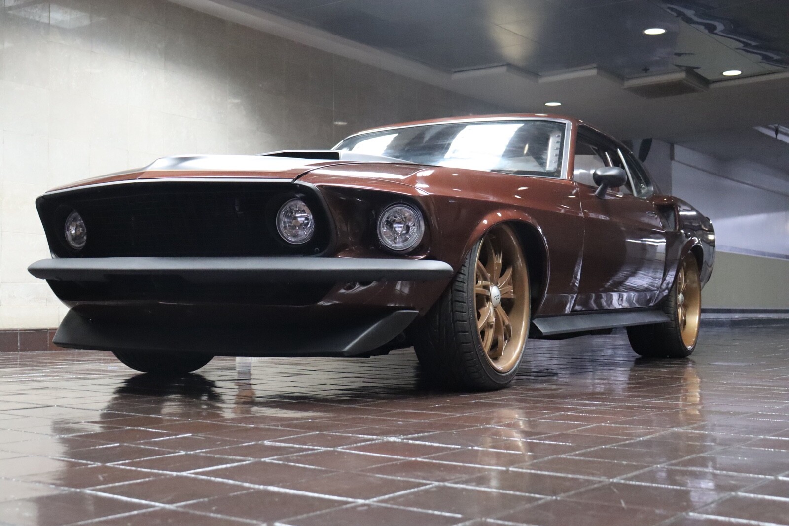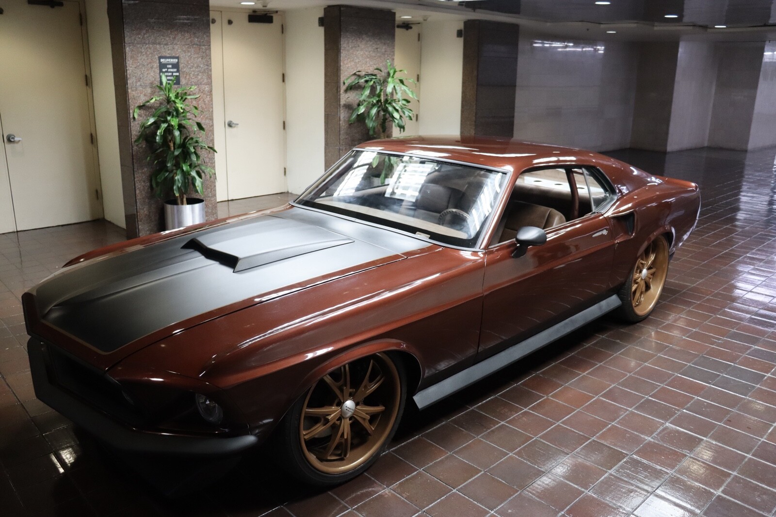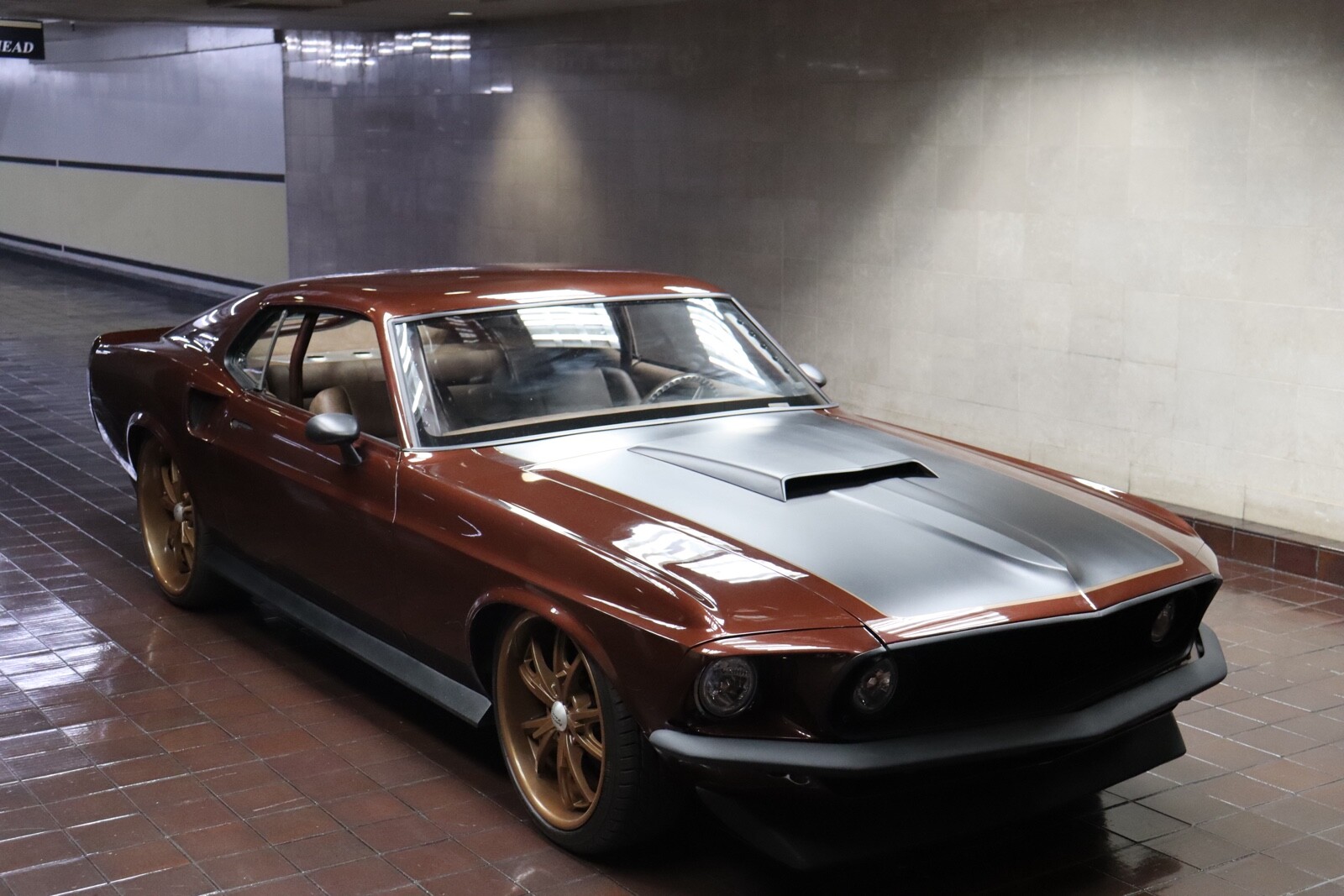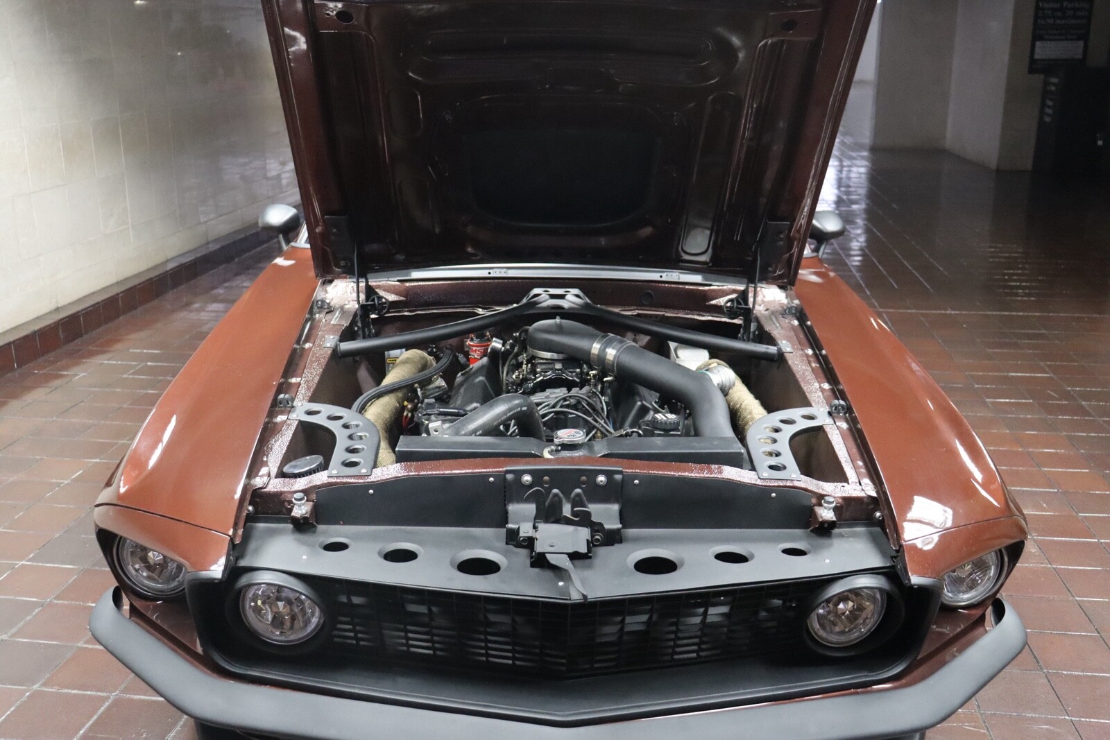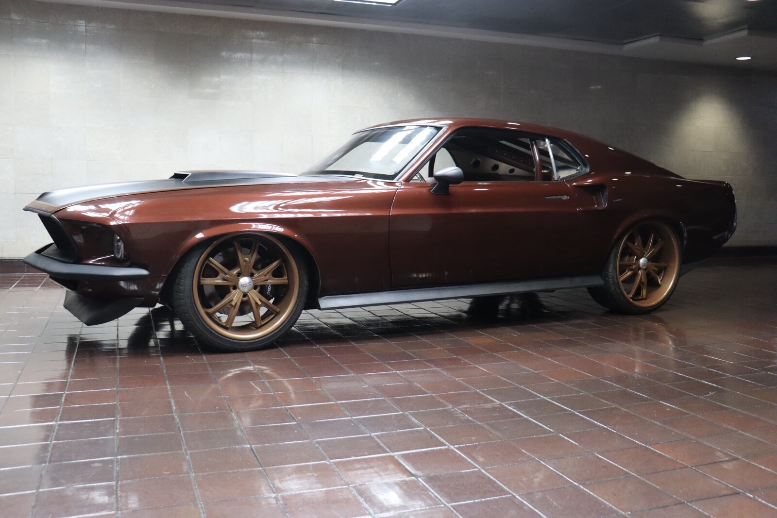The interior has brown tones that give a nice contrast and separation. The 1969 Fastback has brushed aluminum parts such as a Budnik steering wheel that is upholstered to match the interior as well a tilt steering column. A Lokar shifter that’s an automatic for that simple easy driving. The dashboard as you can see was fully fabricated to make the design more streamline with Autometer gauges that are eye appealing and showing class. As you noticed the interior, we have a 10-point roll cage that is wrapped around the inside of the car and fabricated as part of the dash like an endoskeleton. This Mustang will not twist. The seats are wrapped in a brown marble leather, keeping the original seats and adding a little more cushion for the body. Both front seats and backseat have race belts, and brushed dimpled and billet interior accents. The door panels are custom made and designed, with sound deadener under the carpet.