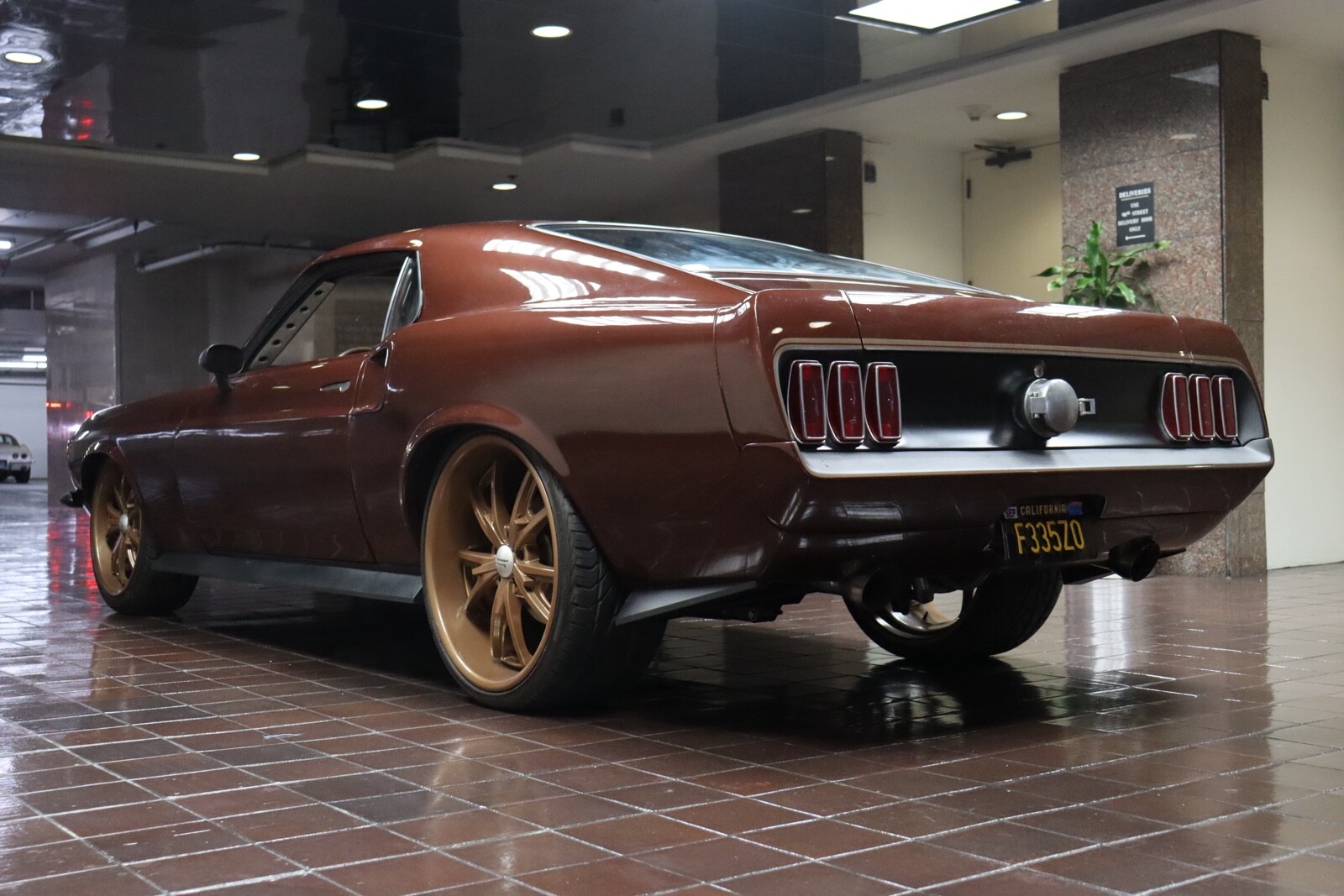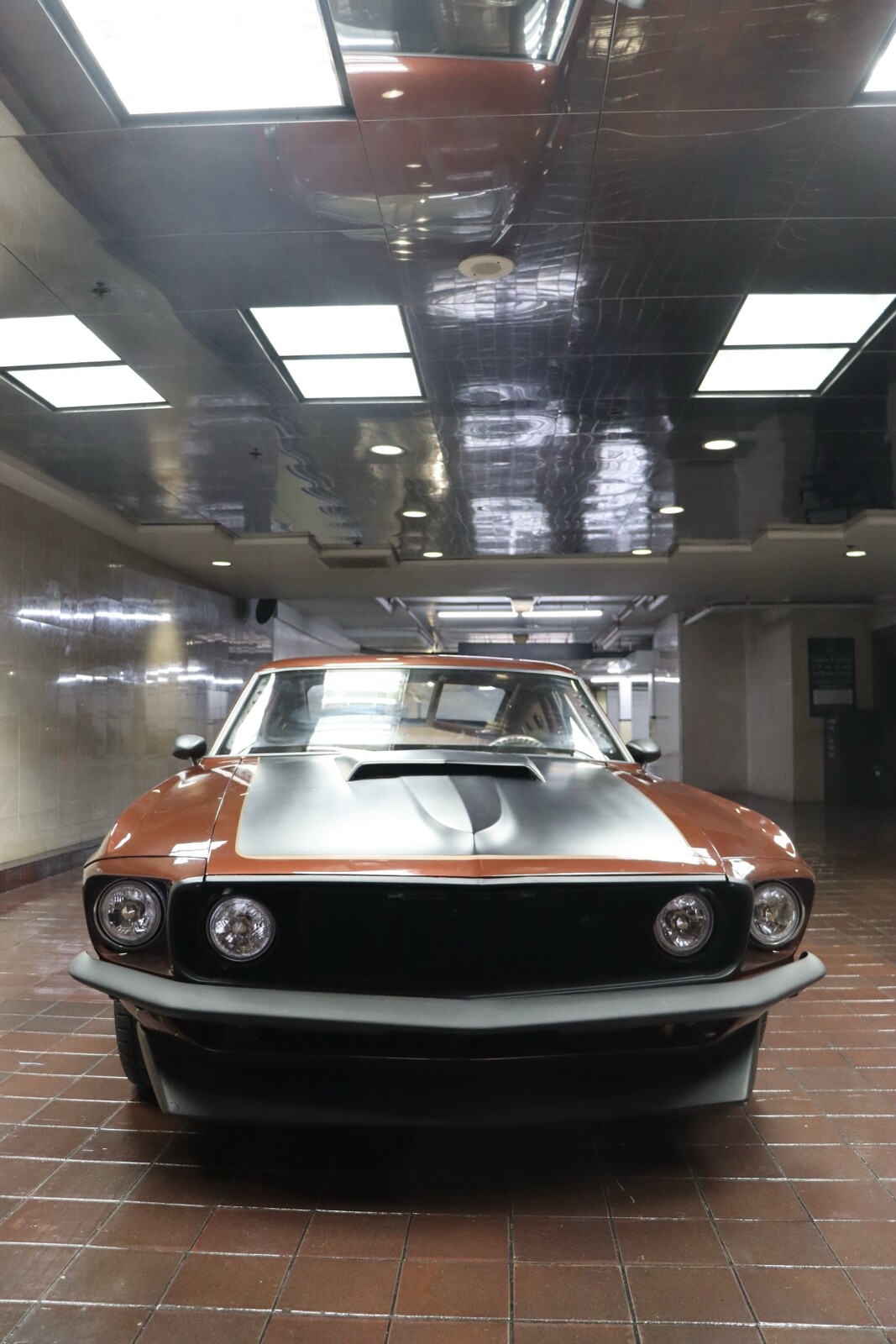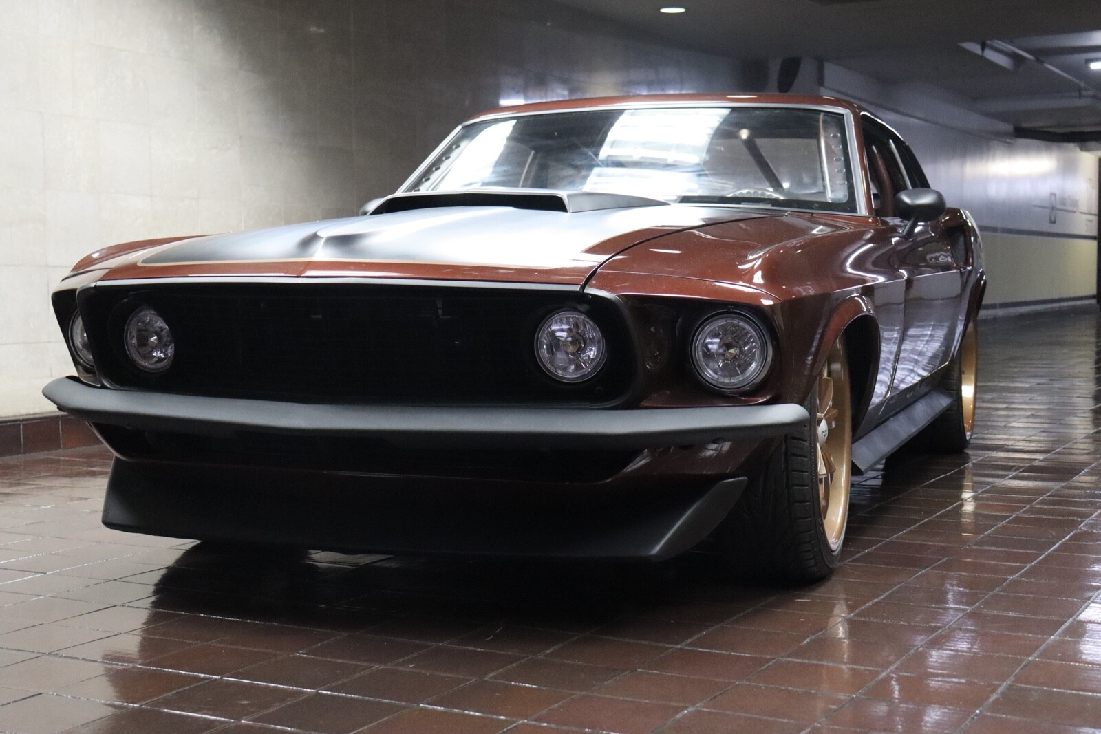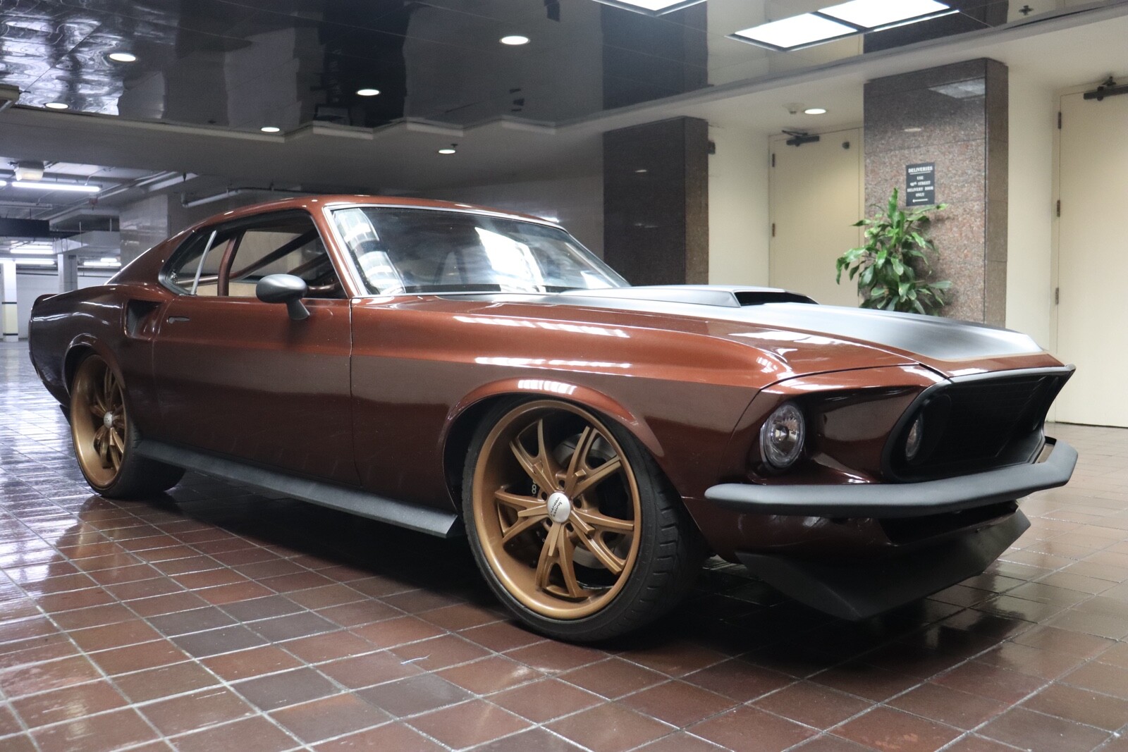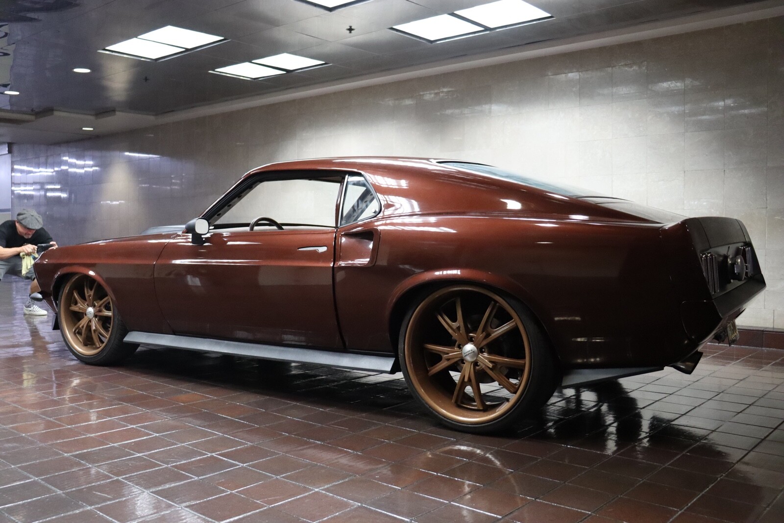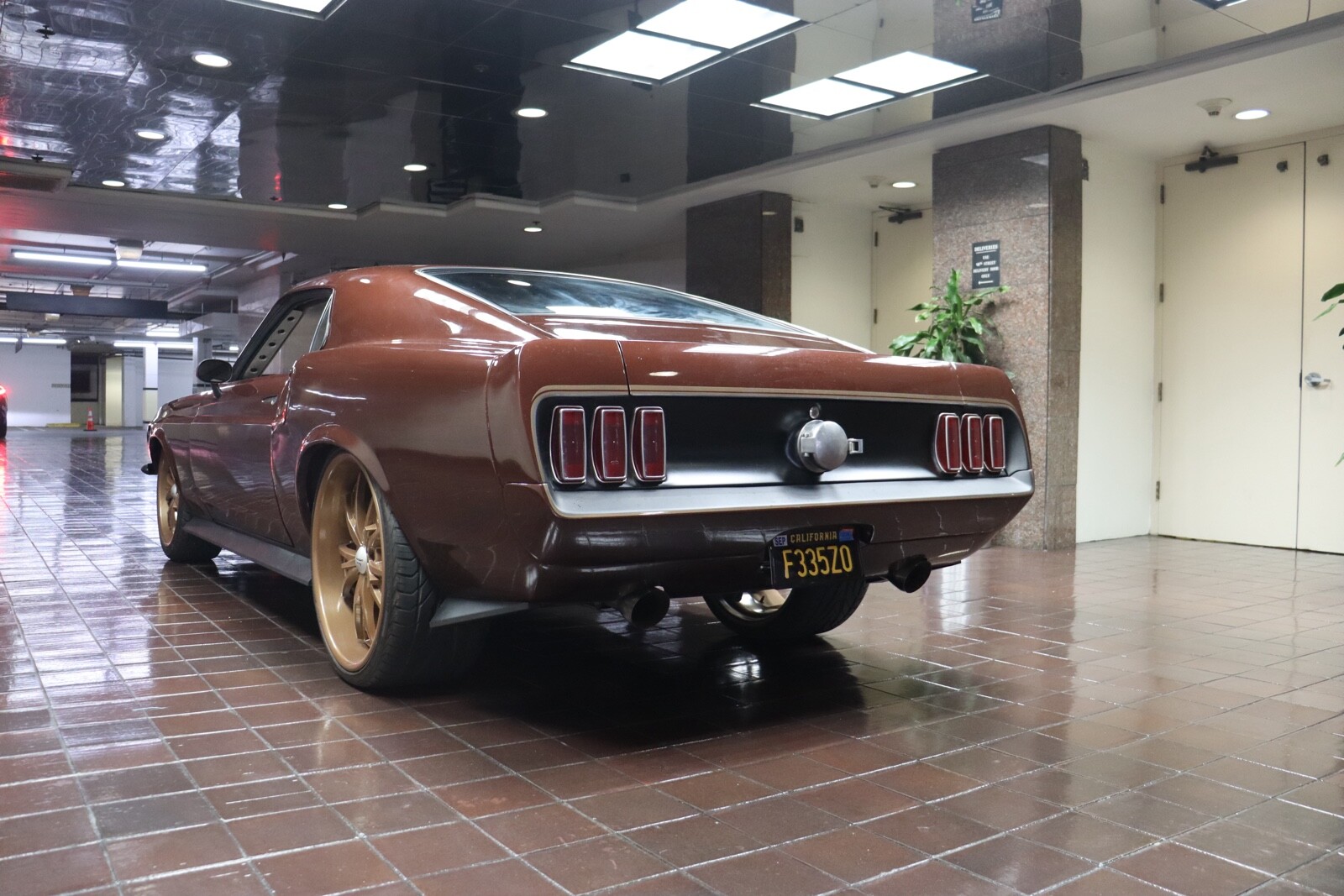 The interior has brown tones that give a nice contrast and separation. The 1969 Fastback has brushed aluminum parts such as a Budnik steering wheel that is upholstered to match the interior as well a tilt steering column. A Lokar shifter that’s an automatic for that simple easy driving. The dashboard as you can see was fully fabricated to make the design more streamline with Autometer gauges that are eye appealing and showing class. As you noticed the interior, we have a 10-point roll cage that is wrapped around the inside of the car and fabricated as part of the dash like an endoskeleton. This Mustang will not twist. The seats are wrapped in a brown marble leather, keeping the original seats and adding a little more cushion for the body. Both front seats and backseat have race belts, and brushed dimpled and billet interior accents. The door panels are custom made and designed, with sound deadener under the carpet.