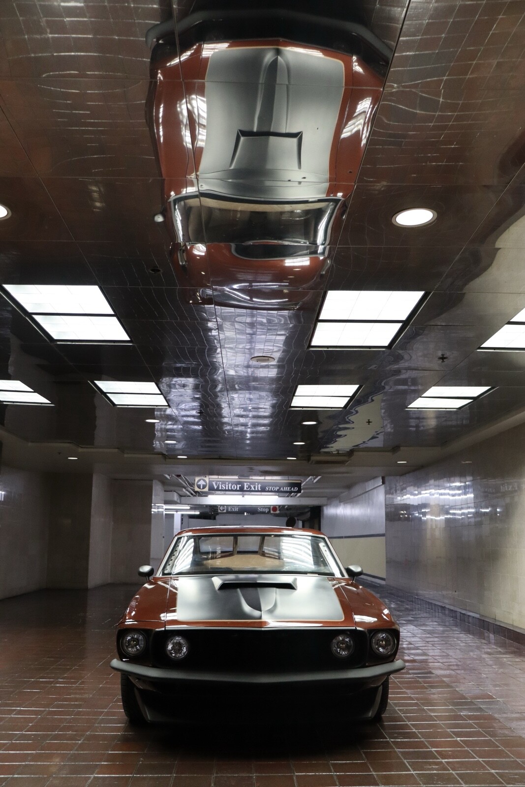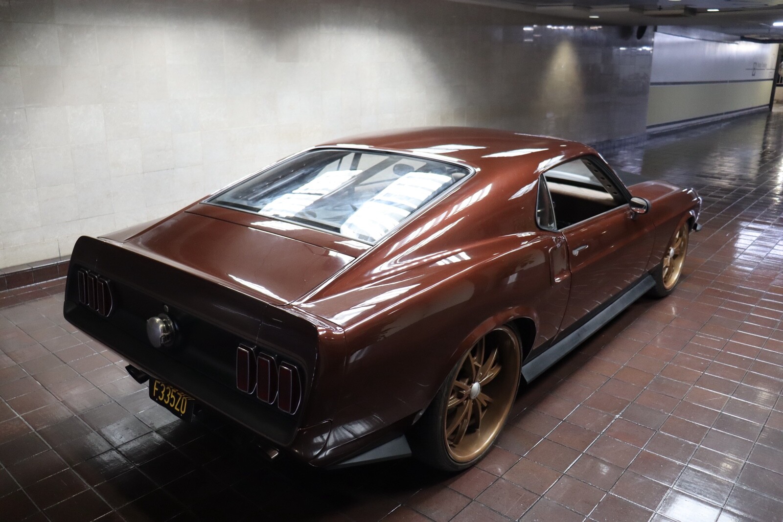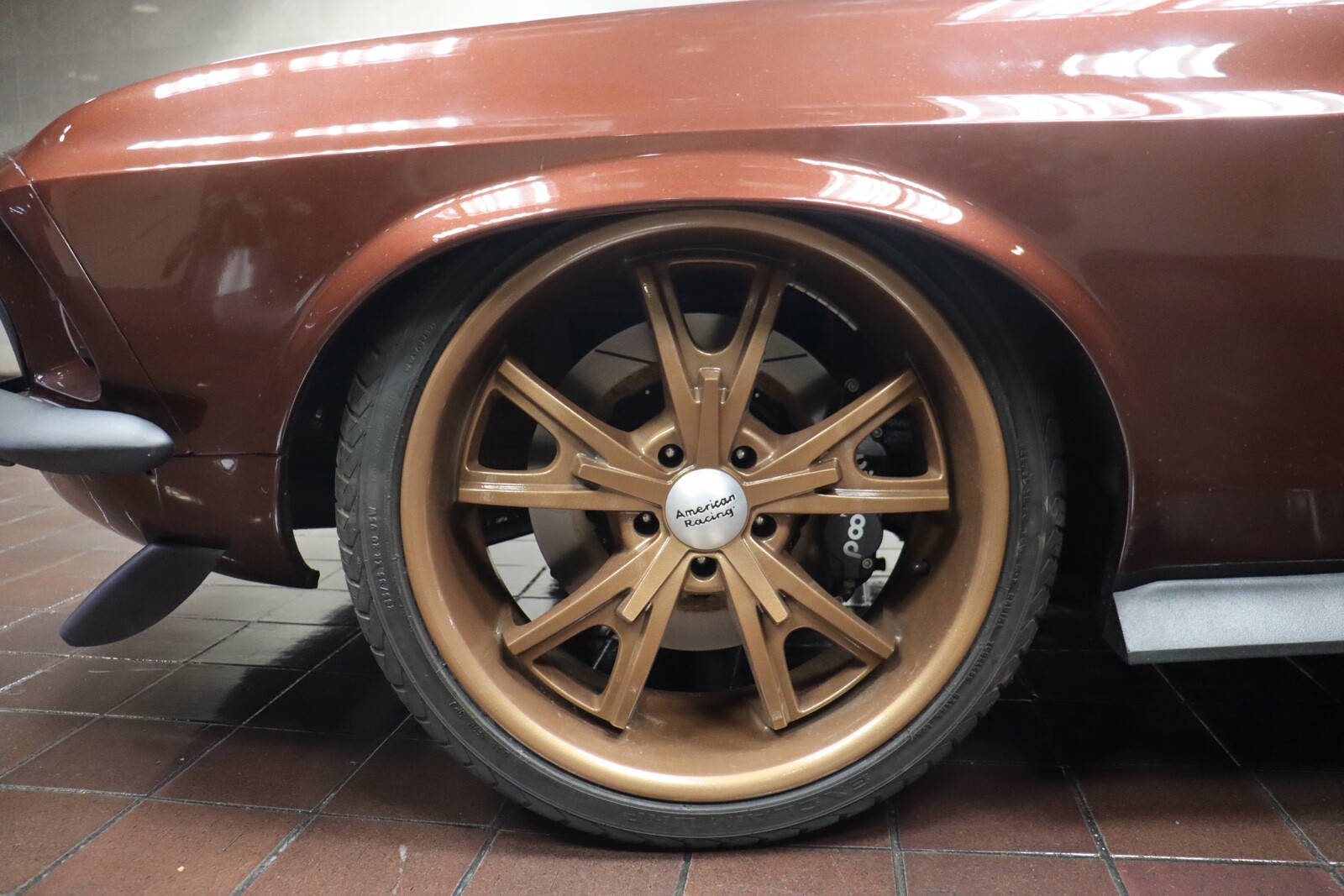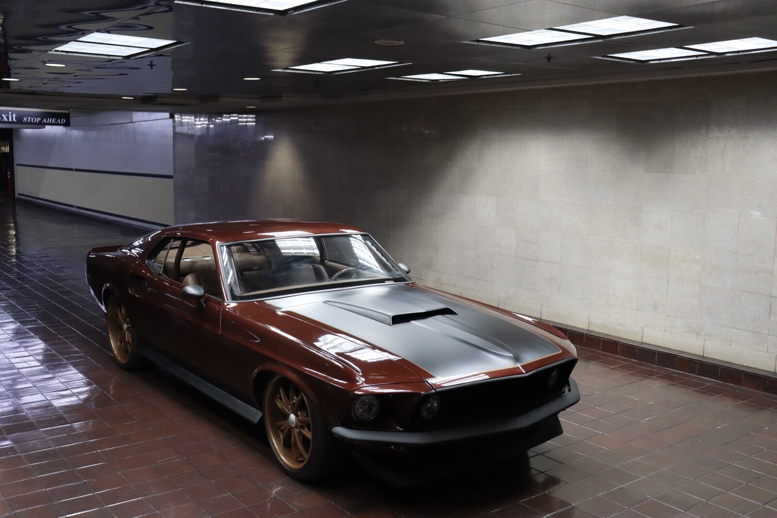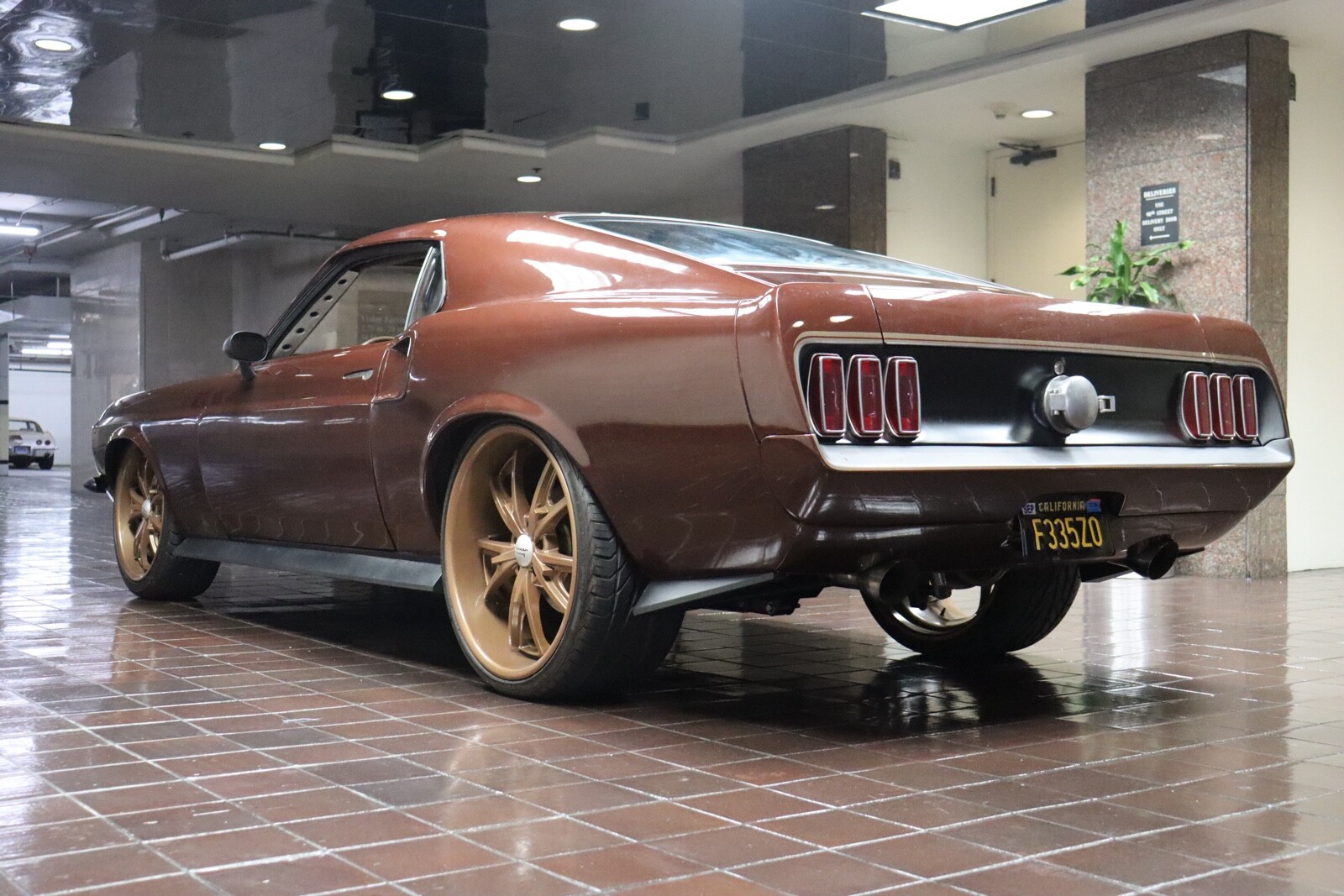 The interior has brown tones that give a nice contrast and separation. The 1969 Fastback has brushed aluminum parts such as a Budnik steering wheel that is upholstered to match the interior as well a tilt steering column. A Lokar shifter that’s an automatic for that simple easy driving. The dashboard as you can see was fully fabricated to make the design more streamline with Autometer gauges that are eye appealing and showing class. As you noticed the interior, we have a 10-point roll cage that is wrapped around the inside of the car and fabricated as part of the dash like an endoskeleton. This Mustang will not twist. The seats are wrapped in a brown marble leather, keeping the original seats and adding a little more cushion for the body. Both front seats and backseat have race belts, and brushed dimpled and billet interior accents. The door panels are custom made and designed, with sound deadener under the carpet.