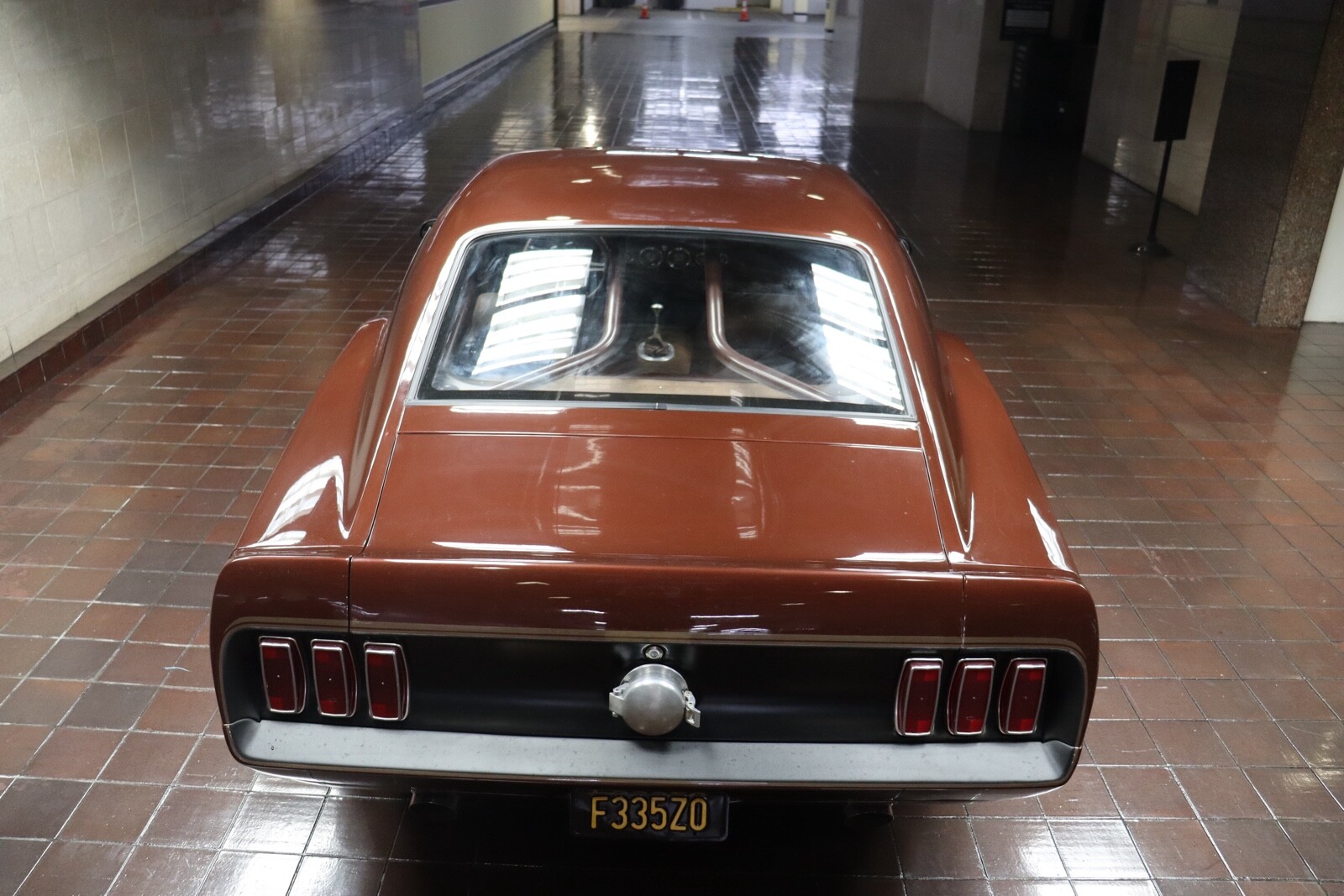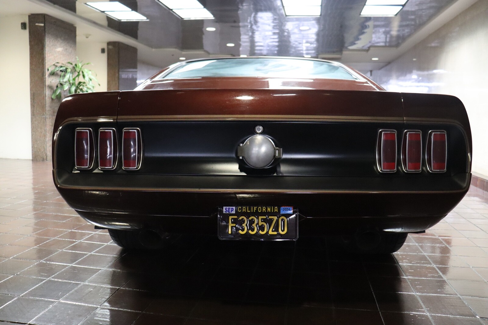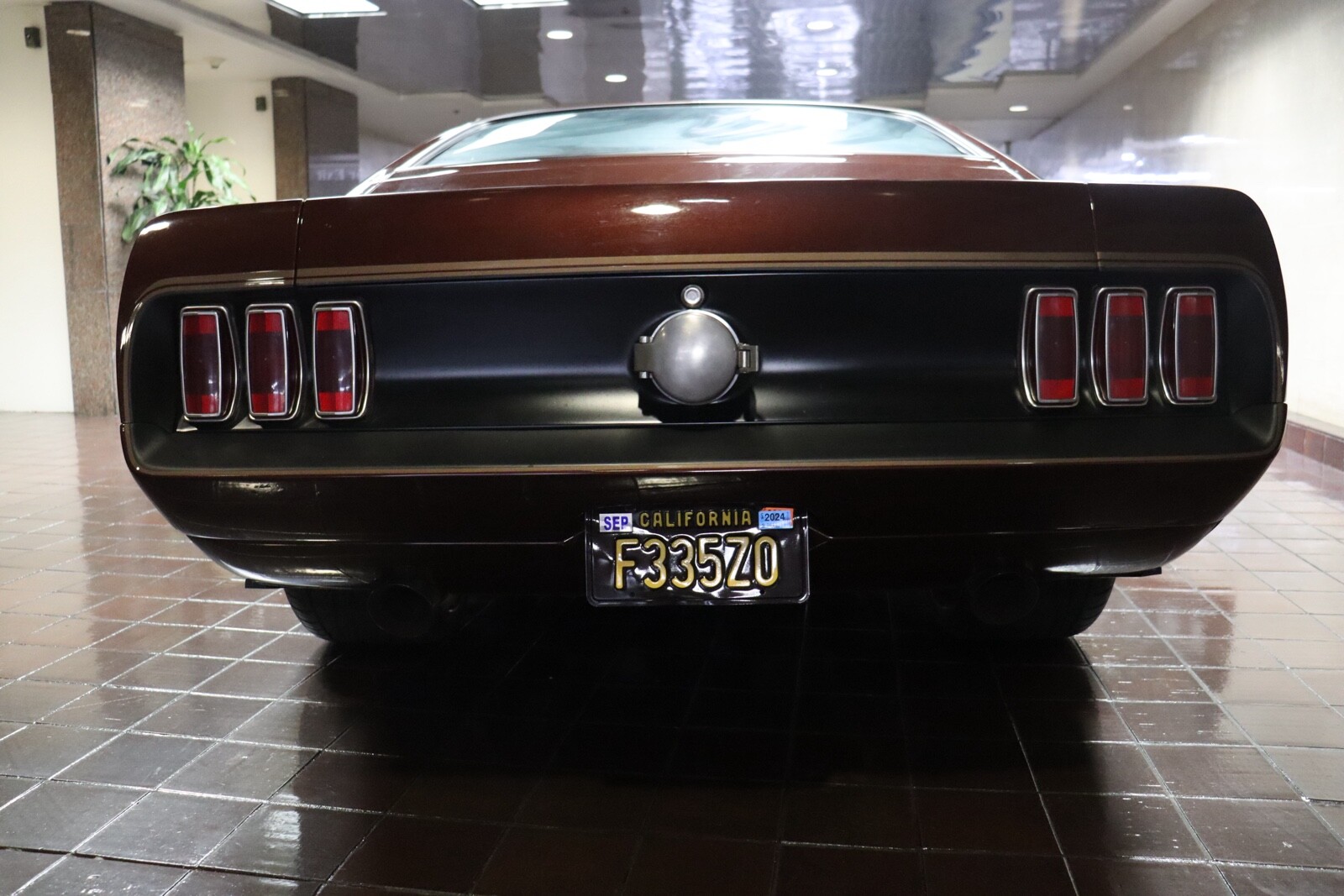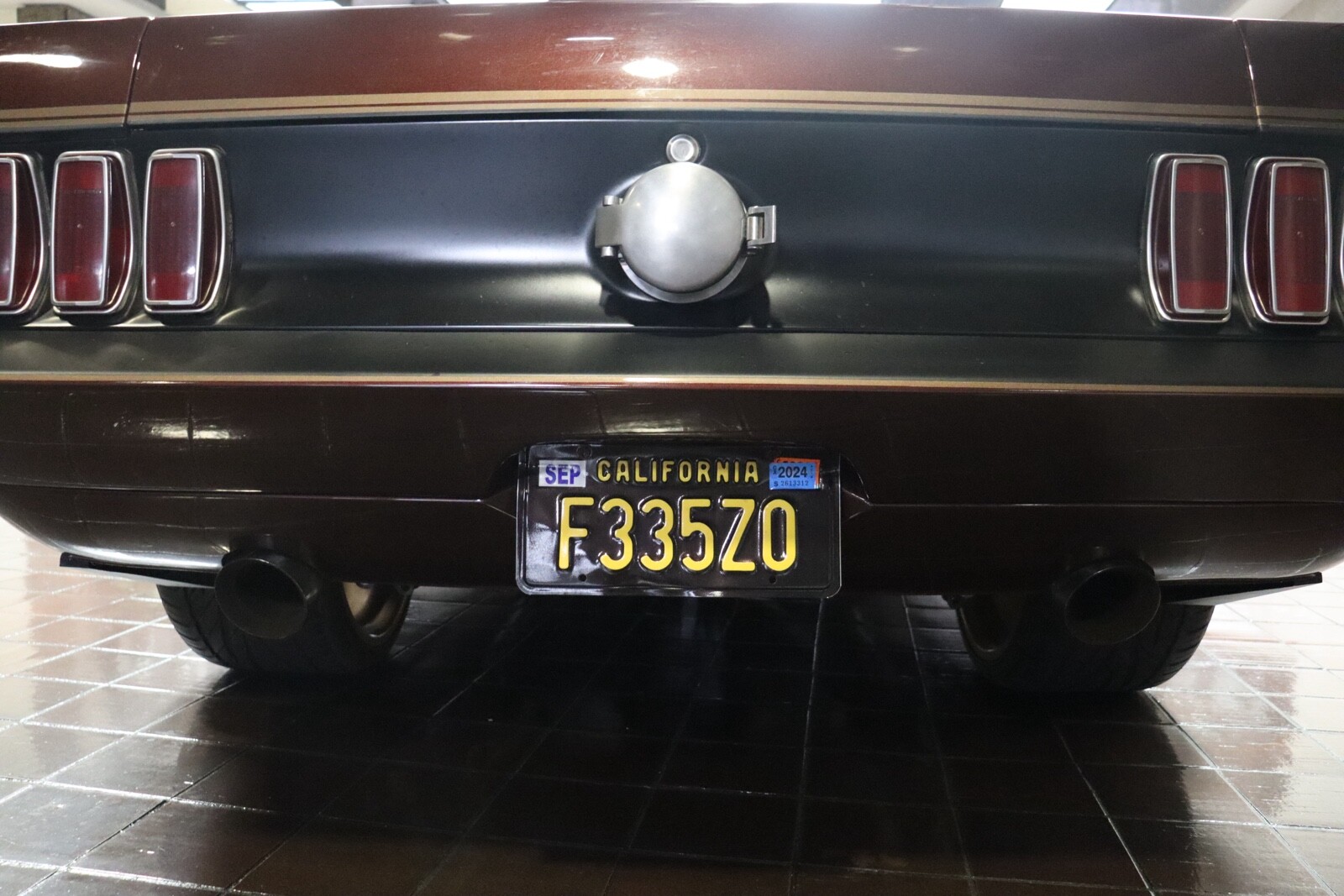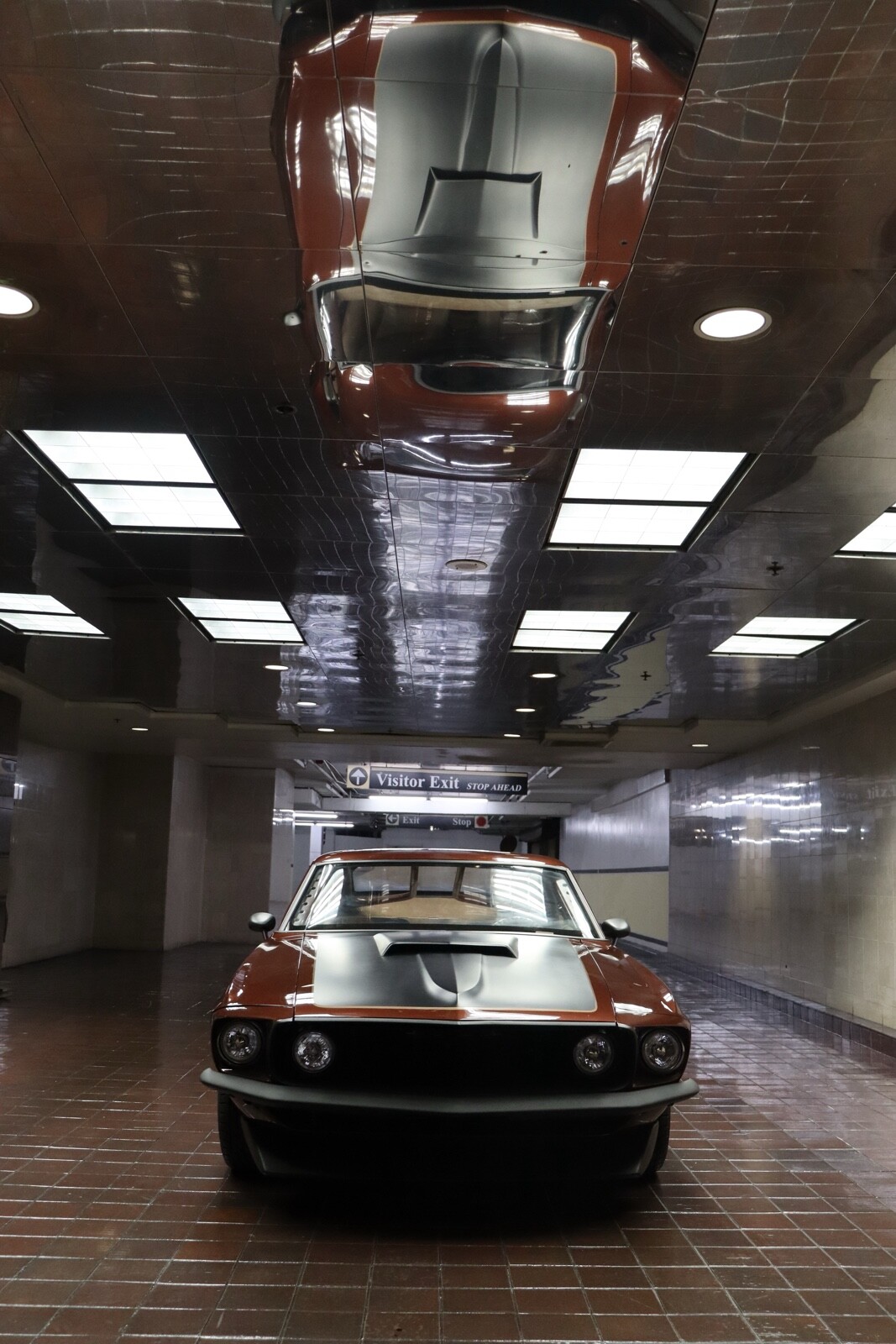 The interior has brown tones that give a nice contrast and separation. The 1969 Fastback has brushed aluminum parts such as a Budnik steering wheel that is upholstered to match the interior as well a tilt steering column. A Lokar shifter that’s an automatic for that simple easy driving. The dashboard as you can see was fully fabricated to make the design more streamline with Autometer gauges that are eye appealing and showing class. As you noticed the interior, we have a 10-point roll cage that is wrapped around the inside of the car and fabricated as part of the dash like an endoskeleton. This Mustang will not twist. The seats are wrapped in a brown marble leather, keeping the original seats and adding a little more cushion for the body. Both front seats and backseat have race belts, and brushed dimpled and billet interior accents. The door panels are custom made and designed, with sound deadener under the carpet.
