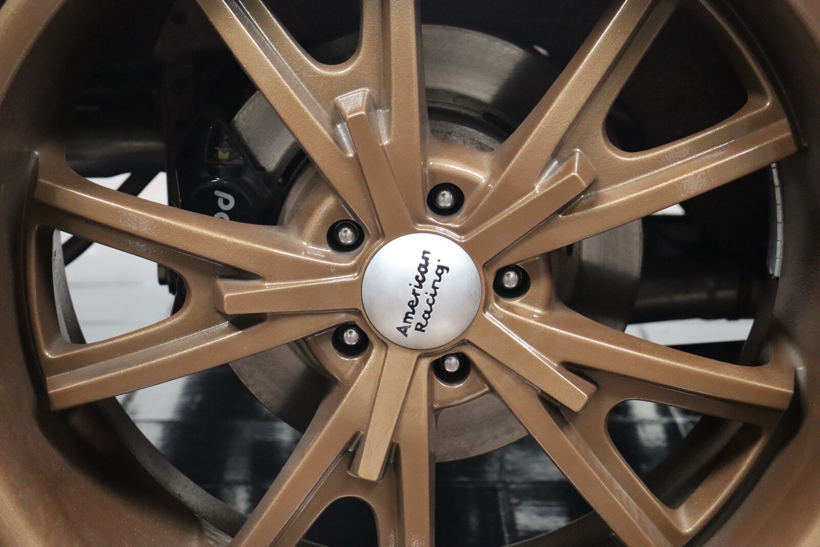 With a bucking 700 horsepower, 347 twin turbo stroker V8, the motor has Eagle forged rotating assembly, with Wiseco forged pistons. It has a 10:1 compression, Pro Competition aluminum heads that are port and polished, Speedway roller rockers, competition cam, hydraulic roller turbo camshaft, competition cam valve springs retainers, APD blow through billet 900 CFM Inforcer carb that’s built for the motor, an MSD ignition and distributor. With two twin turbos that are 60mm each, 20 pounds of boost giving this wicked Pony some serious kick. Itis cooled with a CX racing air front intercooler, a dual Stahl fan followed by a 4 core, aluminum champion radiator. The transmission is a Hughes C4, with 3200 Stahl converter. Suspension we have a TCI Mustang 2 front coil over suspension with 13’ Willwood 6 piston brakes for that stopping power. 9’ Posi rear end with 355 gears, 3 link pro touring coil over rear suspension with a custom wishbone spline that runs down the middle of the carriage for stiffness followed by 3’ dual flow exhaust carefully routed from front to back. This mustang sits on 22x11 and 20x8 American racing rims, that were custom powder coated Bronze.