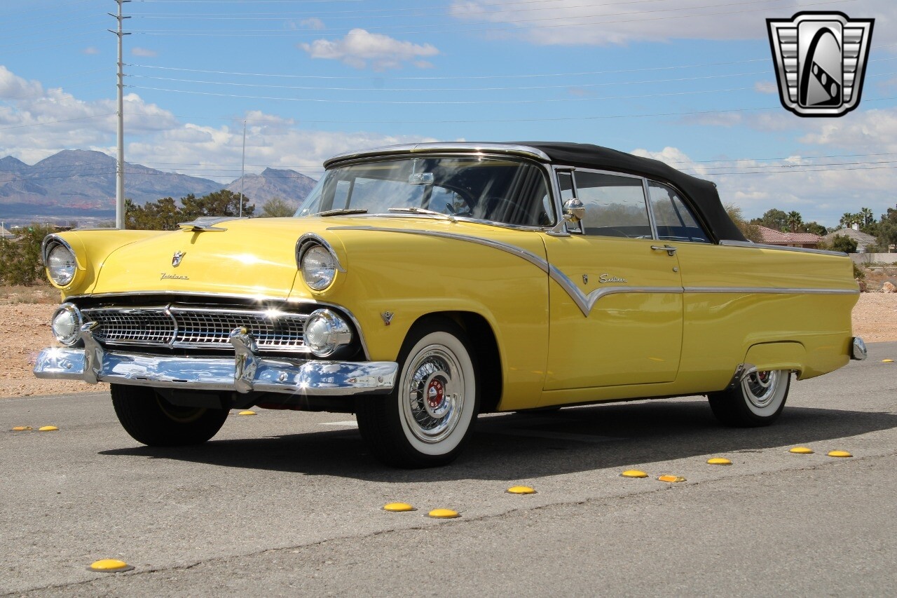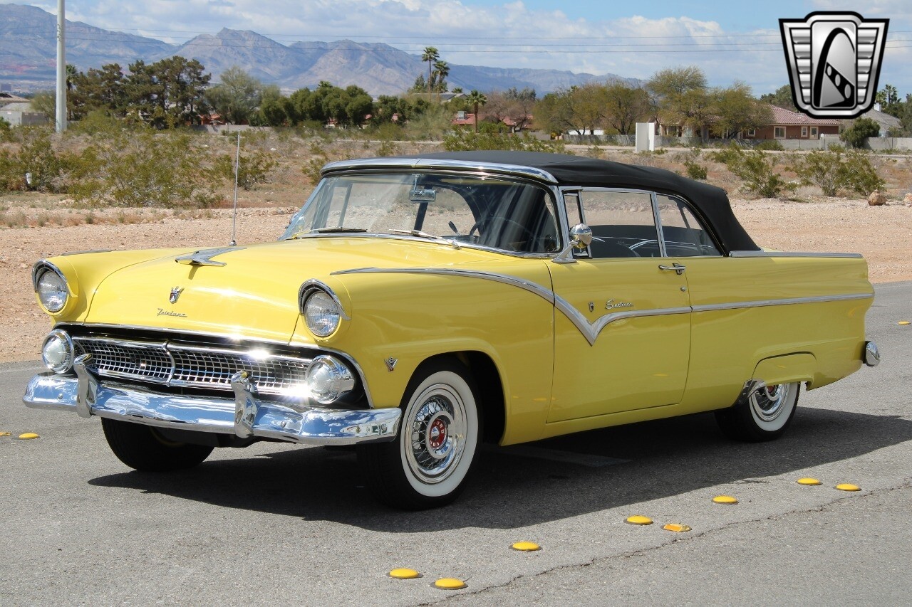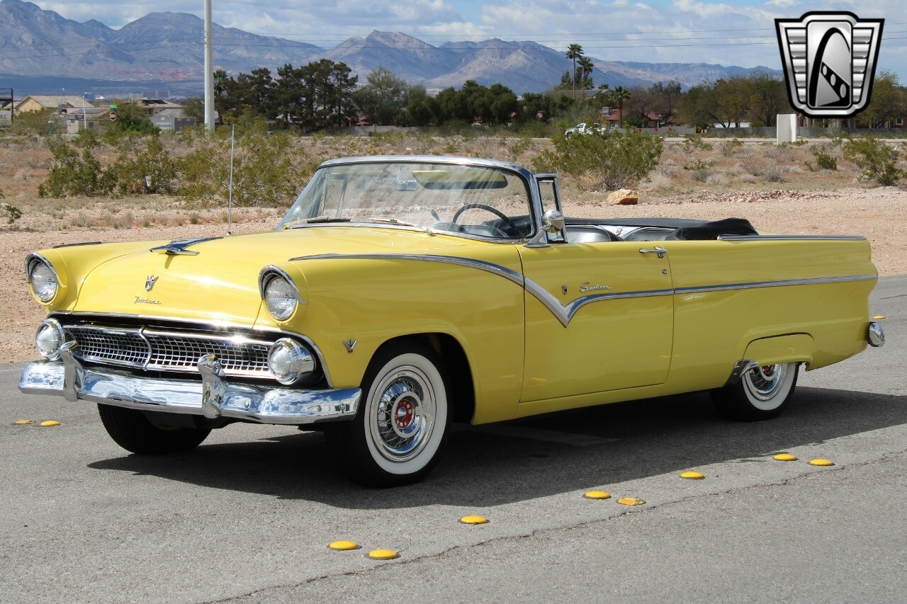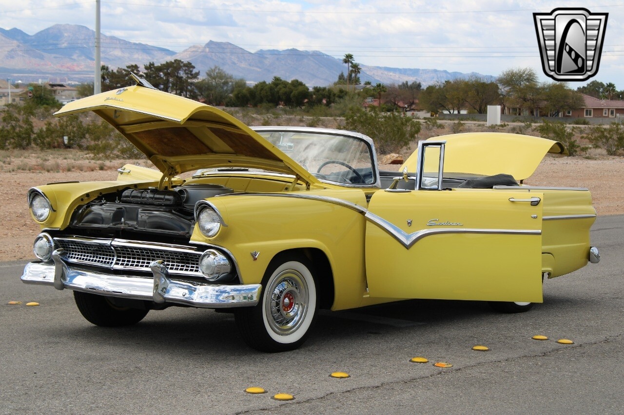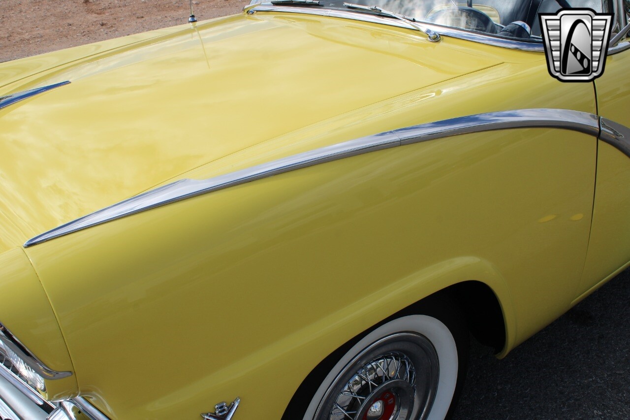 In summary, this 1955 Ford Fairlane Sunliner is a blend of classic design and modern features. Its vibrant yellow exterior, powerful V8 engine, automatic transmission, and safety features make it a desirable choice for vintage car lovers. The black and yellow vinyl interior and white wall tires add to its charm, making it a car that truly stands out from the crowd..