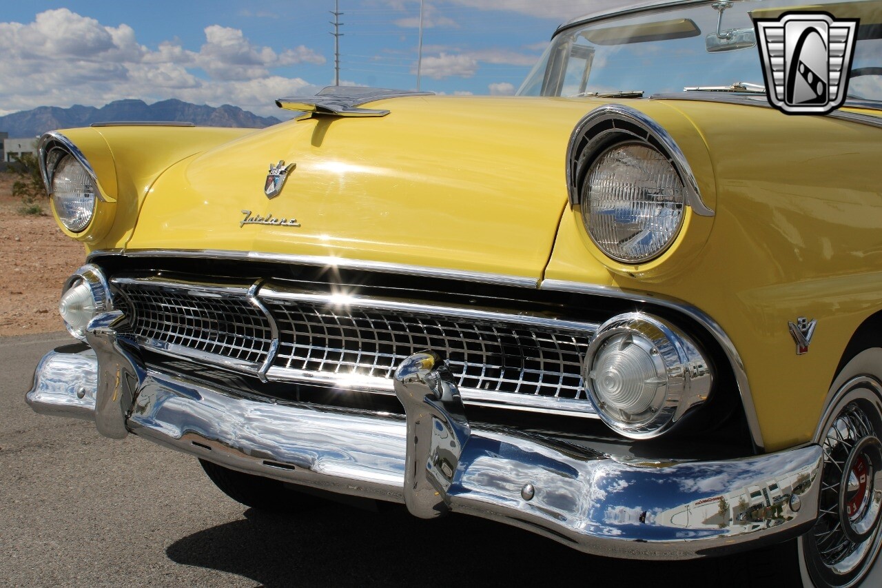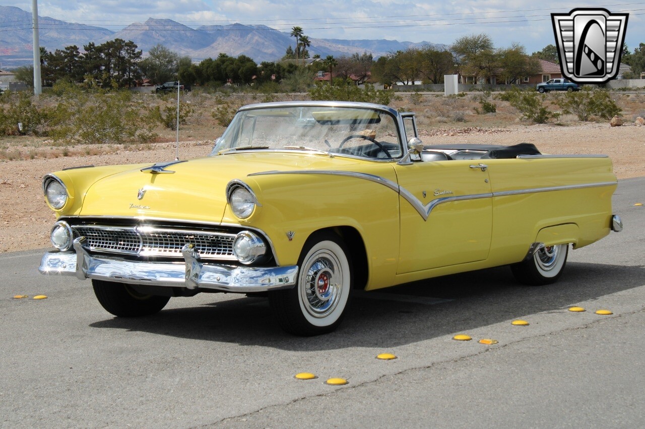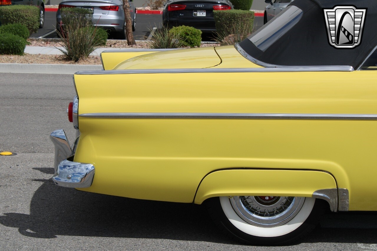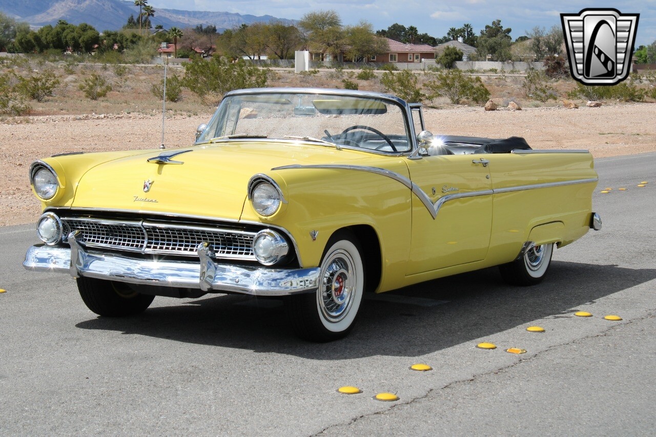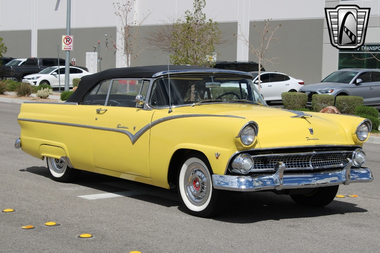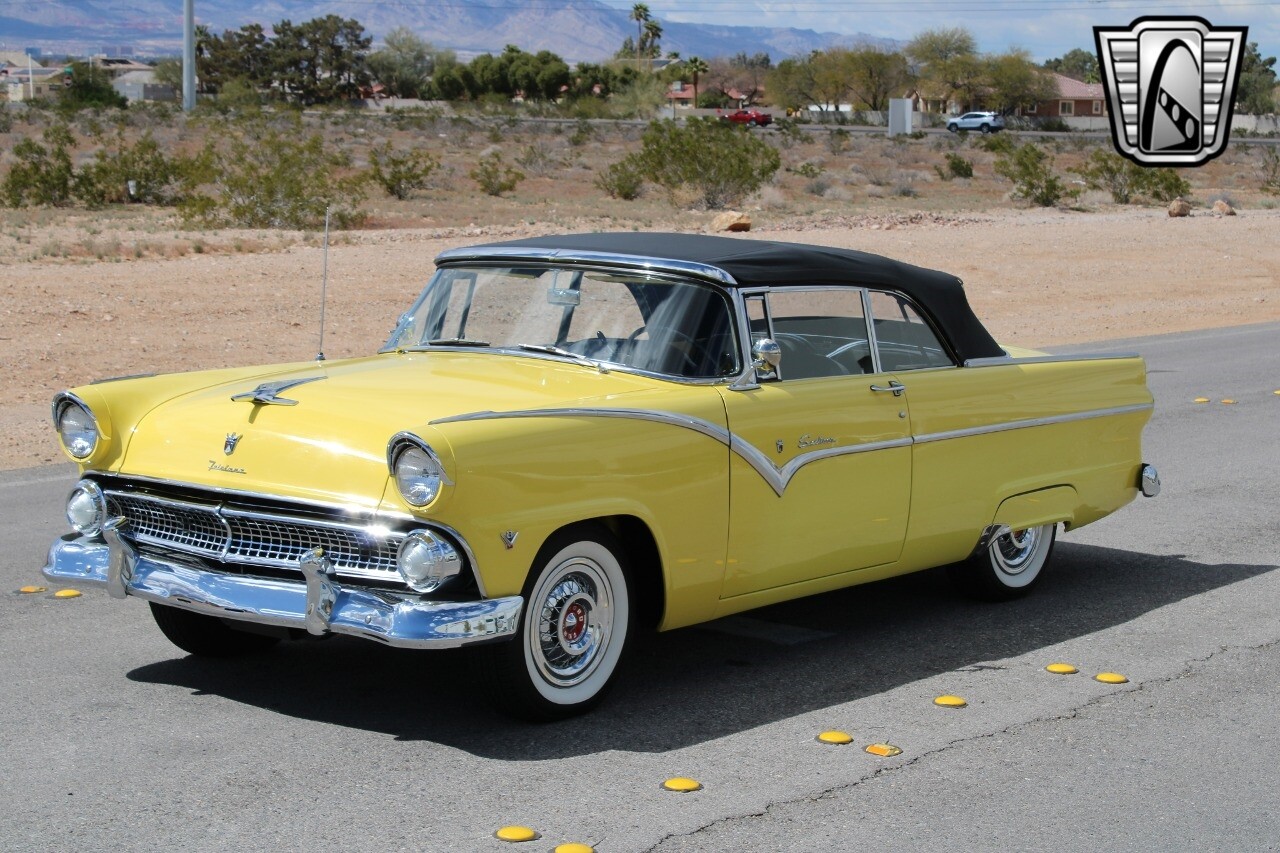 In summary, this 1955 Ford Fairlane Sunliner is a blend of classic design and modern features. Its vibrant yellow exterior, powerful V8 engine, automatic transmission, and safety features make it a desirable choice for vintage car lovers. The black and yellow vinyl interior and white wall tires add to its charm, making it a car that truly stands out from the crowd..