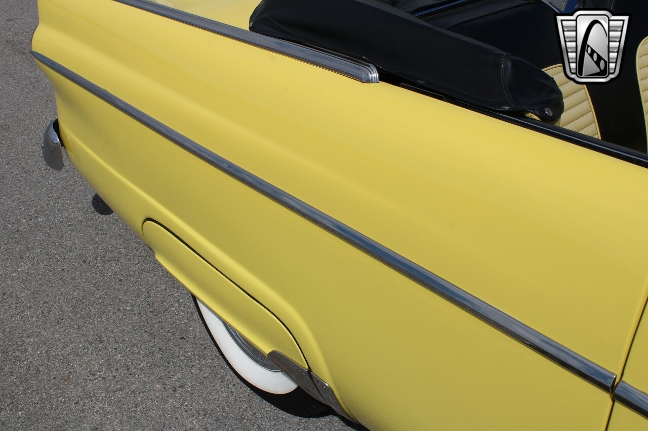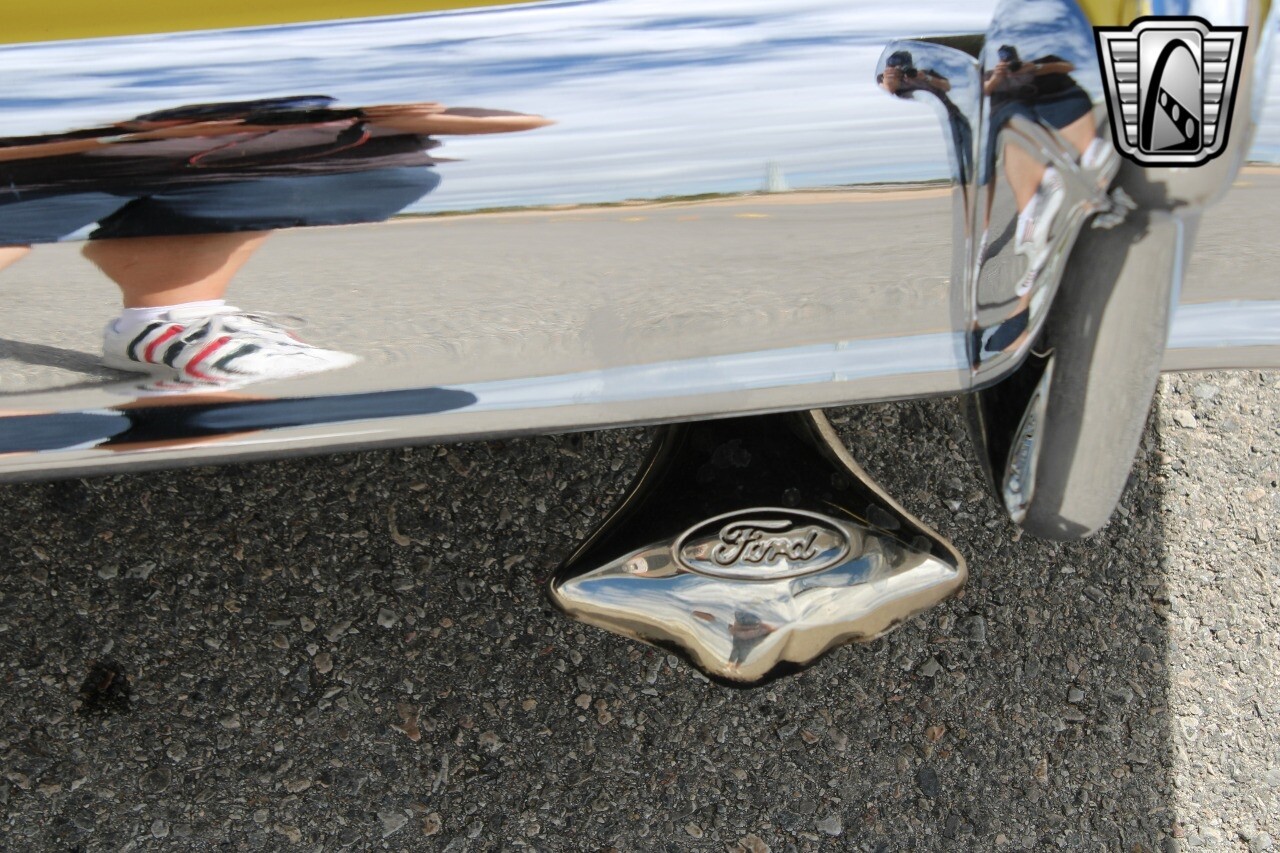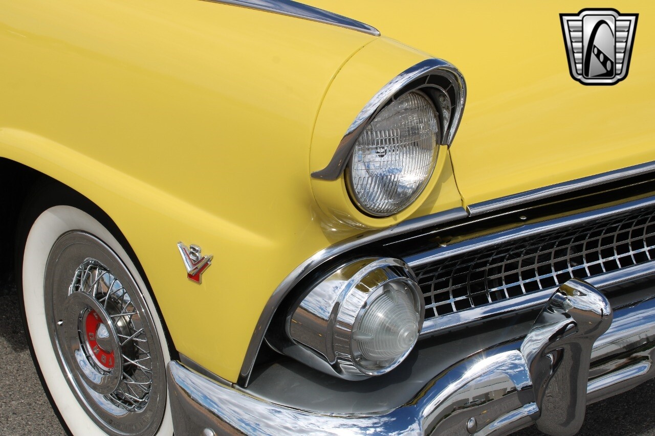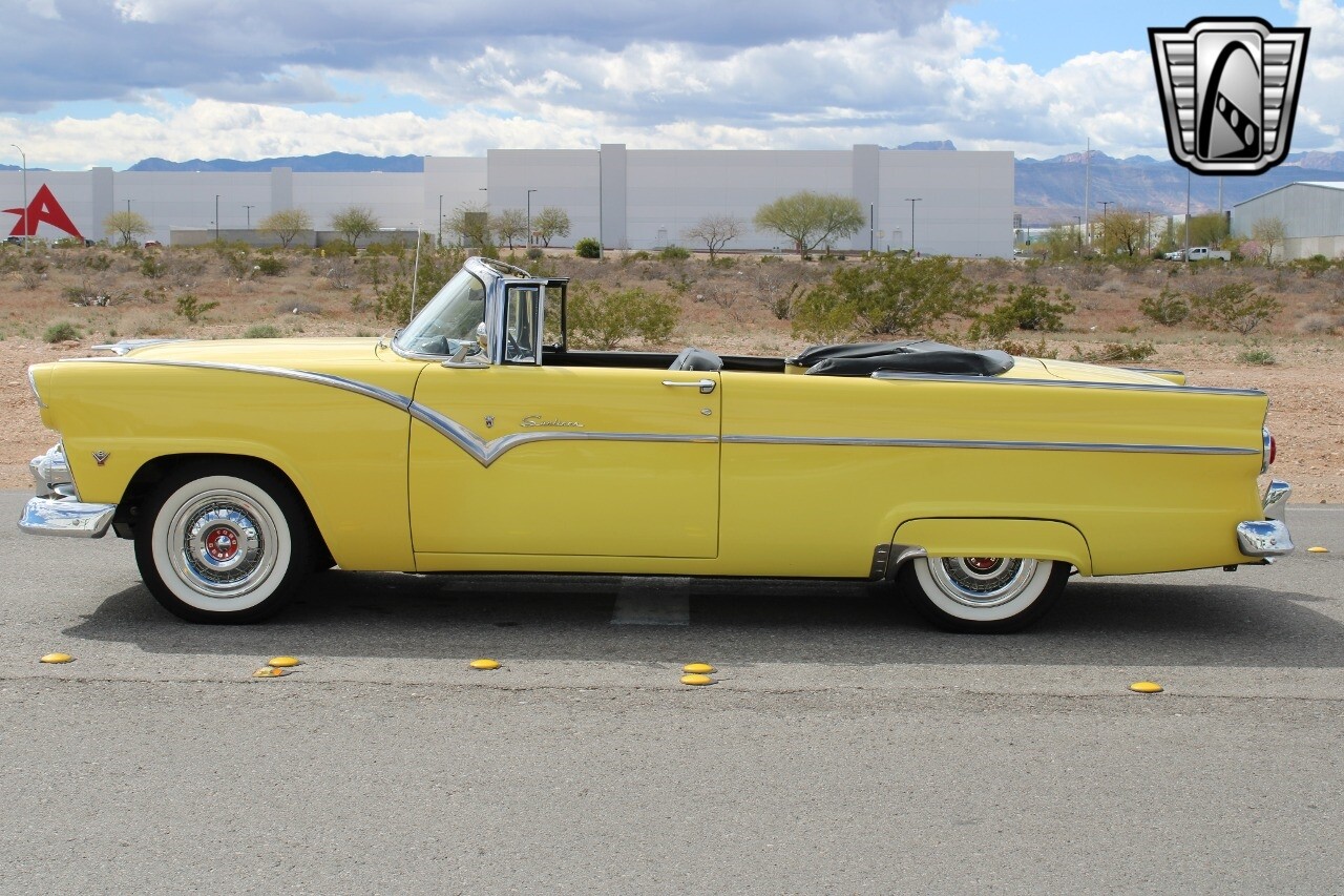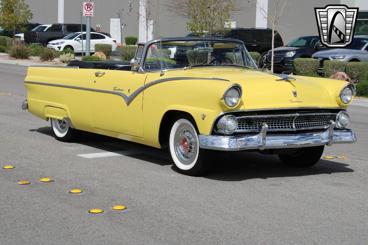 In summary, this 1955 Ford Fairlane Sunliner is a blend of classic design and modern features. Its vibrant yellow exterior, powerful V8 engine, automatic transmission, and safety features make it a desirable choice for vintage car lovers. The black and yellow vinyl interior and white wall tires add to its charm, making it a car that truly stands out from the crowd..