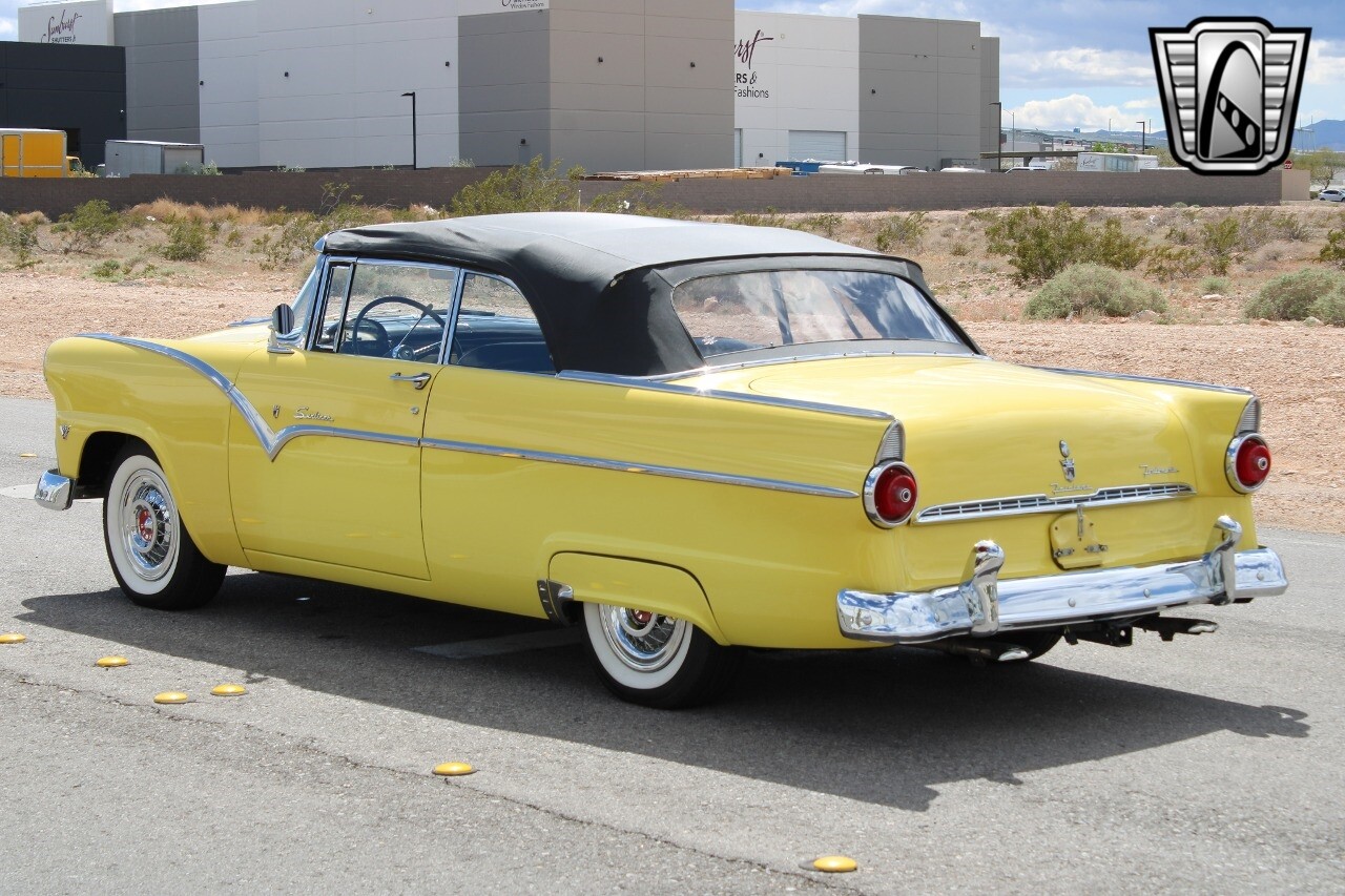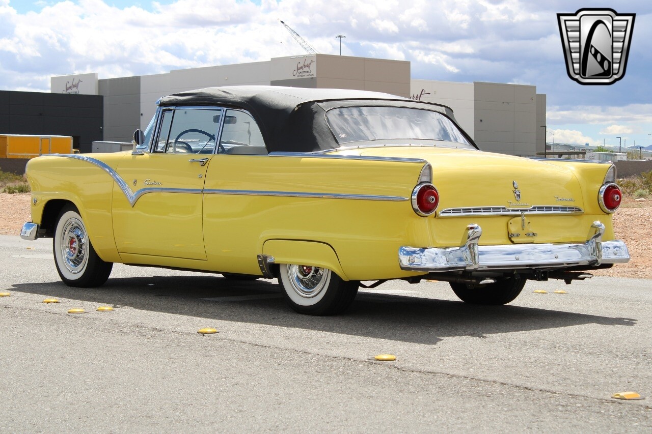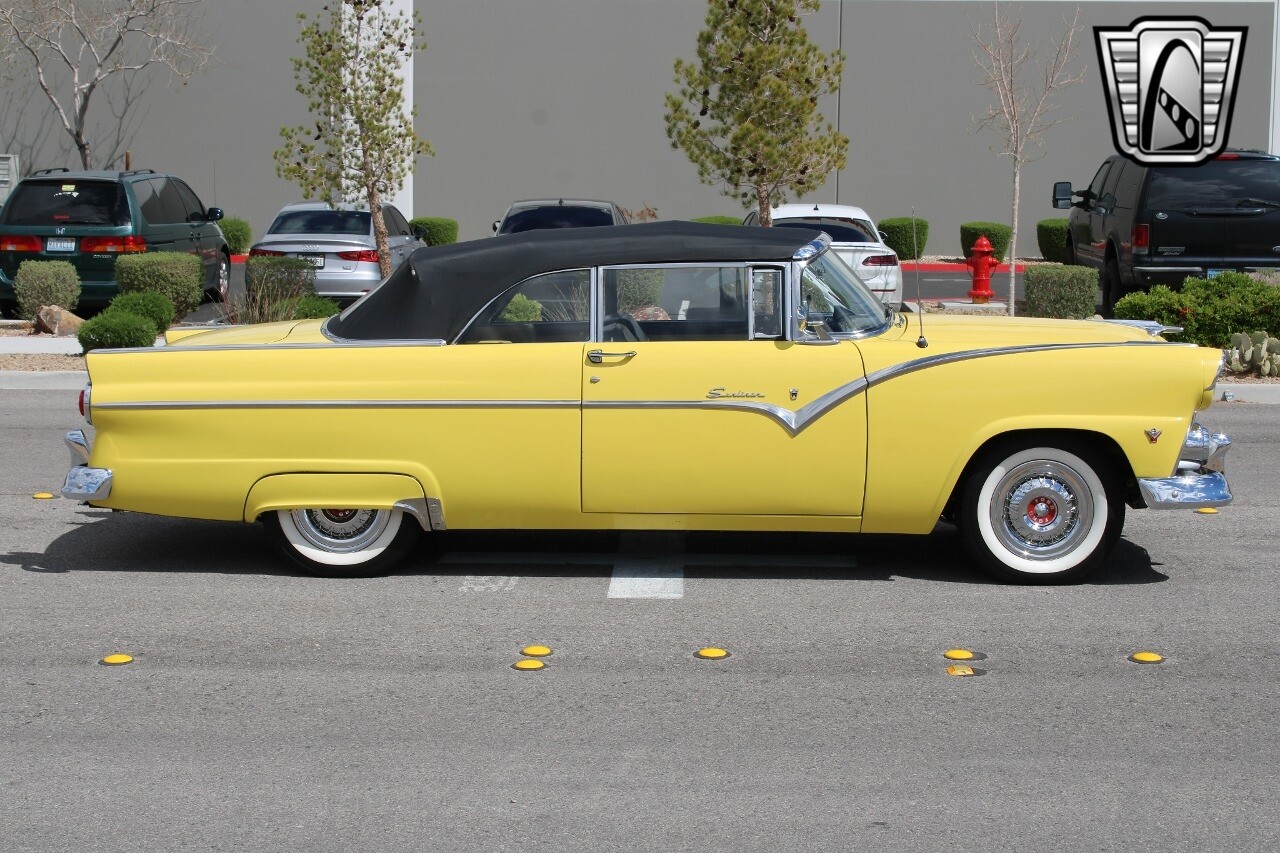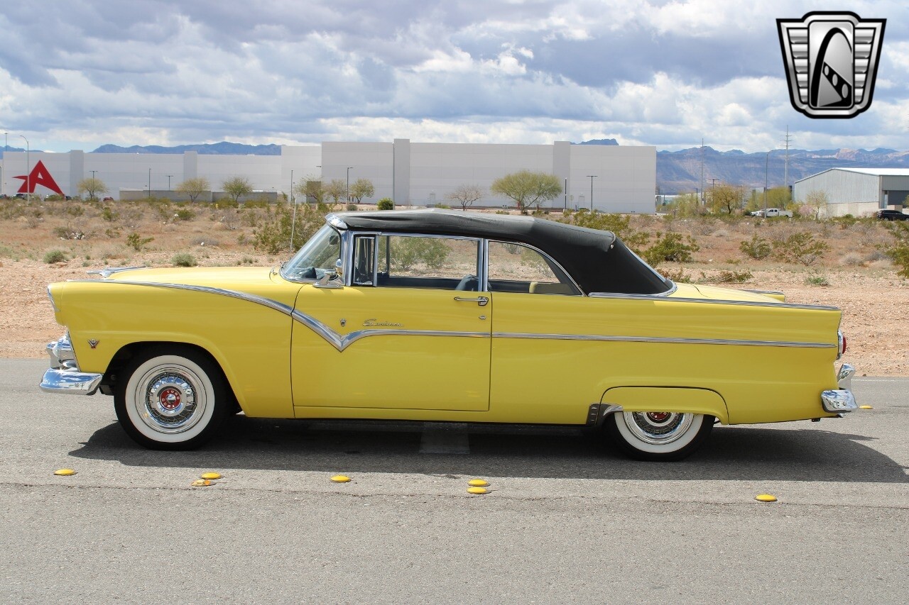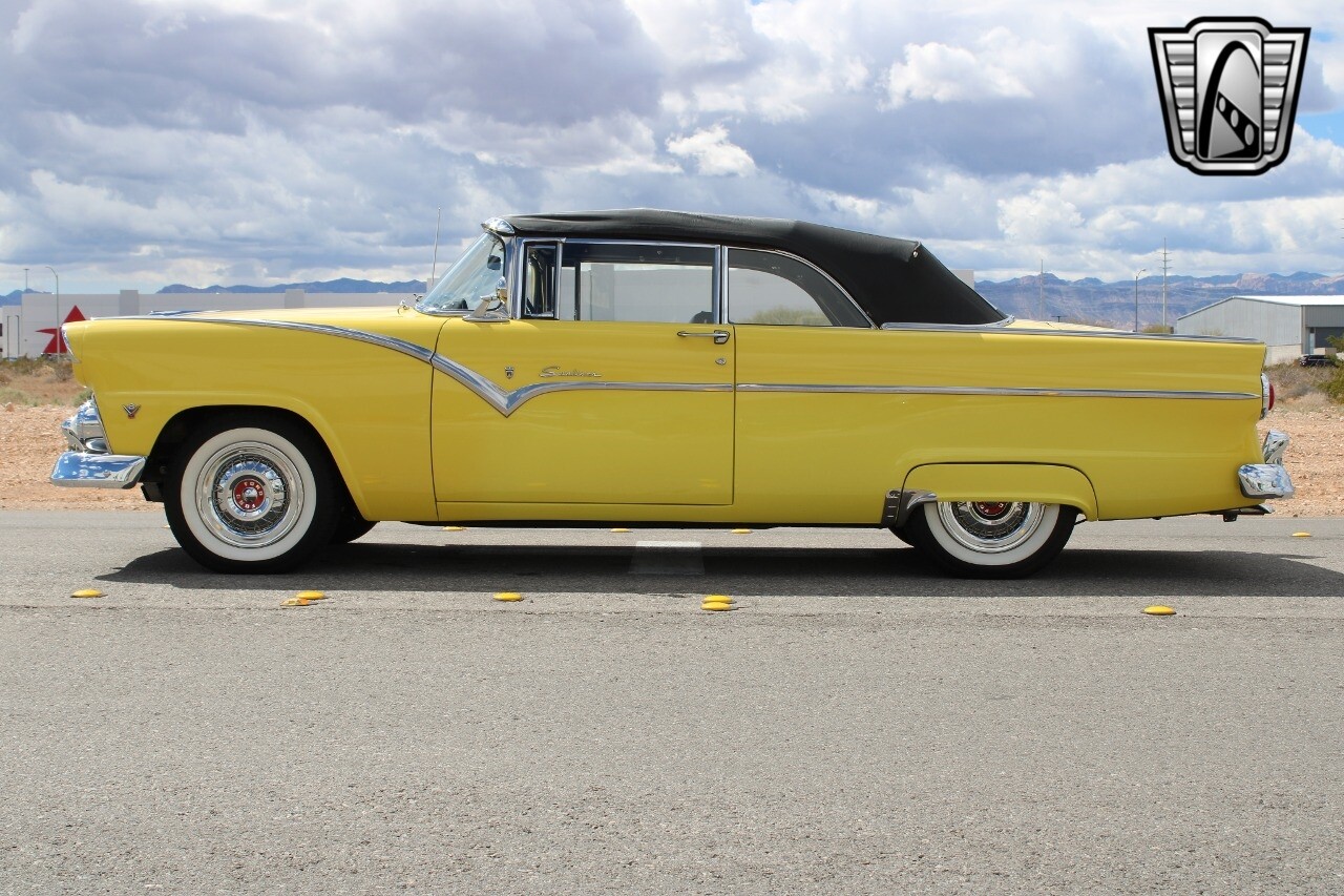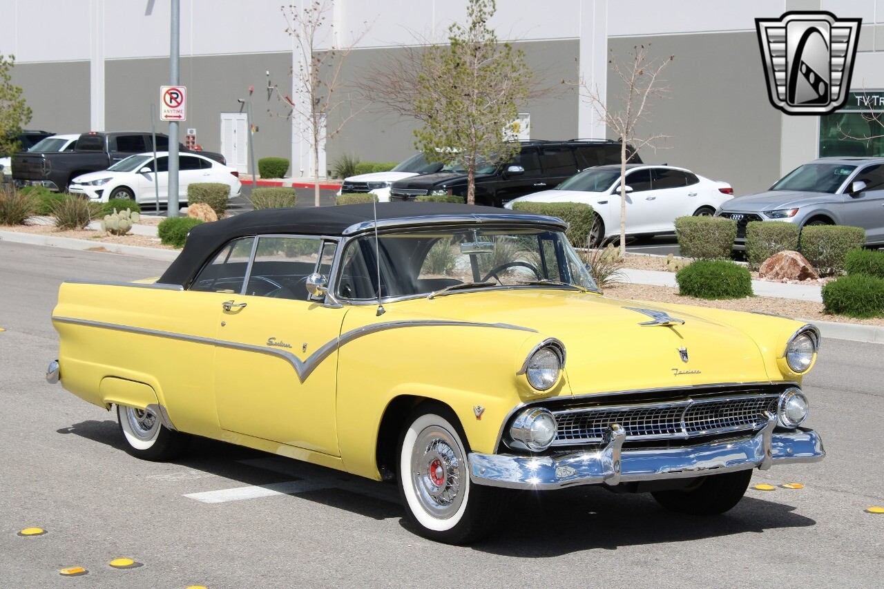 In summary, this 1955 Ford Fairlane Sunliner is a blend of classic design and modern features. Its vibrant yellow exterior, powerful V8 engine, automatic transmission, and safety features make it a desirable choice for vintage car lovers. The black and yellow vinyl interior and white wall tires add to its charm, making it a car that truly stands out from the crowd..