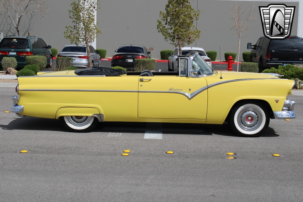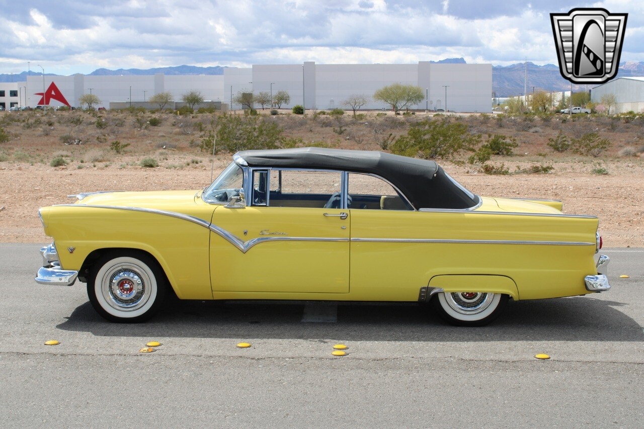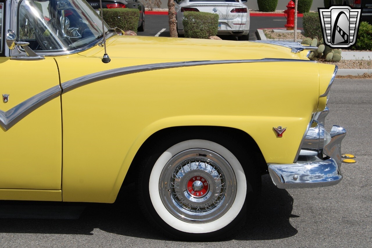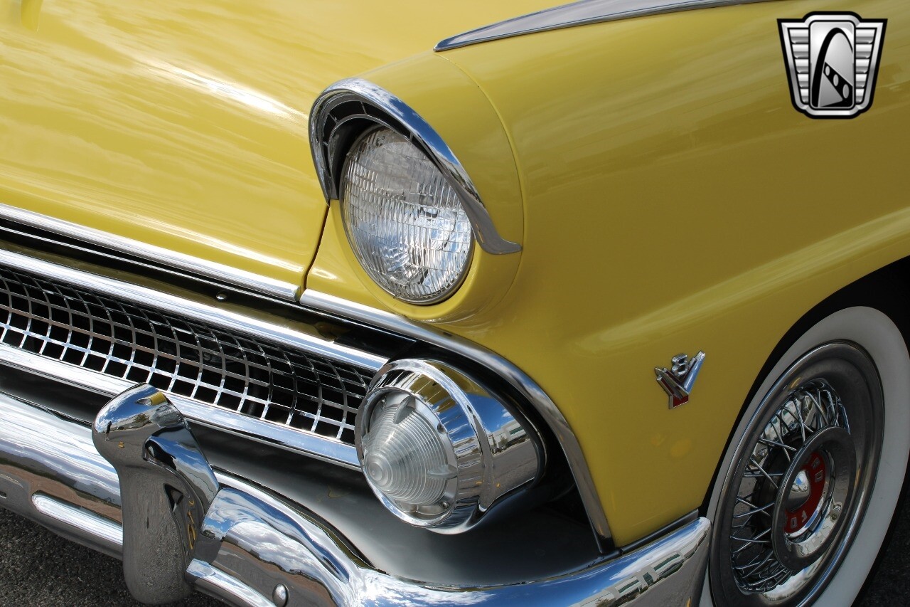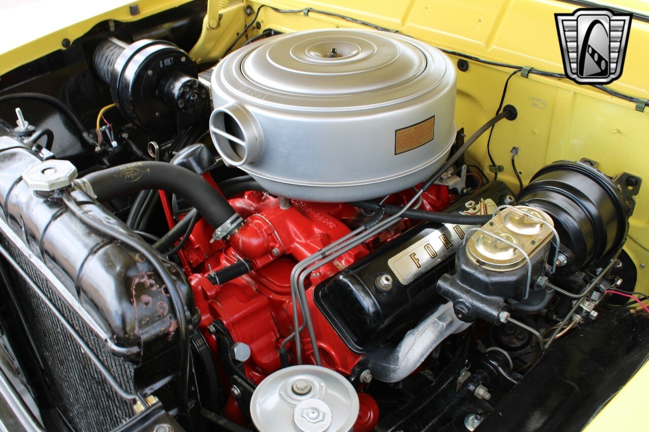 In summary, this 1955 Ford Fairlane Sunliner is a blend of classic design and modern features. Its vibrant yellow exterior, powerful V8 engine, automatic transmission, and safety features make it a desirable choice for vintage car lovers. The black and yellow vinyl interior and white wall tires add to its charm, making it a car that truly stands out from the crowd..