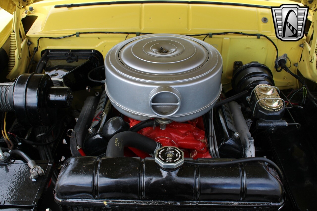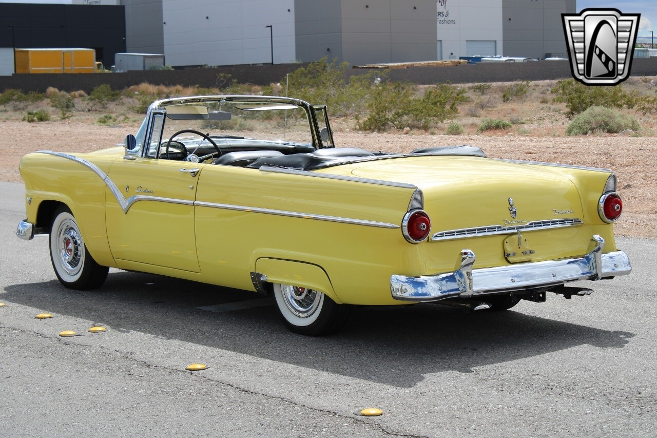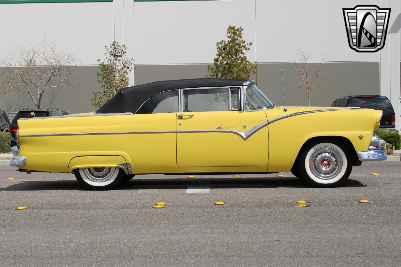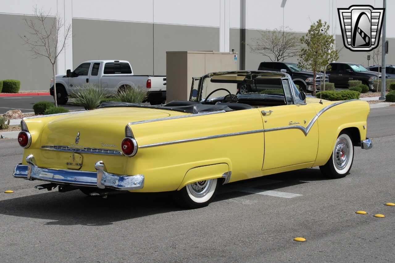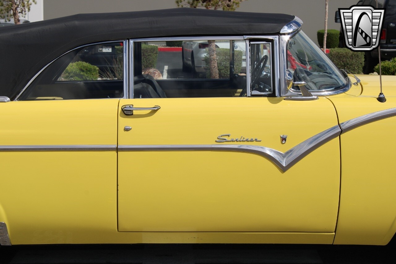 In summary, this 1955 Ford Fairlane Sunliner is a blend of classic design and modern features. Its vibrant yellow exterior, powerful V8 engine, automatic transmission, and safety features make it a desirable choice for vintage car lovers. The black and yellow vinyl interior and white wall tires add to its charm, making it a car that truly stands out from the crowd..