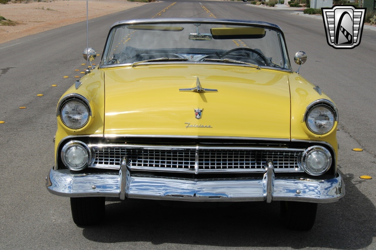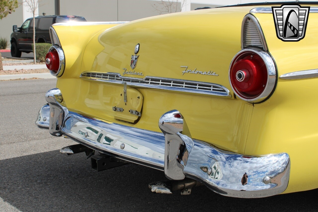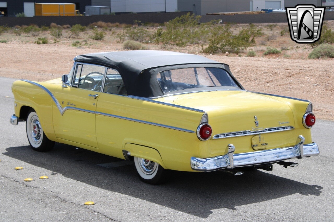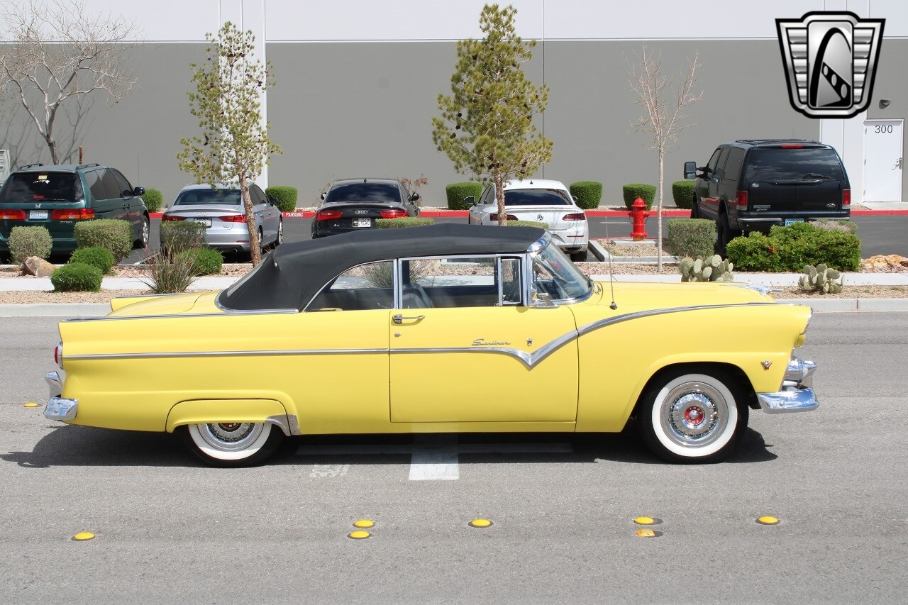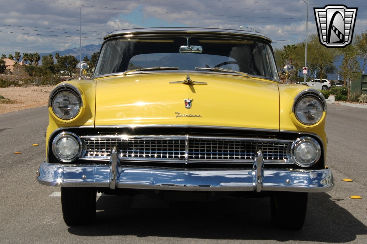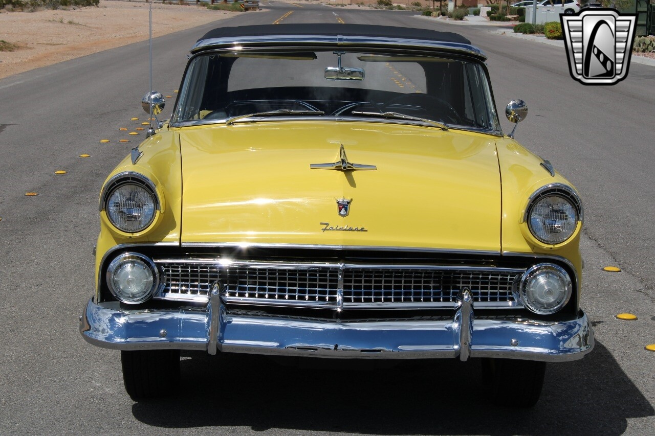 In summary, this 1955 Ford Fairlane Sunliner is a blend of classic design and modern features. Its vibrant yellow exterior, powerful V8 engine, automatic transmission, and safety features make it a desirable choice for vintage car lovers. The black and yellow vinyl interior and white wall tires add to its charm, making it a car that truly stands out from the crowd..