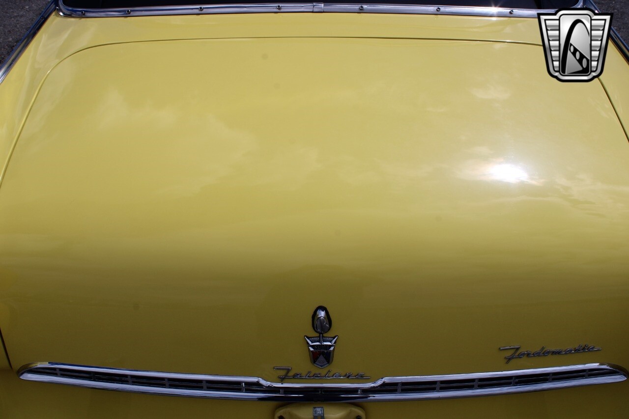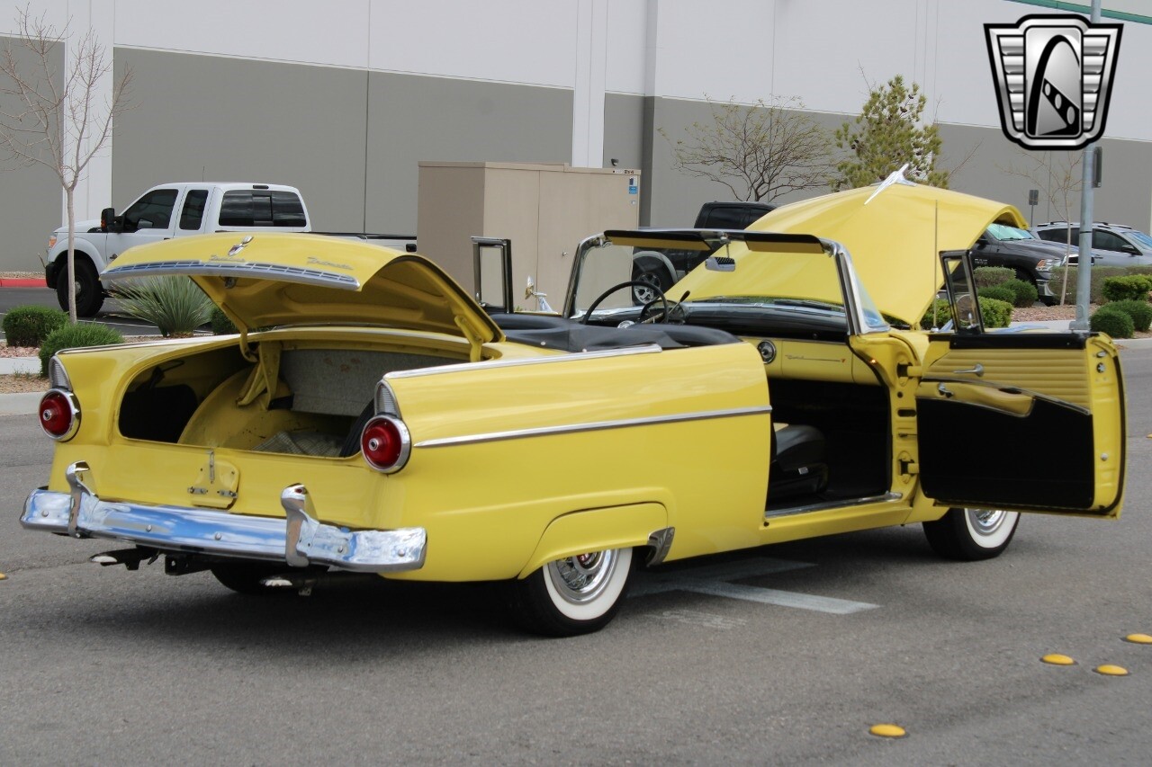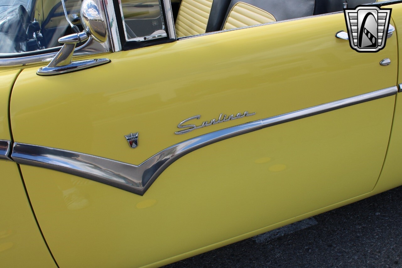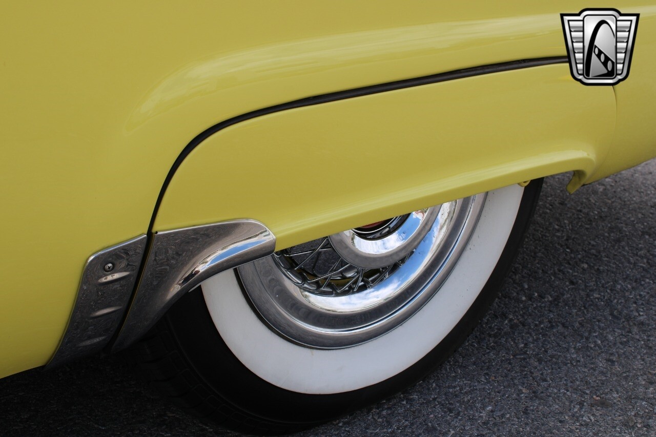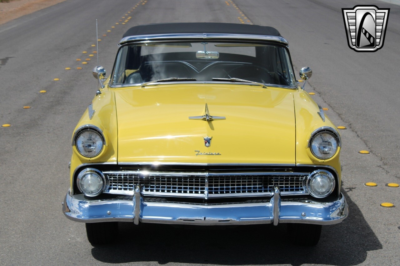 In summary, this 1955 Ford Fairlane Sunliner is a blend of classic design and modern features. Its vibrant yellow exterior, powerful V8 engine, automatic transmission, and safety features make it a desirable choice for vintage car lovers. The black and yellow vinyl interior and white wall tires add to its charm, making it a car that truly stands out from the crowd..