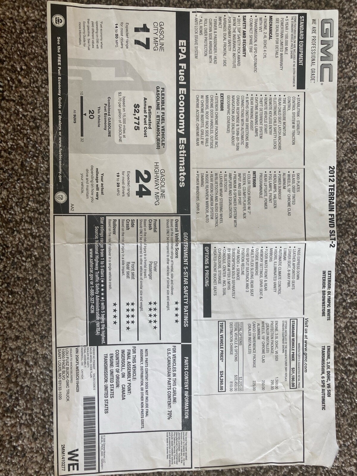 About this vehicle This 2012 GMC Terrain SLT is an original. This is offered for sale by the original owner. The vehicle runs great and is used as a daily driver. New tires, full synthetic oil changes every 6000 miles with none missed. Daily driver well cared for, purchased new. Vehicle Details 2012 GMC Terrain SLT-2 4D Sport Utility 3.0 V6 Exterior Color: White - Interior Color Brownstone Leather. Listed over $35,000 new in 2012.Vehicle Details
